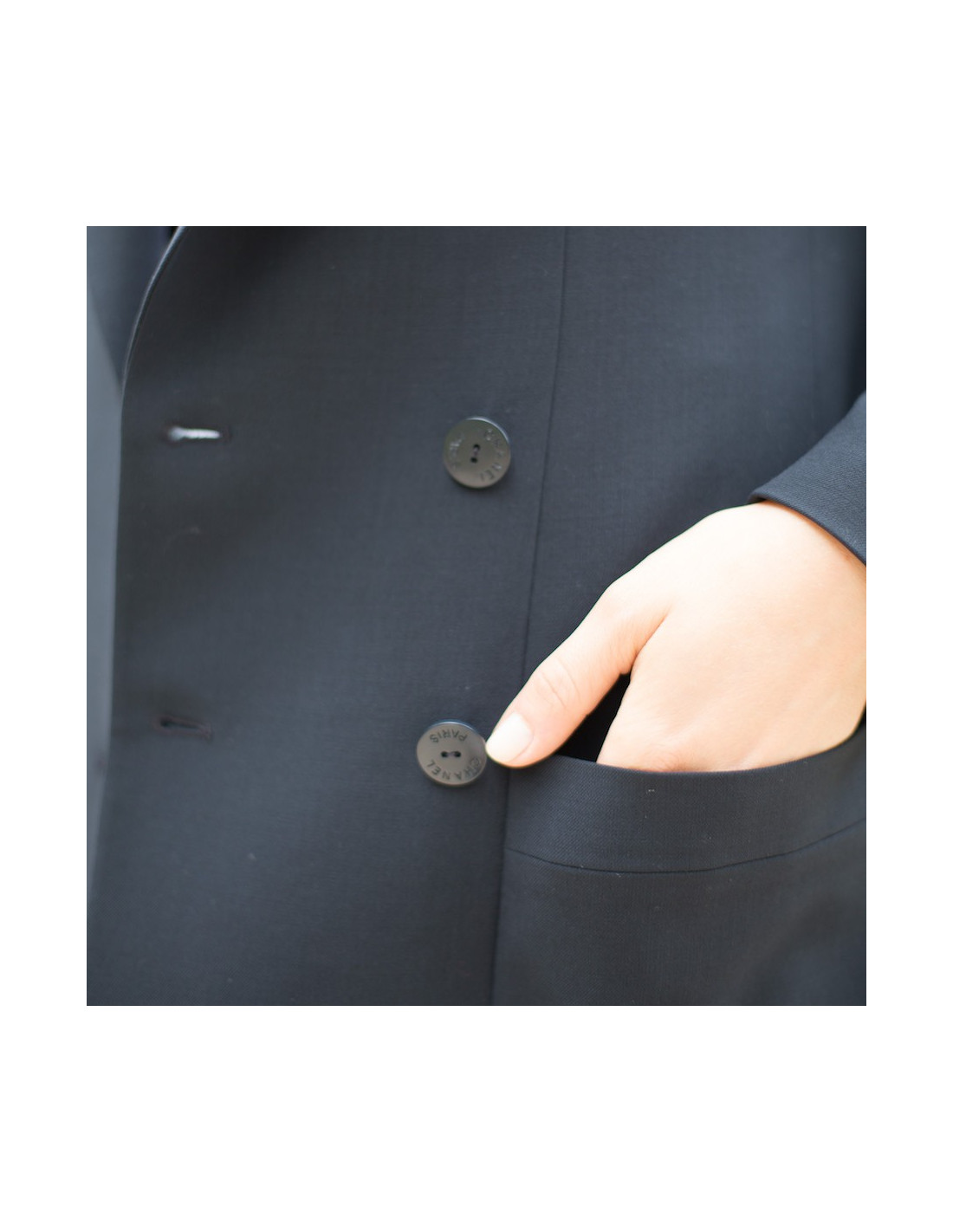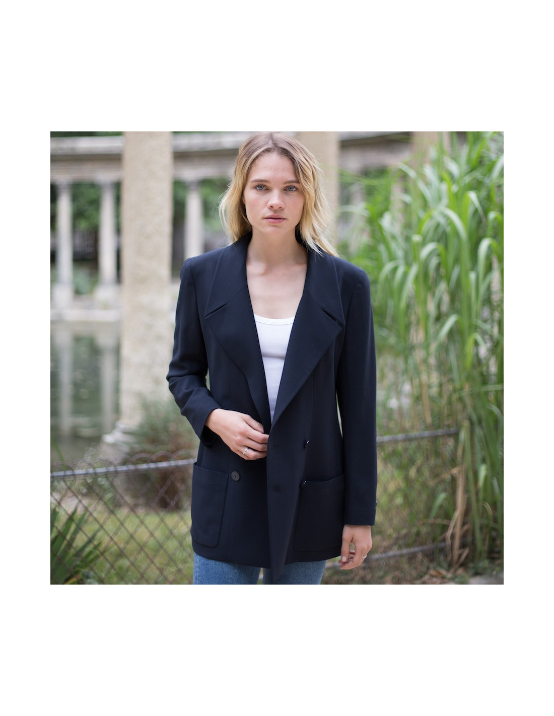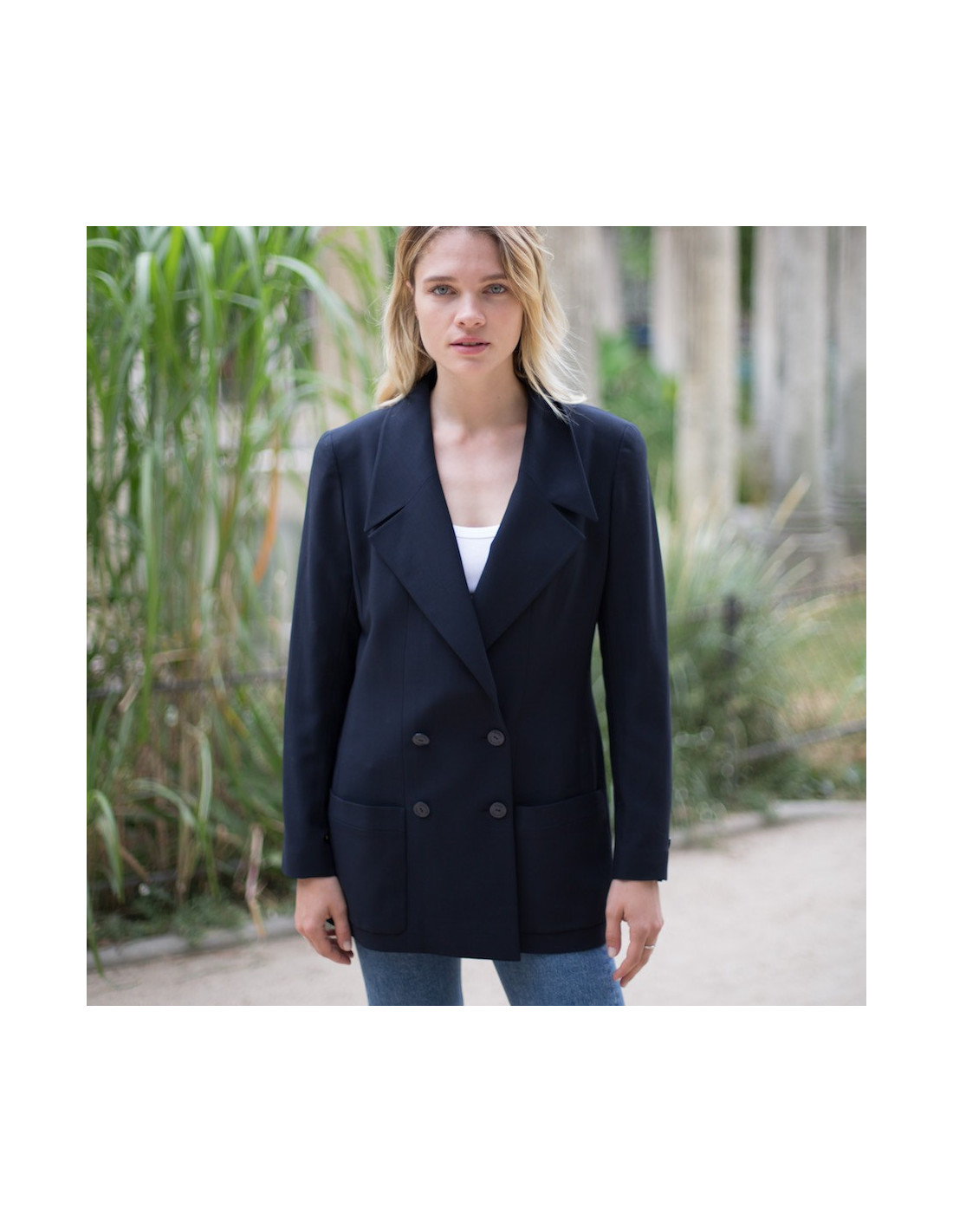 Incontournable. Blazer croisé par 4 boutons bleu nuit de la Maison CHANEL en parfait état. Un classique à avoir dans sa garde robe! Avec sa coupe oversize, porté sur un jean et une chemise blanche, T shirt avec ou sans escarpins, cette veste apportera un côté chic.