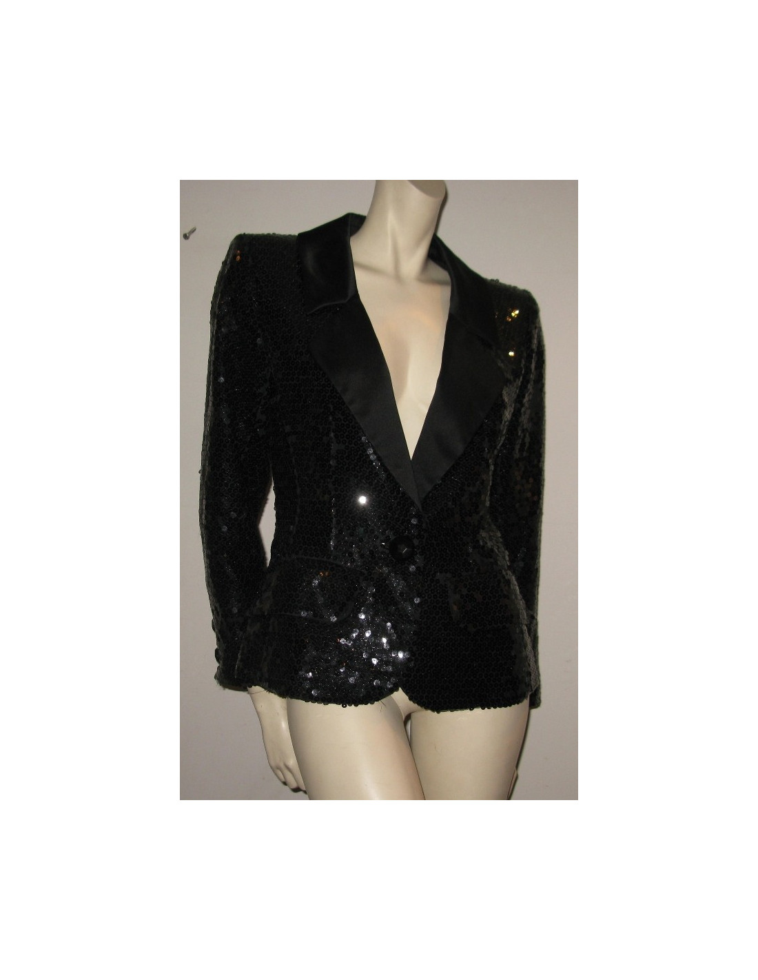 Magnifique veste vintage à sequins noirs t40 yves saint laurent rive gauche.-col soie noire-fermeture 1 bouton-2 poches à rabats -3 boutons sur chaque manche -sequins manquant à plusieurs endroits (épaule, poches...)