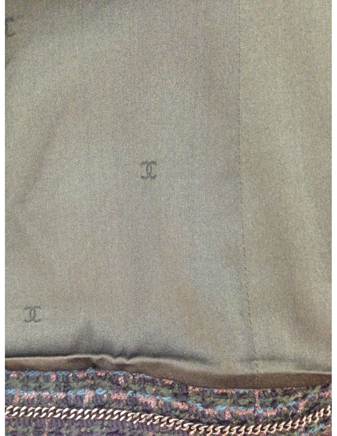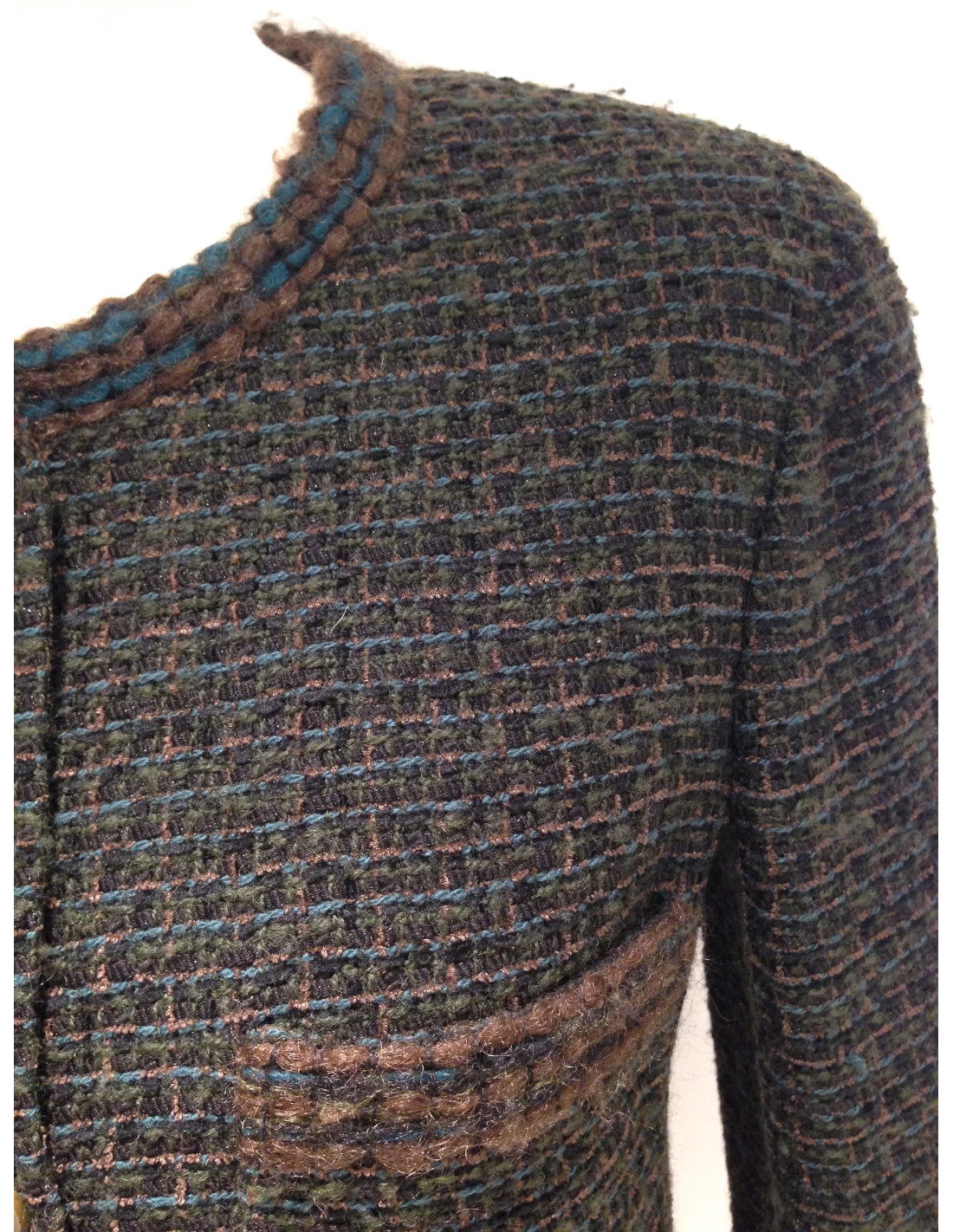Magnifique veste CHANEL datant de 1998, en tweed vert foncé, bleu canard et marron, ornementée de boutons en bronze gravés du sigle CHANEL. La veste présente deux poches hautes et cinq boutons. Les manches sont retroussables sur 10 cm. La doublure en soie verte, en parfait état, est brodée du sigle CC à divers endroits. A l'intérieur, une jolie chaîne gourmette de couleur bronze orne le bas de la veste.