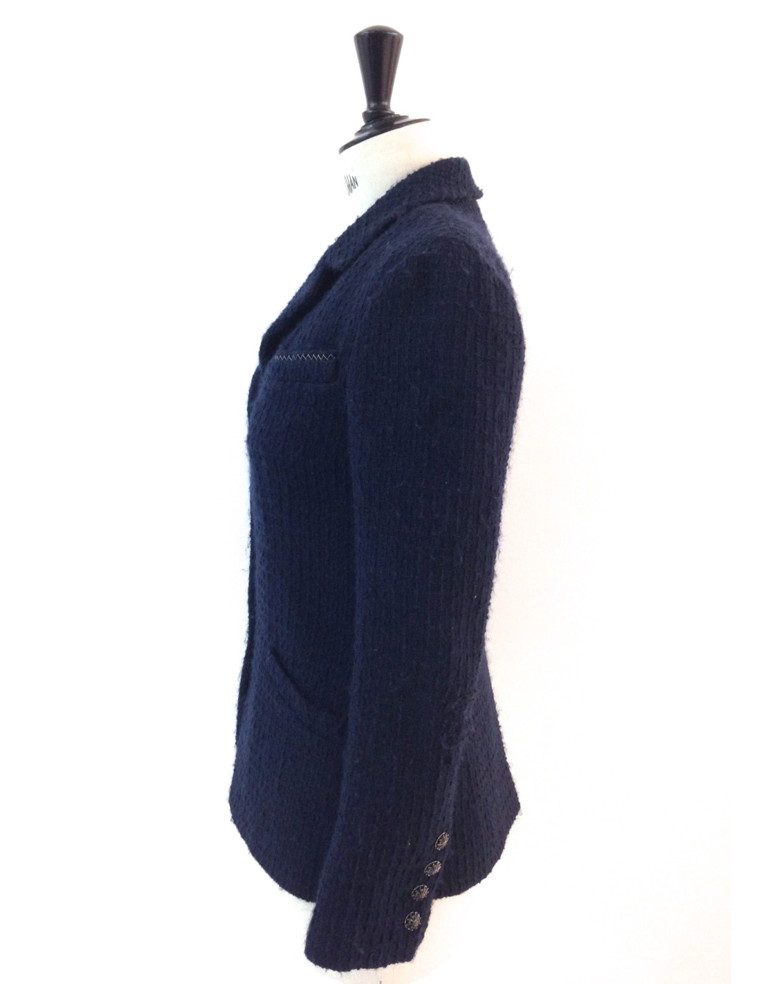 Veste CHANEL en tweed bleu marine, taille 38, de la collection Automne-Hiver 2008. Cette veste en 100% laine, incrustée de fils de cachemire, dispose de deux poches basses, ainsi que d'une petite poche au niveau de la poitrine. La veste se ferme à l'aide de trois boutons larges gravés de la croix de malte et de sigle CC et de petits détails en argent. Le tissu fendu sur les manches donne à la veste un look destroy. La doublure en soie bleue marine est brodée du sigle CC, de motifs fleuris, et d'inscriptions "CHANEL RUE CAMBON". En bas au dos une fente de 23 cm de hauteur, apporte un confort.