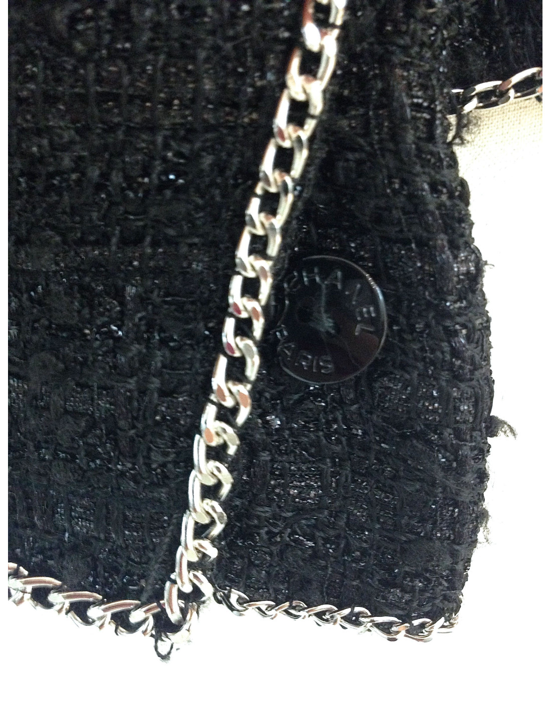 Veste CHANEL en tweed noir, taille 44, de la collection Printemps-Eté 2006. La doublure en soie est en parfait état. De petits crochets permettent de fermer la veste au niveau de la poitrine. La veste dispose de deux grandes poches basses et d'une petite poche haute. La veste est ornée de chaînes argent, classiques de la maison CHANEL (poches, col, et couture dorsale). Alternance de fils noirs mats et irisés.