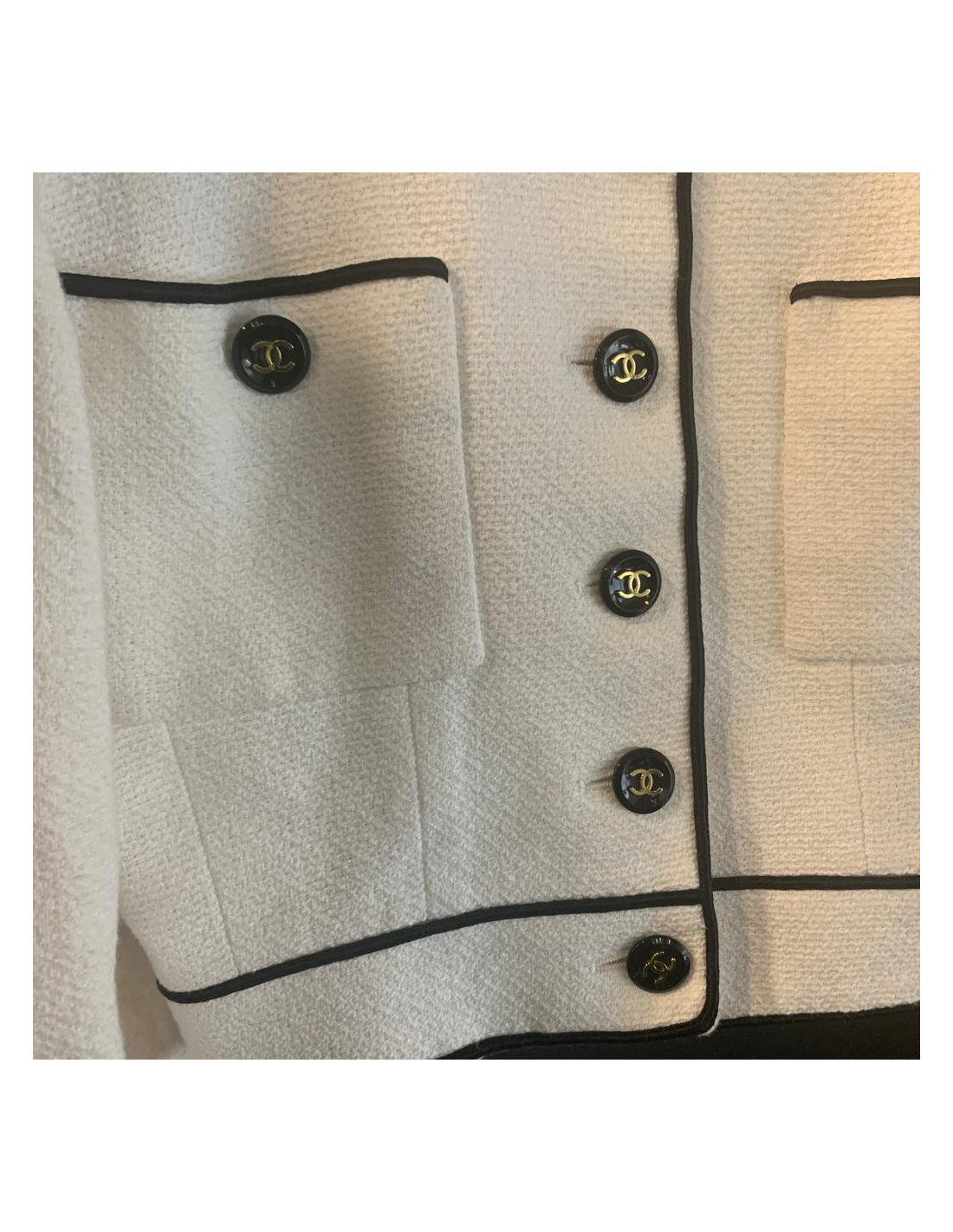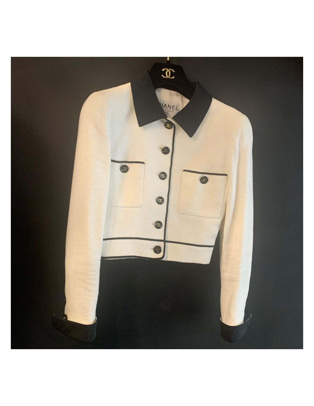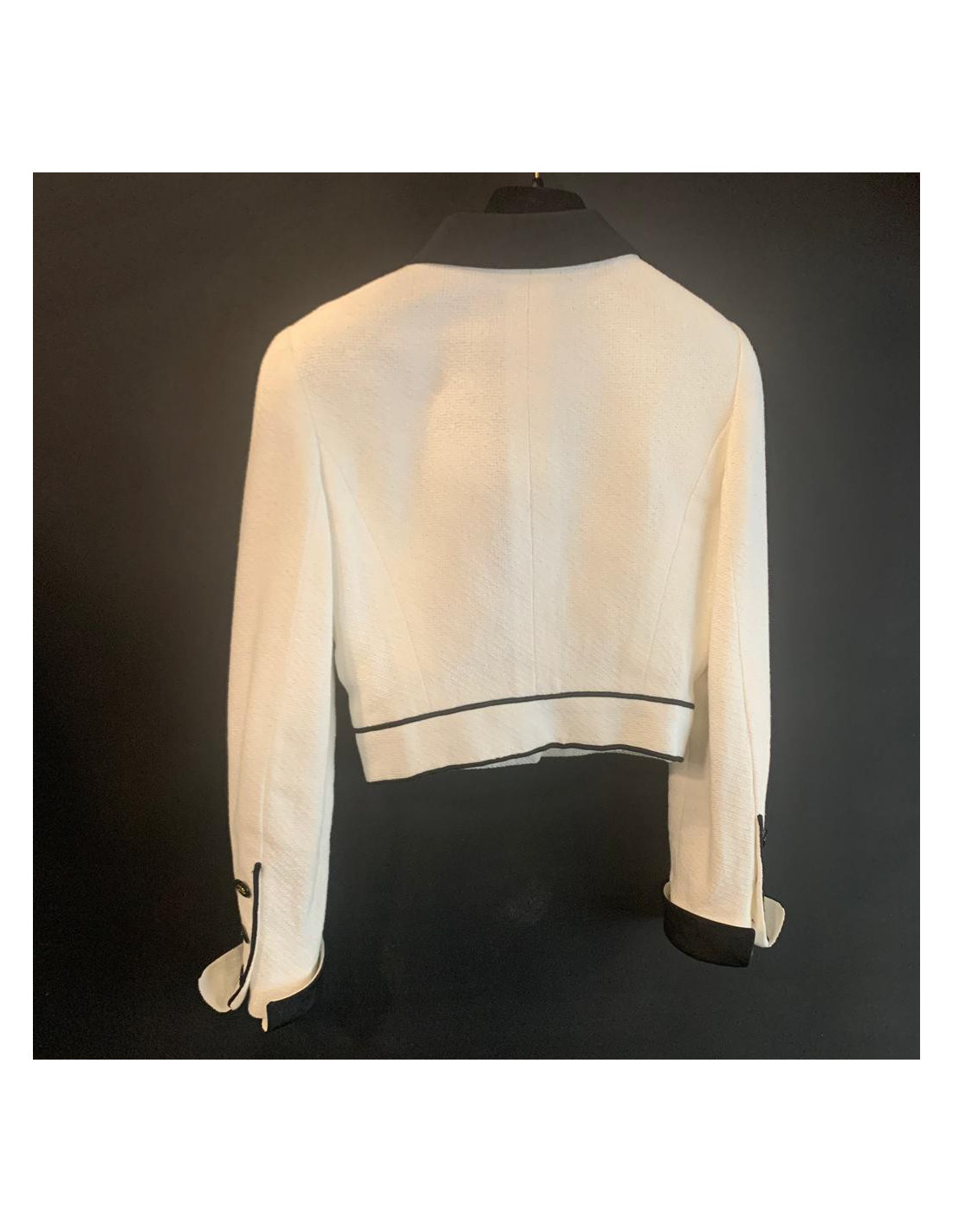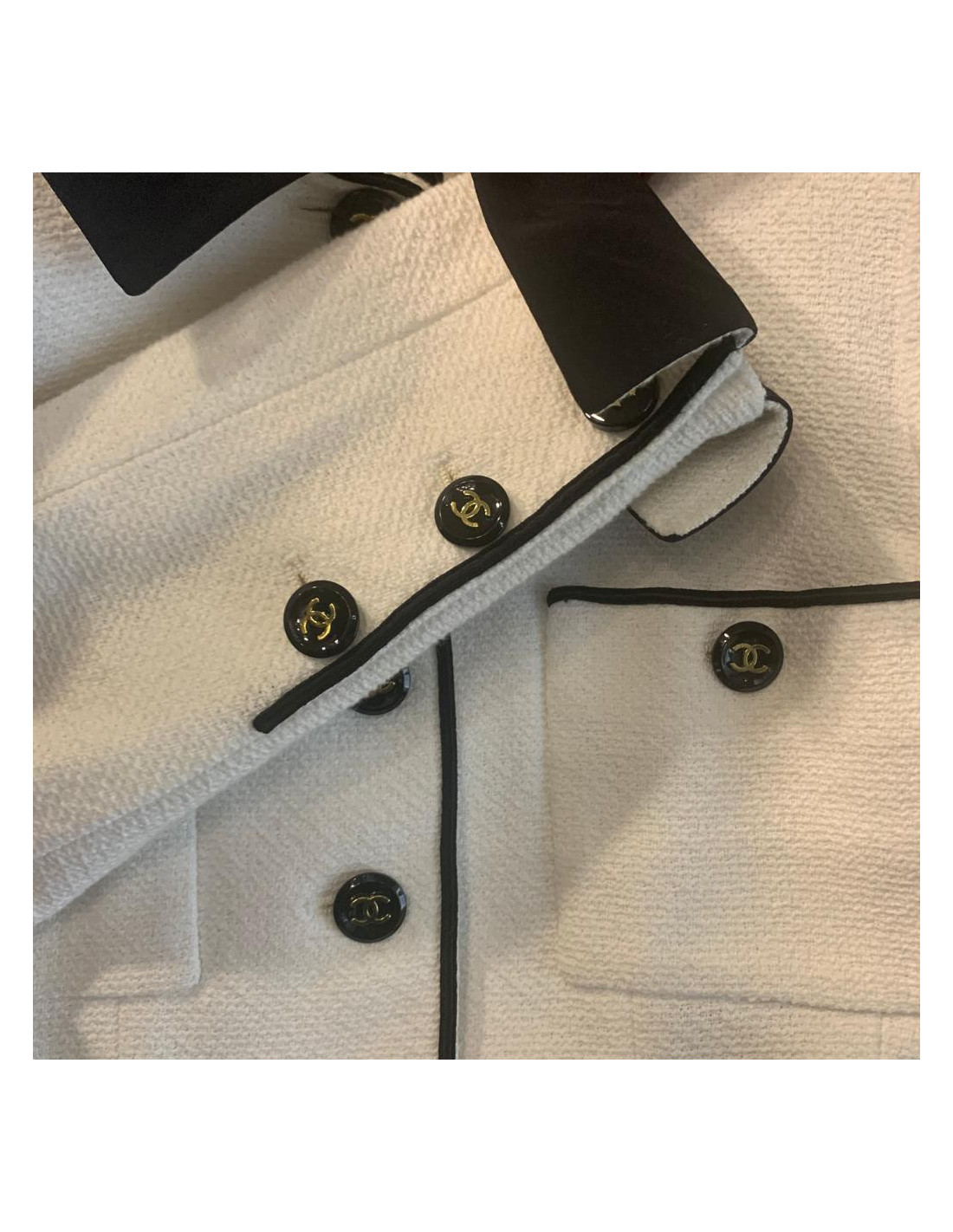Cette veste a des épaules rehaussées par des épaulettes, elle est cintrée à la taille et fermée par de jolis boutons siglés "CC". Le col, les poignées et la doublure sont en satin noir.