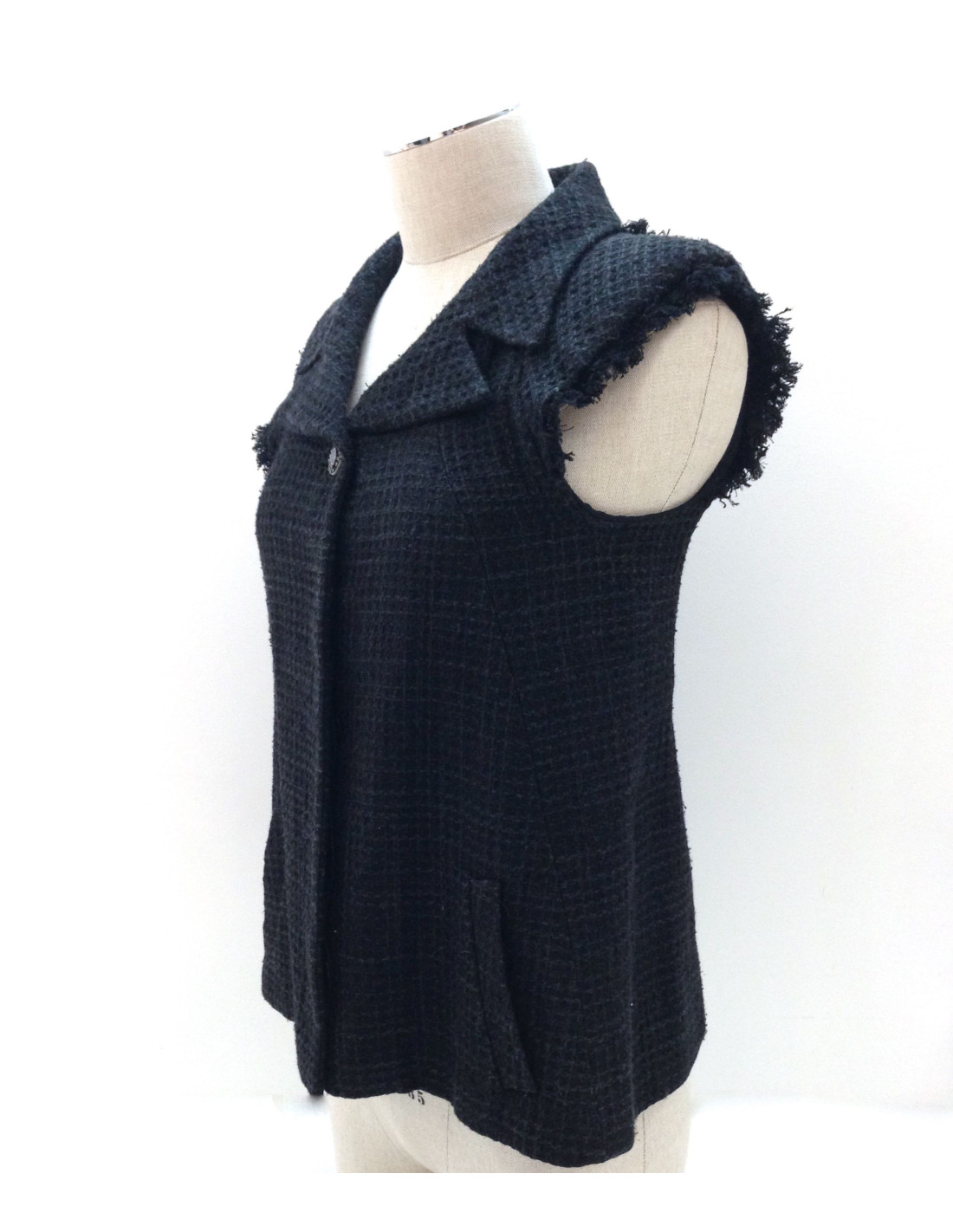 Veste CHANEL sans manches en tweed noir. L'étiquette a éré retiré par la cliente, cependant il s'agit d'une taille 38. Veste à épaulettes, et emmanchures en tweed frangé. La doublure en soie noire, en parfait état, est brodée de dessins camélias et d'inscriptions "Chanel rue Cambon". Deux petites poches basses verticales. La veste se ferme par cinq boutons, dont quatre de nacre noire siglés "Chanel Paris", et un bouton argent en forme d'écusson siglé CC et entouré de petits strass noirs.
