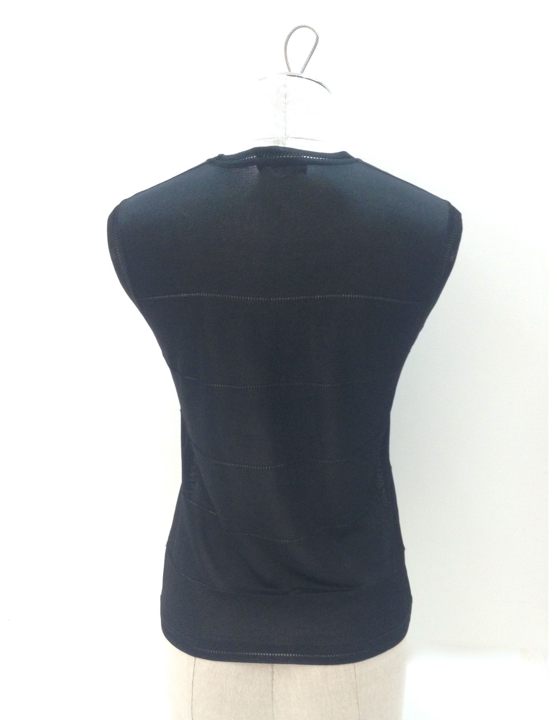Twinset CHANEL noir, gilet et top sans manches, taille 36. Joli ensemble col rond en maille noire avec de délicates coutures ajourées. Petit sigle CC noir brodé sur le débardeur. Boutons de nacre noire siglés CC en ton sur ton. Quelques accrocs sur le tissu, et fils tirés à deux endroits sur la manche gauche.