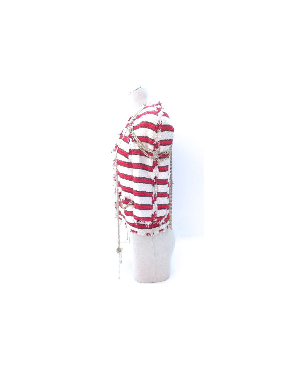 Veste CHANEL, taille 36, collection Printemps-Eté 2008. Pièce EXCEPTIONNELLE. Cette magnifique pièce de collection est une veste en tweed écru, à rayures rouge et or mat. Couture frangées. Epaulettes intérieures. Doublure 100% soie, en très bon état, siglée "Chanel" et brodée de dessins camélias. Manches 3/4. Deux petites poches basses agrémentées de sublimes chaînes en métal doré et de boutons en relief en forme de tête de lion et siglé CC. Groupe de cinq chaînes ornant les épaules et le dos. Au dos, deux groupes de chaînes et de pendentifs CC sont amovibles.