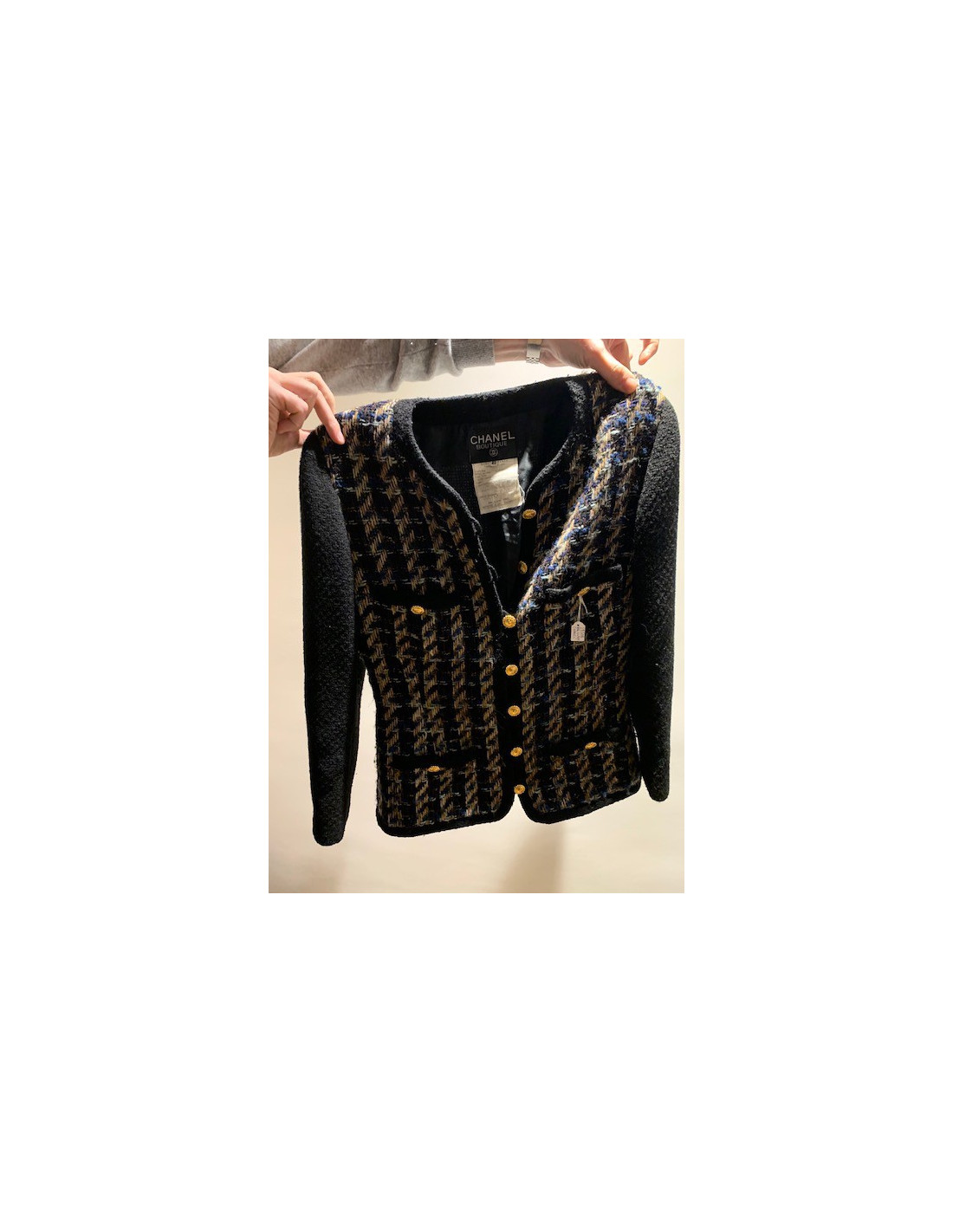 Vendu VESTES Veste tweed CHANEL T50 resort 2016 Seoul CHANEL 37389 4 900,00 € Veste tweed CHANEL T50 Resort 2016 Condition : très bon étatPays de fabrication : FranceCollection : Resort 2016 in SeoulMatière : tweedCouleur : beige, grisDoublure : soie griseTaille : 50FRDimensions : épaules 45 cm, sous la poitrine 55 cm, hauteur 70 cm, longueur des manches 54 cmAnnée : 2016Détails : manches 3/4, double rangée de magnifiques boutons... Voir