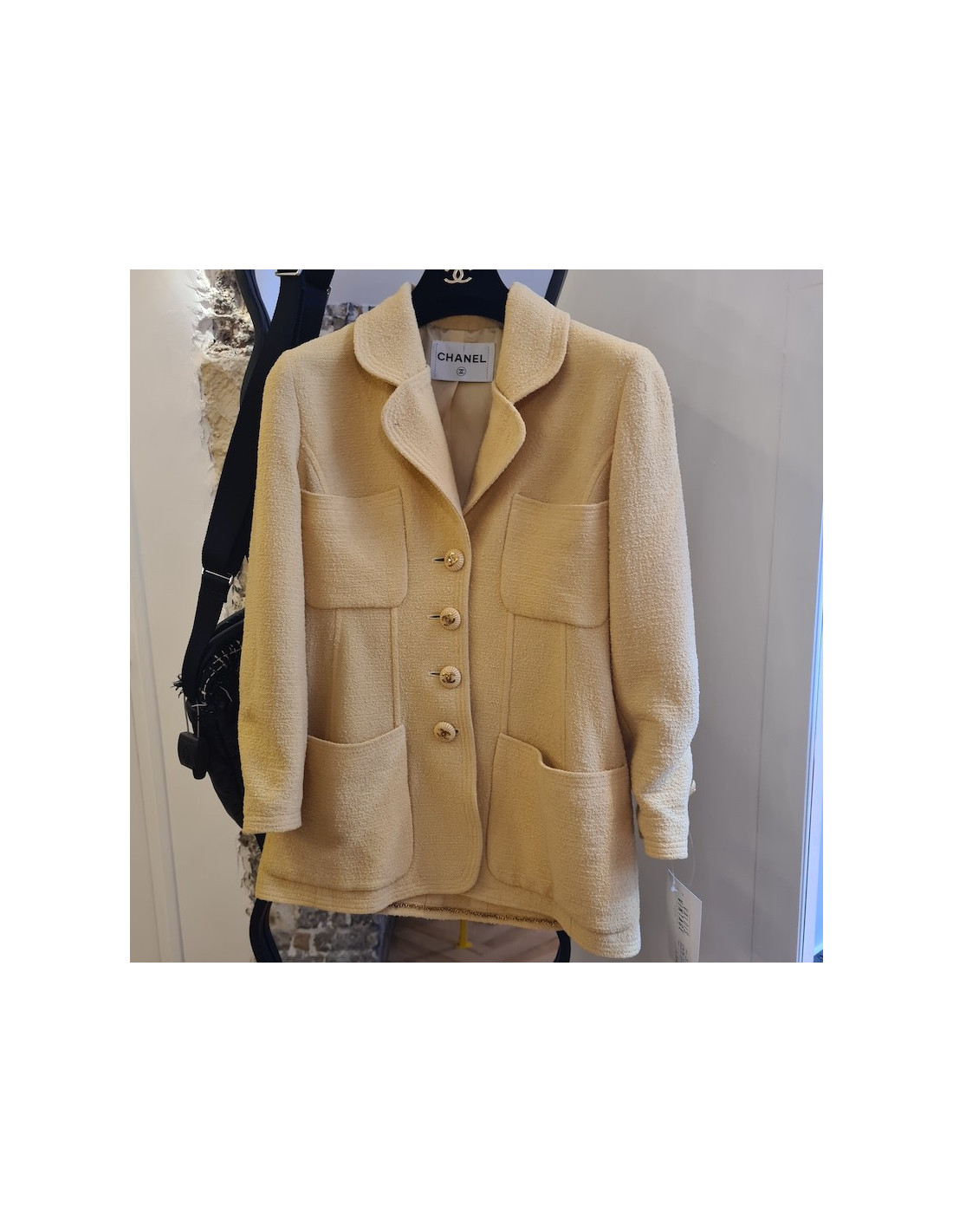Nouveau Derniers articles en stock VESTES Veste smoking Chanel T50 noire CHANEL 40961 5 500,00 € Veste smoking Chanel T50 noire Condition : très bon étatPays de fabrication :FranceMatière : 100% laine, incrustations en polyesterIntérieur : doublure en soie noireModèle unisexeTaille : 50 FRCouleur : noirDimensions à plat : épaules : 50 cm, sous la poitrine : 60 cm, hauteur : 80 cm, longueur des manches : 65 cm, tour de poignet : 28 cmBijouterie :... Ajouter au panier