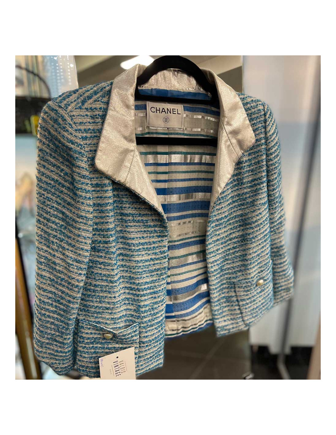 Derniers articles en stock VESTES Veste CHANEL T 36 en tweed bleu et revers blanc et noir CHANEL 26353 2 500,00 € Veste Chanel T36 en tweed bleu Condition : jamais portéePays de fabrication : FranceMatière : cotonCouleur : bleu noir et blancDimensions : 39 x 47 x 60 cm Ajouter au panier