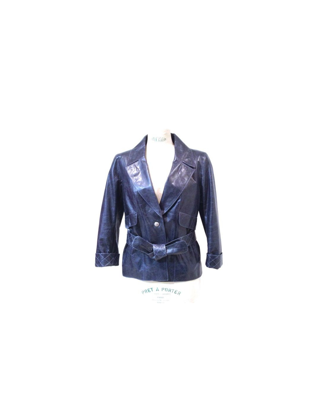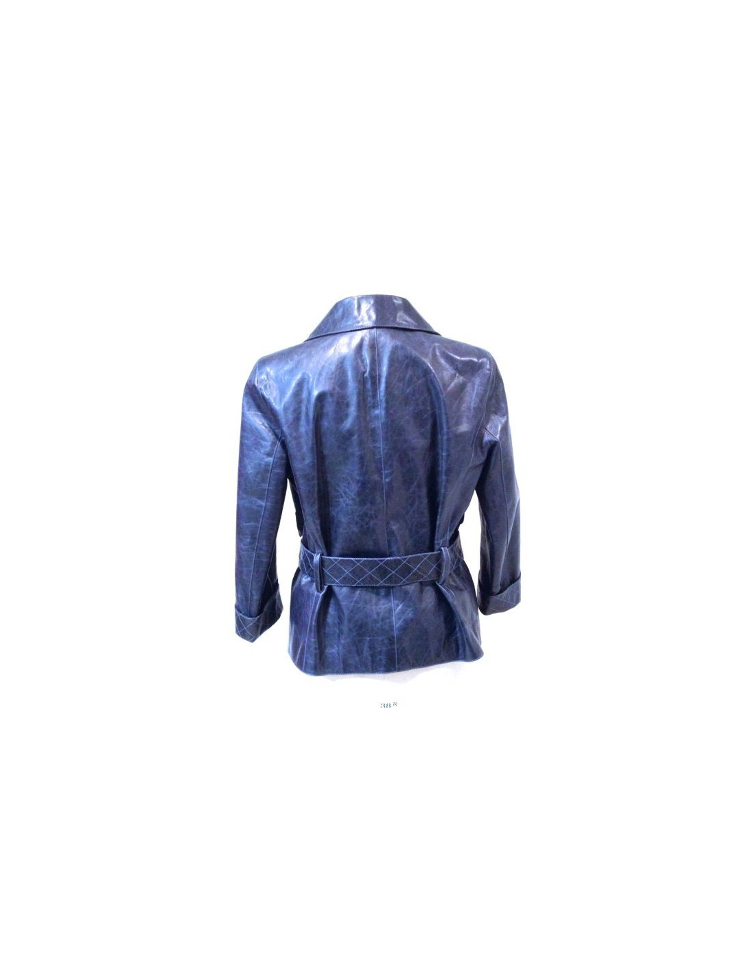 Veste CHANEL en cuir de veau bleu délavé. Les manches ont un joli revers matelassé. Deux grandes poches à rabat. Ceinture matelassée avec passants le dos. Doublure intérieure en soie imprimée noire et bleu. En très bon état.