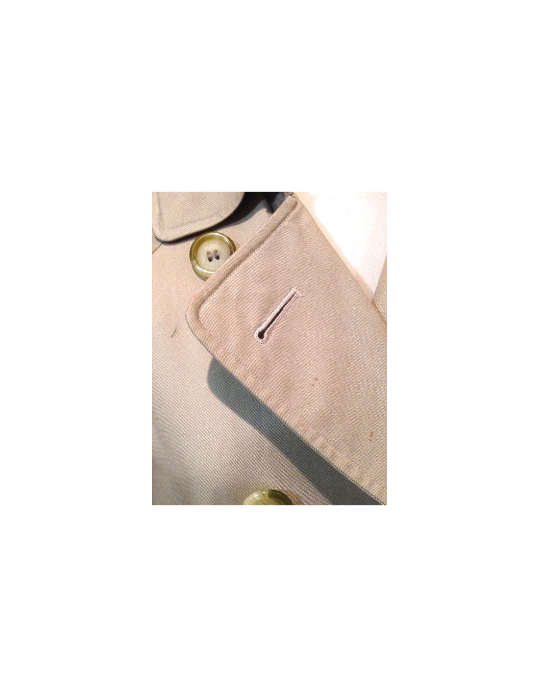 Trench BURBERRY beige, modèle classique et intemporel. Deux grands poches à boutons. Une ceinture avec boucle en cuir marron. Pattes boutonnées sur les épaules. Manches 3/4 avec sangles d'ajustement de la largeur. Tâches noires et marrons sur la manche droite. A faire nettoyer. Made in England.