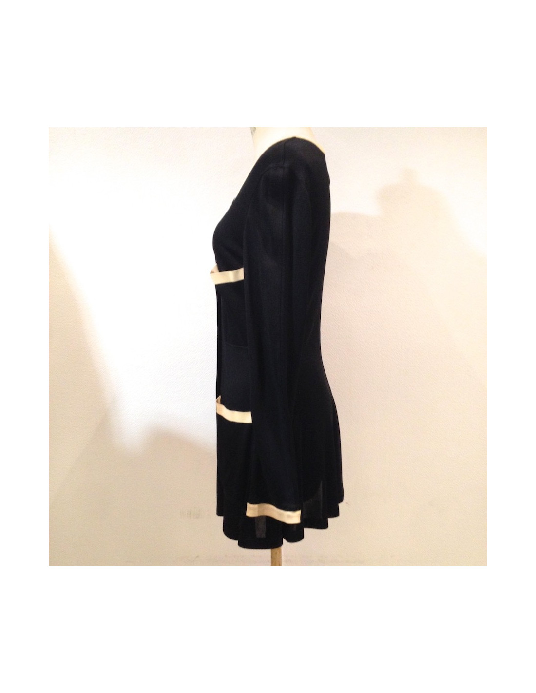 Ce gilet rappelle l'époque où Coco Chanel déclinait ses collections en noir et blanc très "DEAUVILLE" et se porte aussi en veste.
