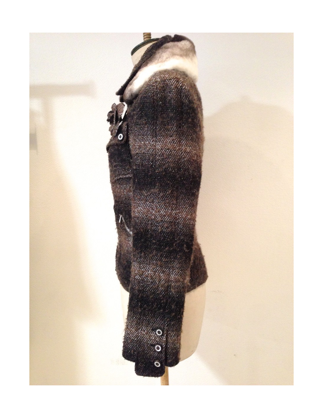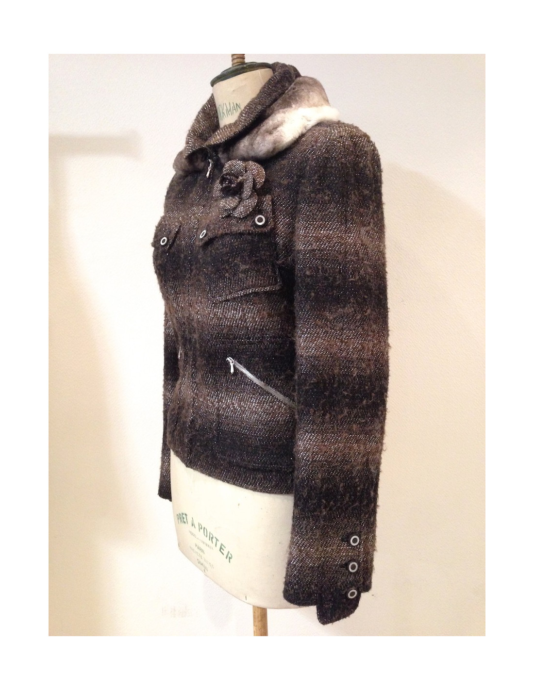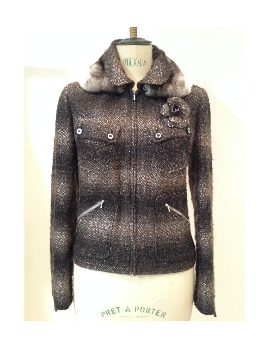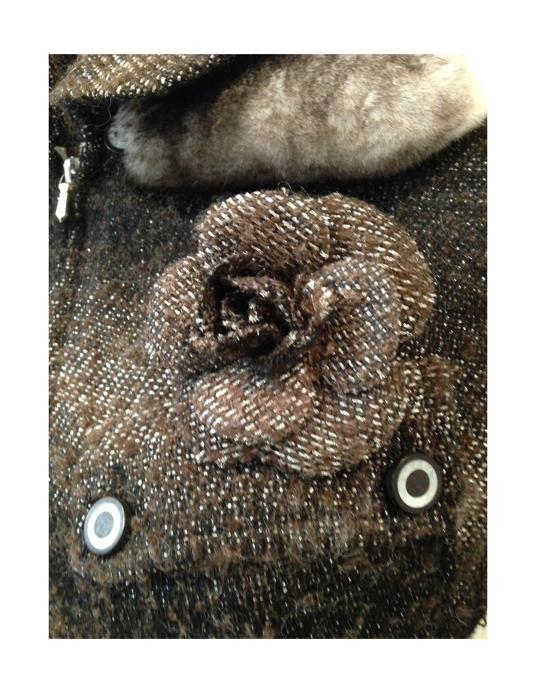 Veste CHANEL taille 38 (pas d'étiquette de taille), tweed lamé ( acrylique et coton) argent, marron et noir comportant des peluches . La doublure est 100 % soie monogrammée et se termine par la célèbre chaine argent.