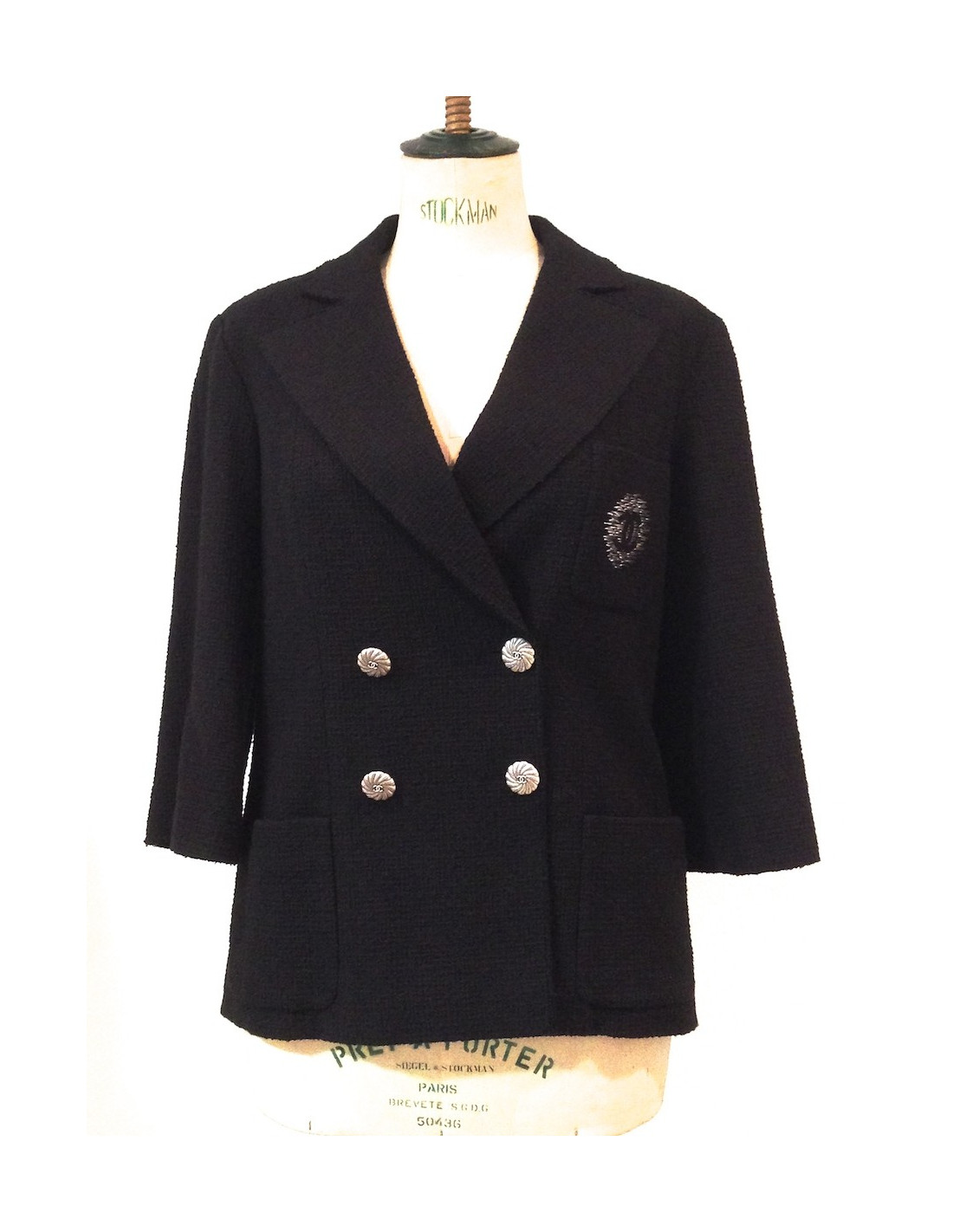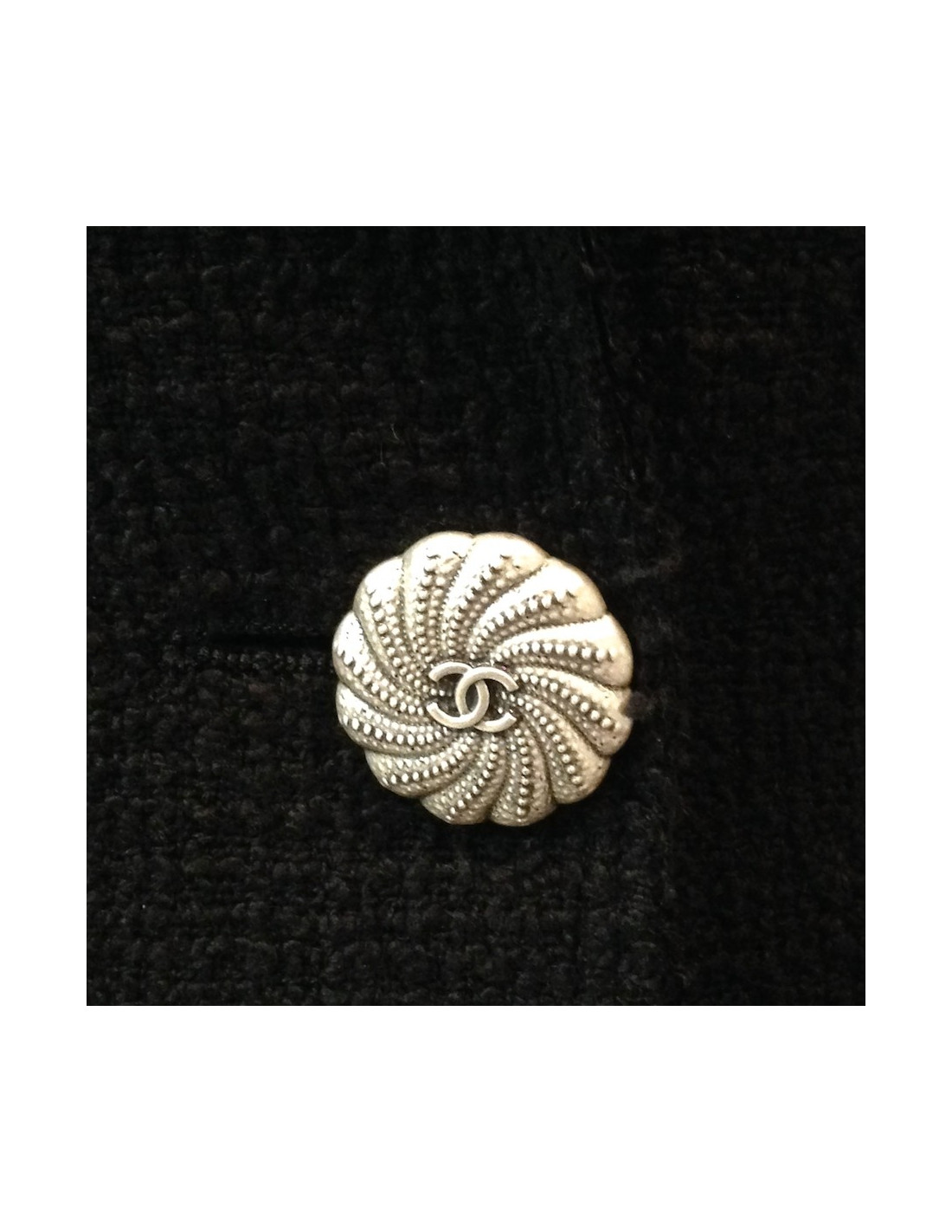 Elle est croisée avec double boutonnage couleur argent. Cet article est en très bon état, le symbole brodé de fil d'argent "CC" est sur la poche, ce qui lui apporte un certain chic. La doublure est en soie 100% siglée de camelias . Il y a une chaine argentée tout autour de la veste.