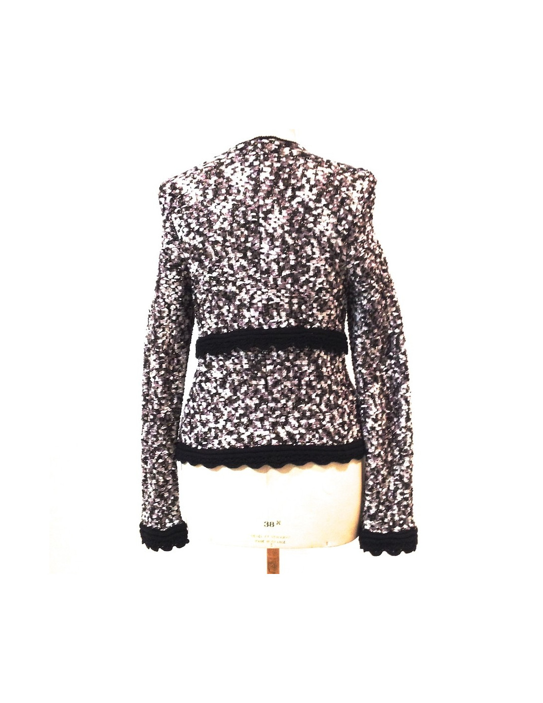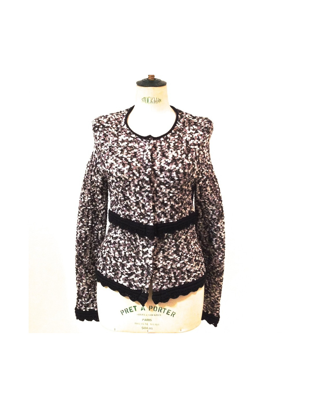 jolie veste à sequins (pas de taille mentionnée) taille 40 en lamé tricoté. Les bords sont en crochet noir. se porte aussi bien le jour qu'en soirée. les couleurs sont sobres : blanc beige rosé, noir