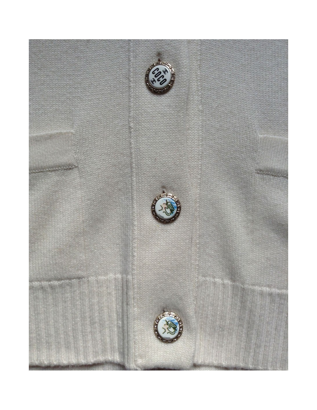 Somptueux Gilet Chanel à manches longues, de couleur écru, 100% Cachemire. Il s'agit d'une taille 34FR (mais il taille grand). Encolure en V, fermeture décoré par 5 ravissants boutons représentant un dessin du fameux camélia sur fond rose, du logo Coco et d'une jolie jeune femme au style "très mademoiselle Chanel". Il y a également 2 poches intégrées sur les côtés. Il a quelques taches et nécessiterait un passage au pressing.