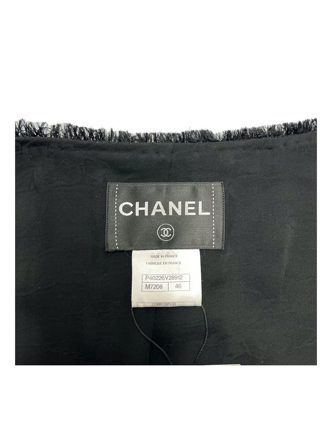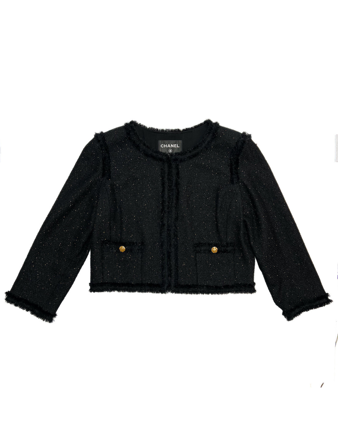Détails : Veste en excellent état en tweed noir, ornée de petites perles dorées. Elle possède une poche de chaque côté, ainsi qu'un bouton marqué CC. La fermeture se fait par un bouton crochet. La doublure en soie monogrammée noire est rehaussée d'une chaîne le long de l'intérieur. Les étiquettes de taille et de composition sont présentes.