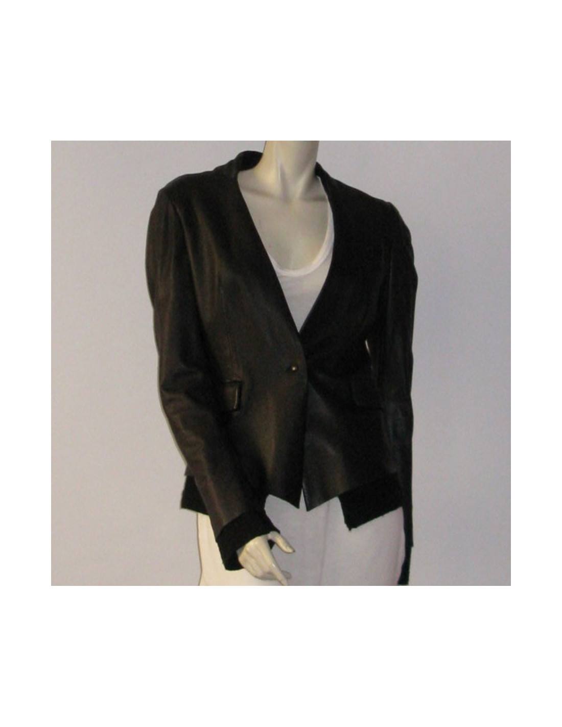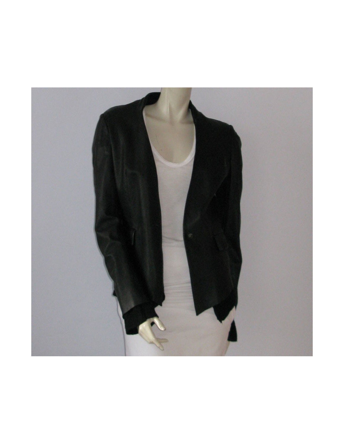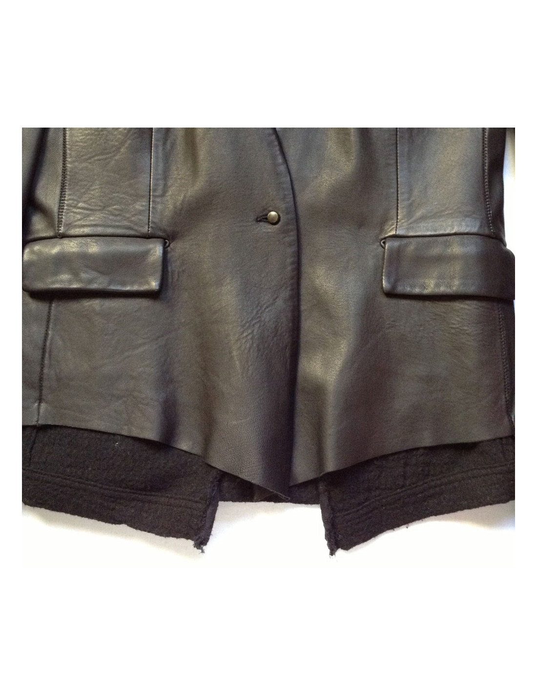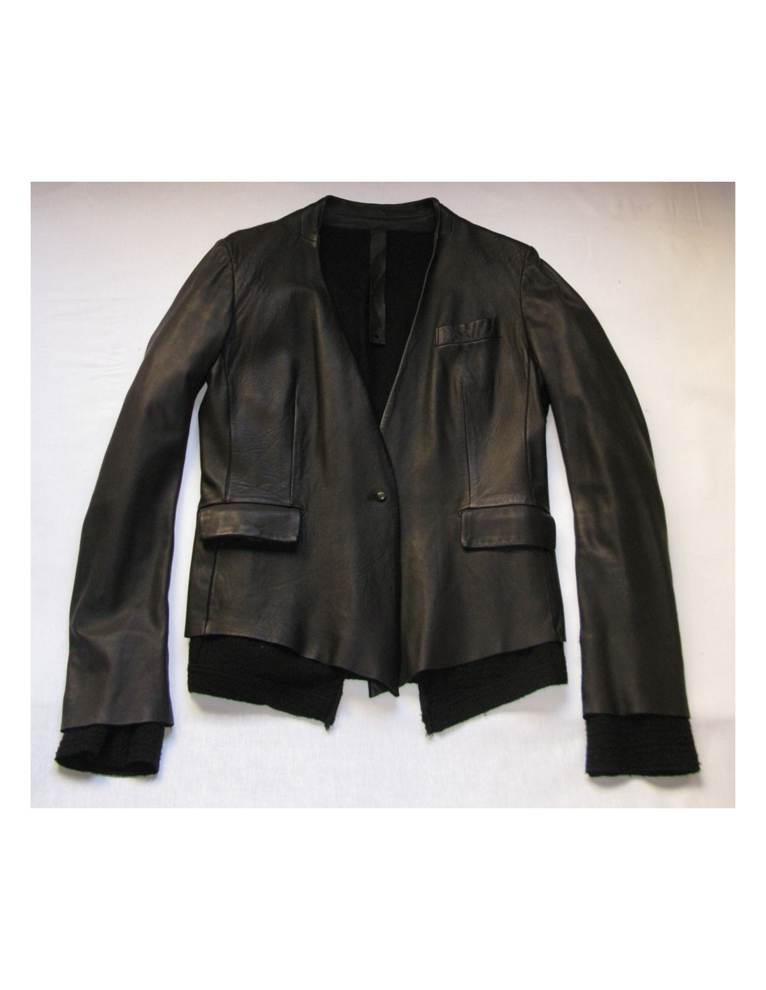 Very trendy! Veste ISAAC SELLAM T40FR bi-matière cuir et laine de couleur noire, ligne ajustée, manches longues avec poignets en laine ainsi que le bord du bas de la veste. Col V, 1 poche poitrine en biais, 2 poches à rabat au niveau des hanches. Fermeture 1 bouton à l'avant. Doublure en laine. 100% cuir, doublure des manches 100% viscose, doublure de la veste 100% wool.