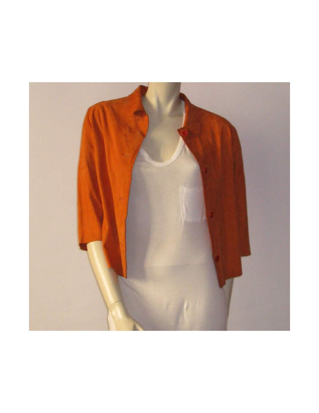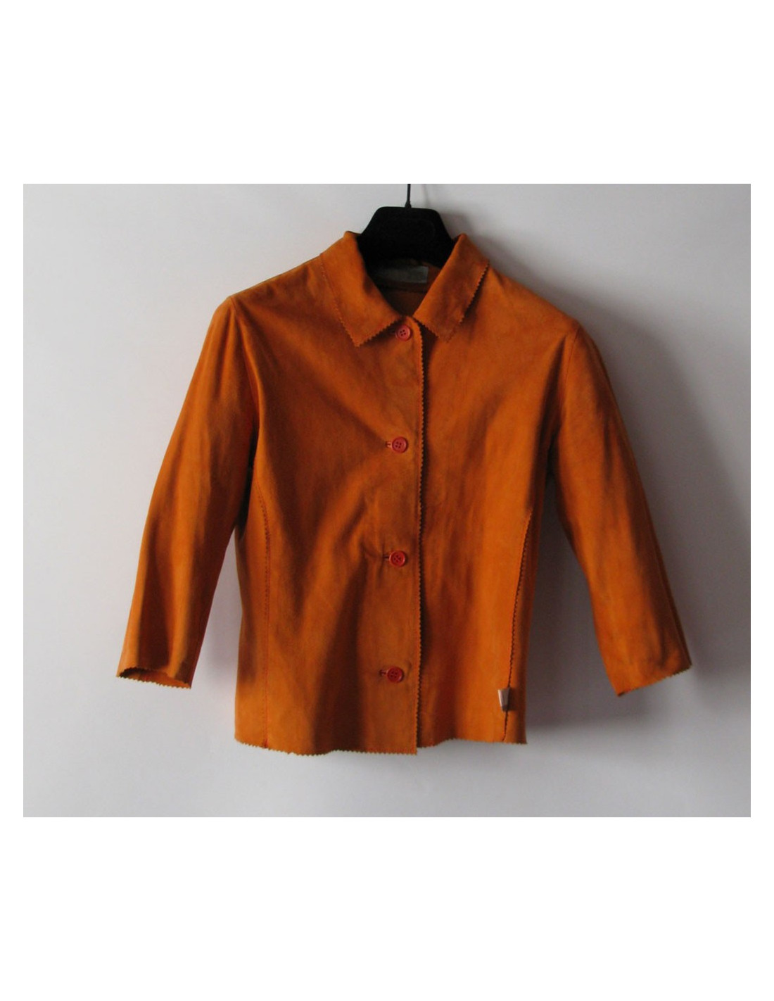 Petite veste MISSONI T38FR en daim, couleur tangerine, col chemise, manche 3/4, ligne ajustée.
