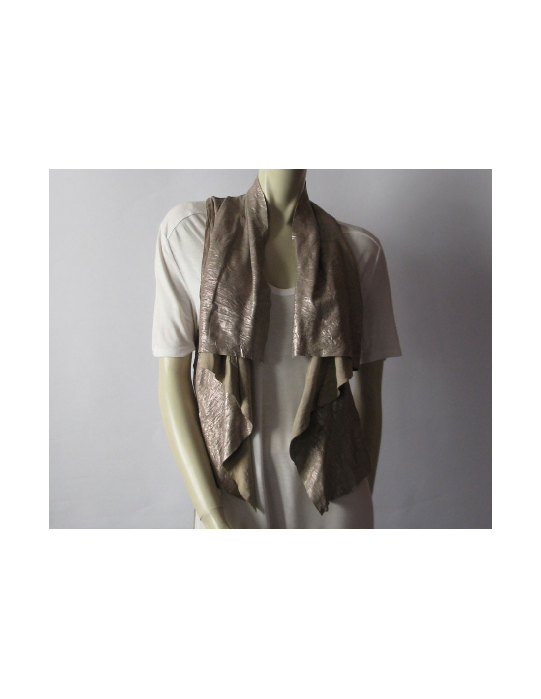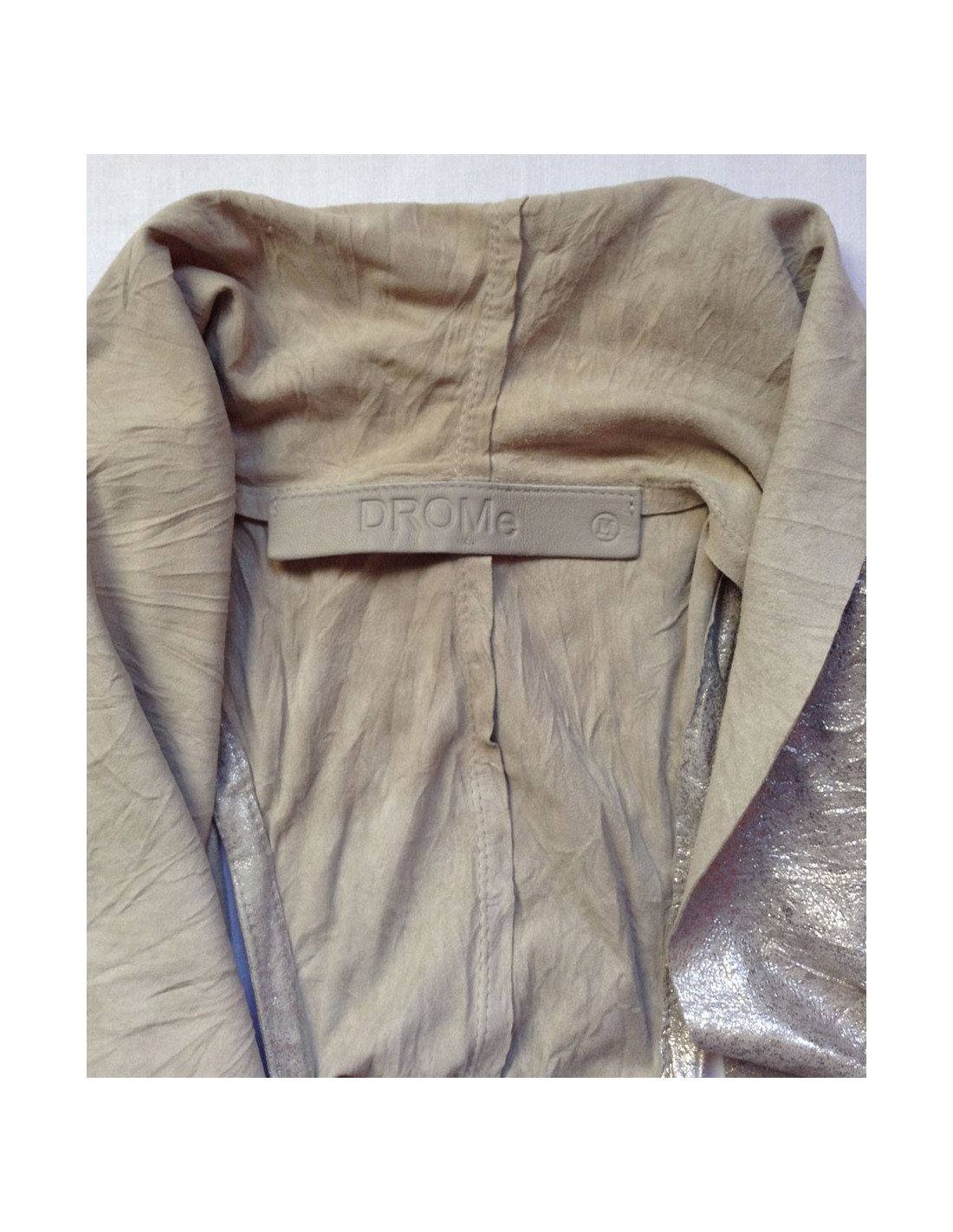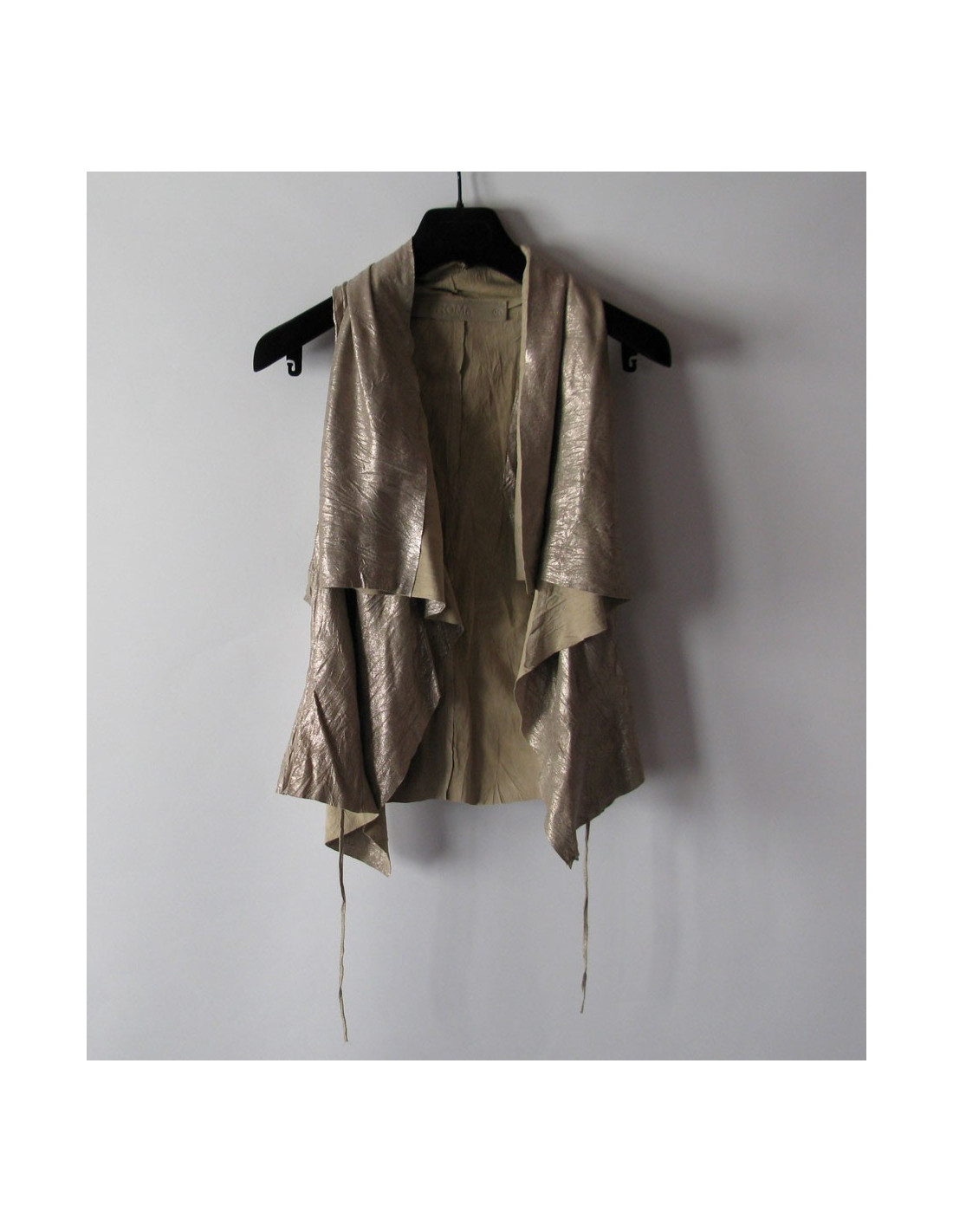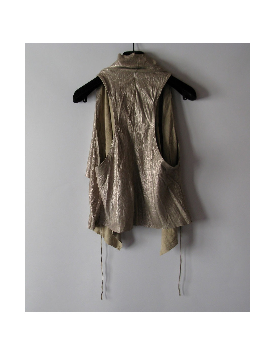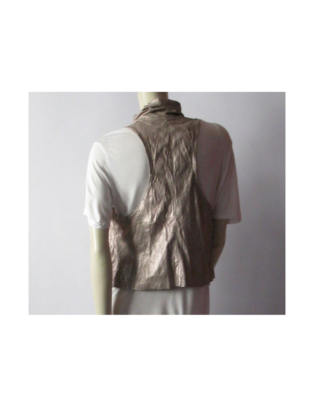 Un look rock chic! Gilet DROME en cuir beige nacré souple, effet froissé, sans manches, col à large revers, dos nageur, Cordon de serrage.