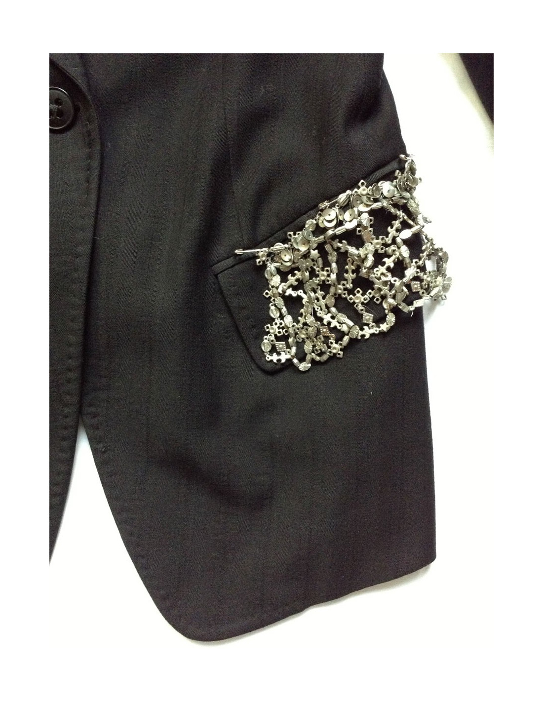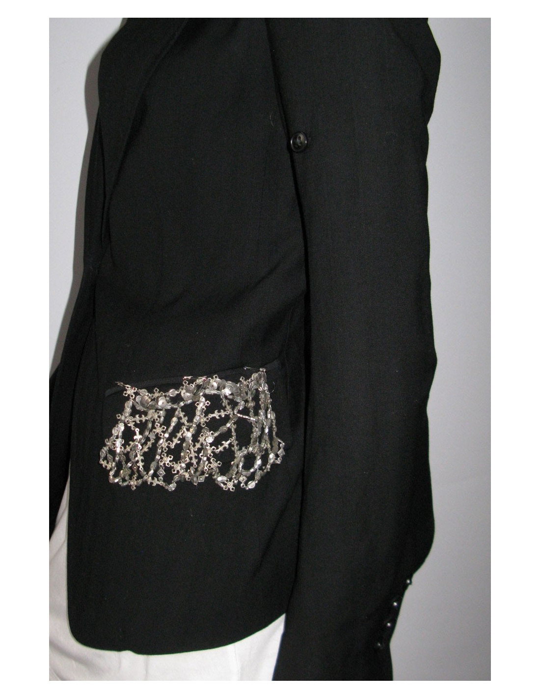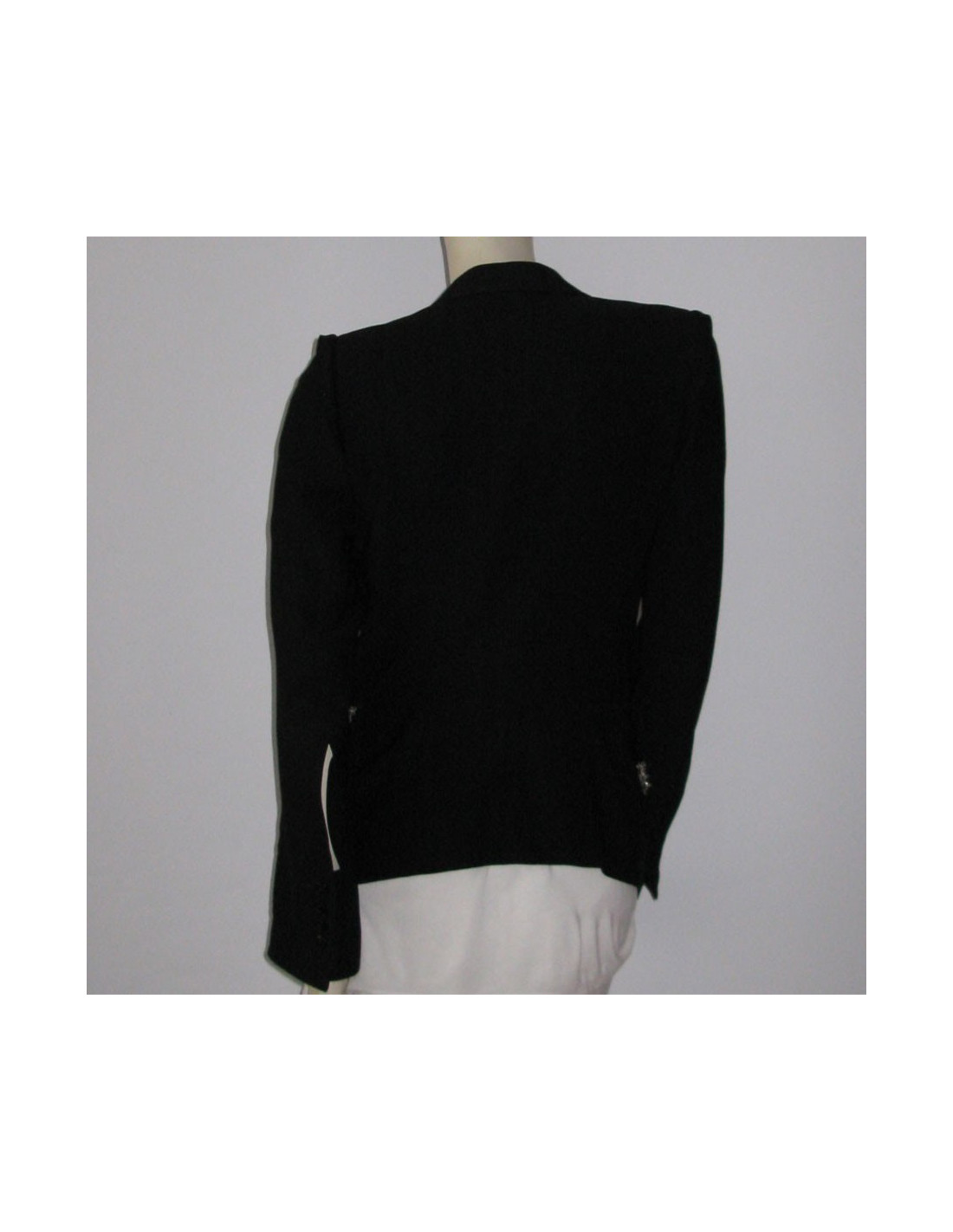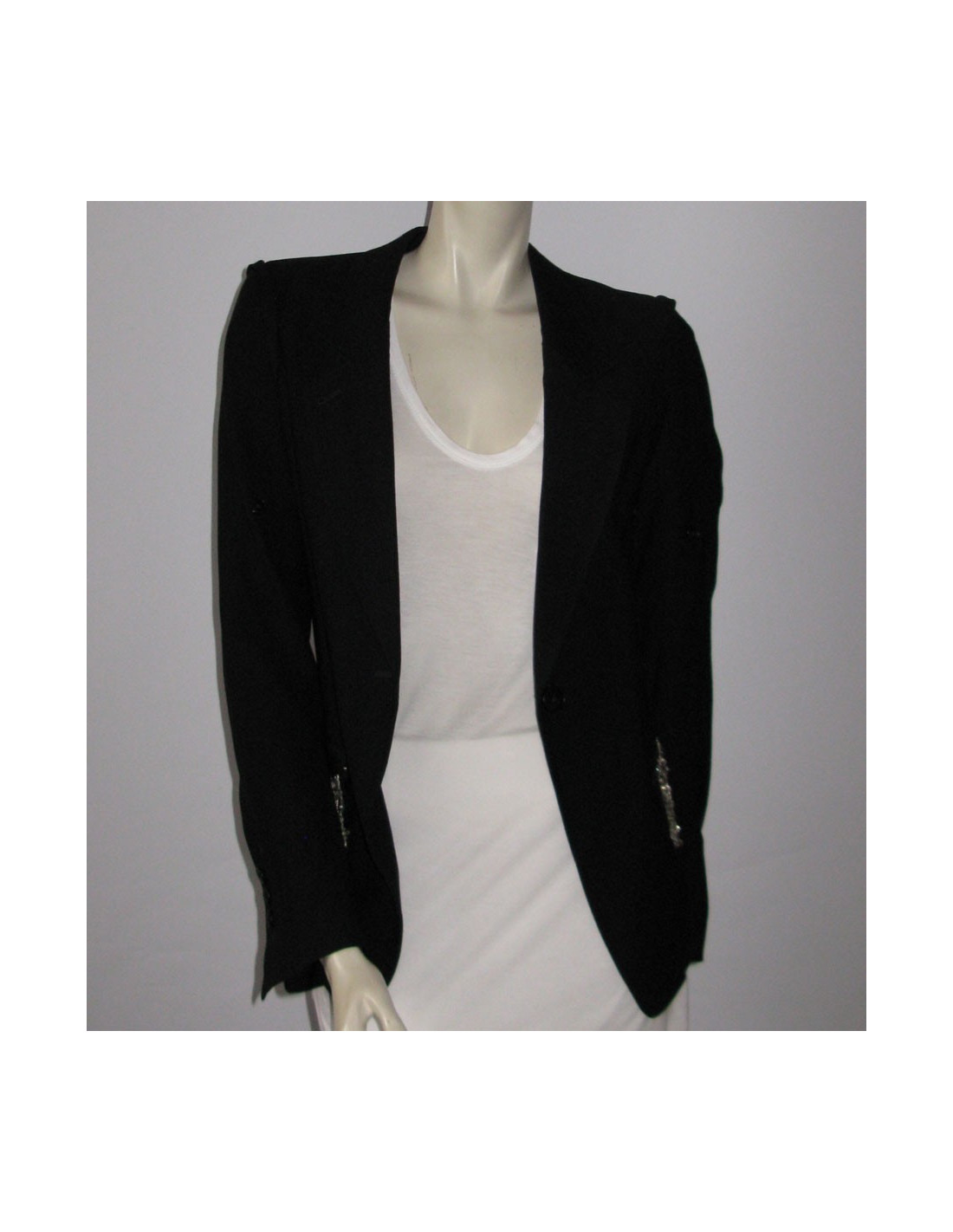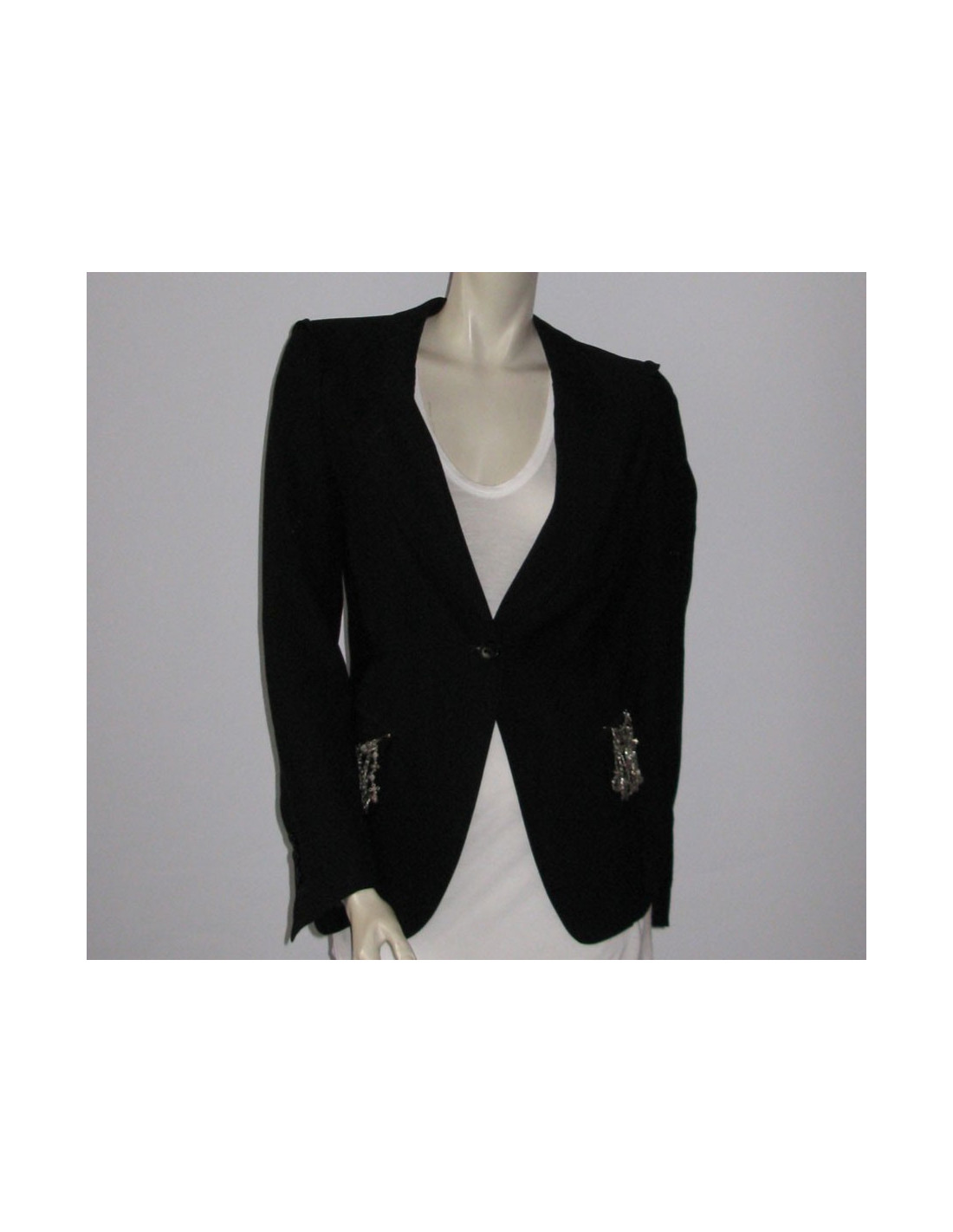Coupe près du corps, manches longues avec possibilité de retrousser les manches grâce au petit bouton intégré sur le haut de la manche. Col tailleur, poches en biais à rabats, décorées d'une cotte de maille argentée, ornée de détails métalliques. Fente d'aisance au dos. Fermeture centrale 1 bouton, petite fente sur les manches à proximité des 4 boutons d'ouverture située aux poignets. 51% laine vierge, 49% viscose.