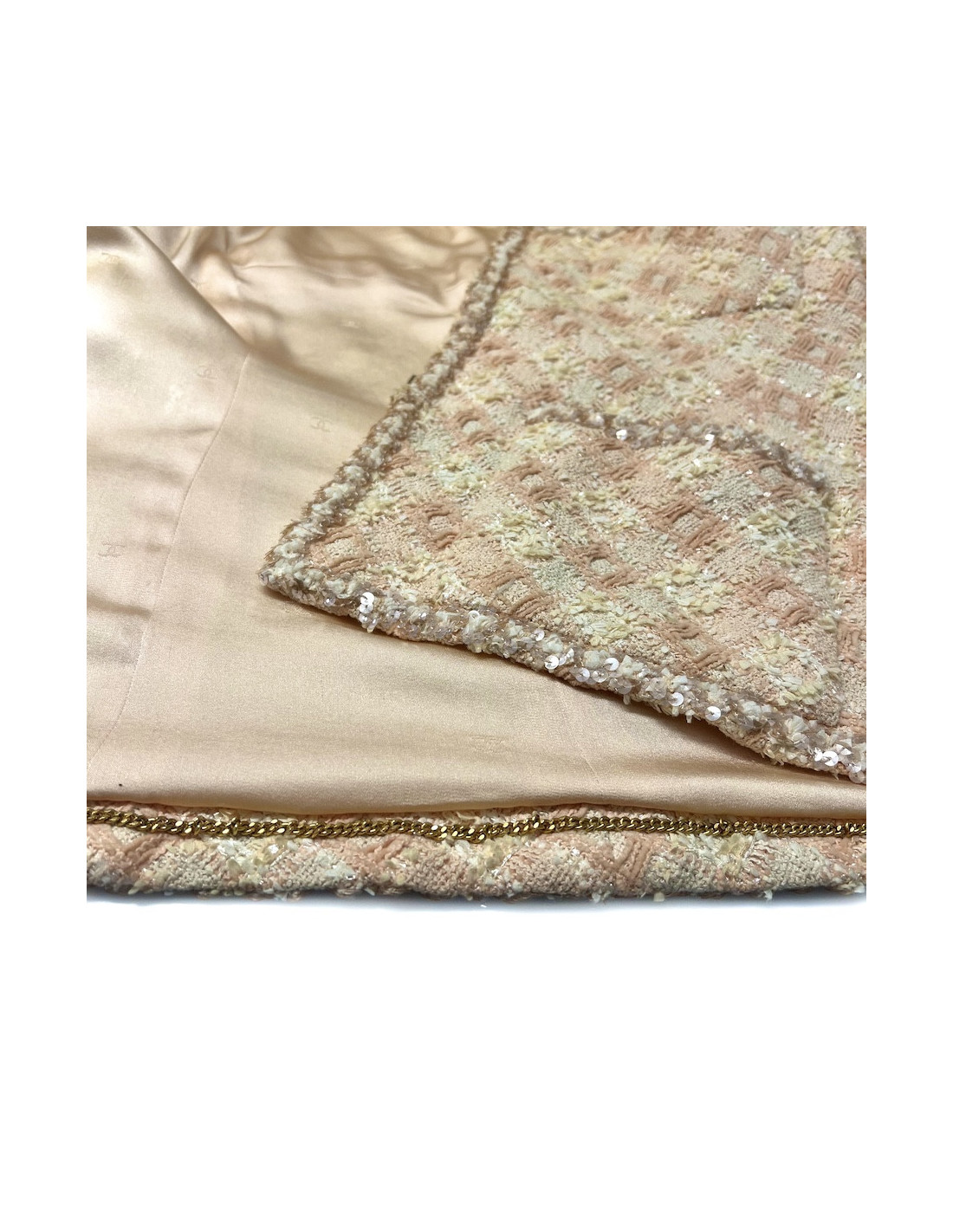 Réalisé dans un tweed aux nuances de pêche (orange et beige), l’ensemble est subtilement agrémenté de sequins qui apportent un éclat discret et élégant à la matière. La veste présente une coupe structurée avec un col en V et se ferme par une fermeture éclair dorée sur le devant ainsi que sur les poignés. Elle a quatre poches plaquées, signature emblématique des vestes Chanel.