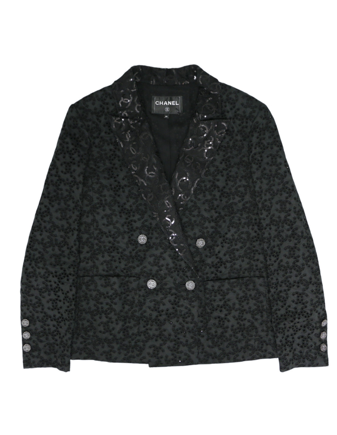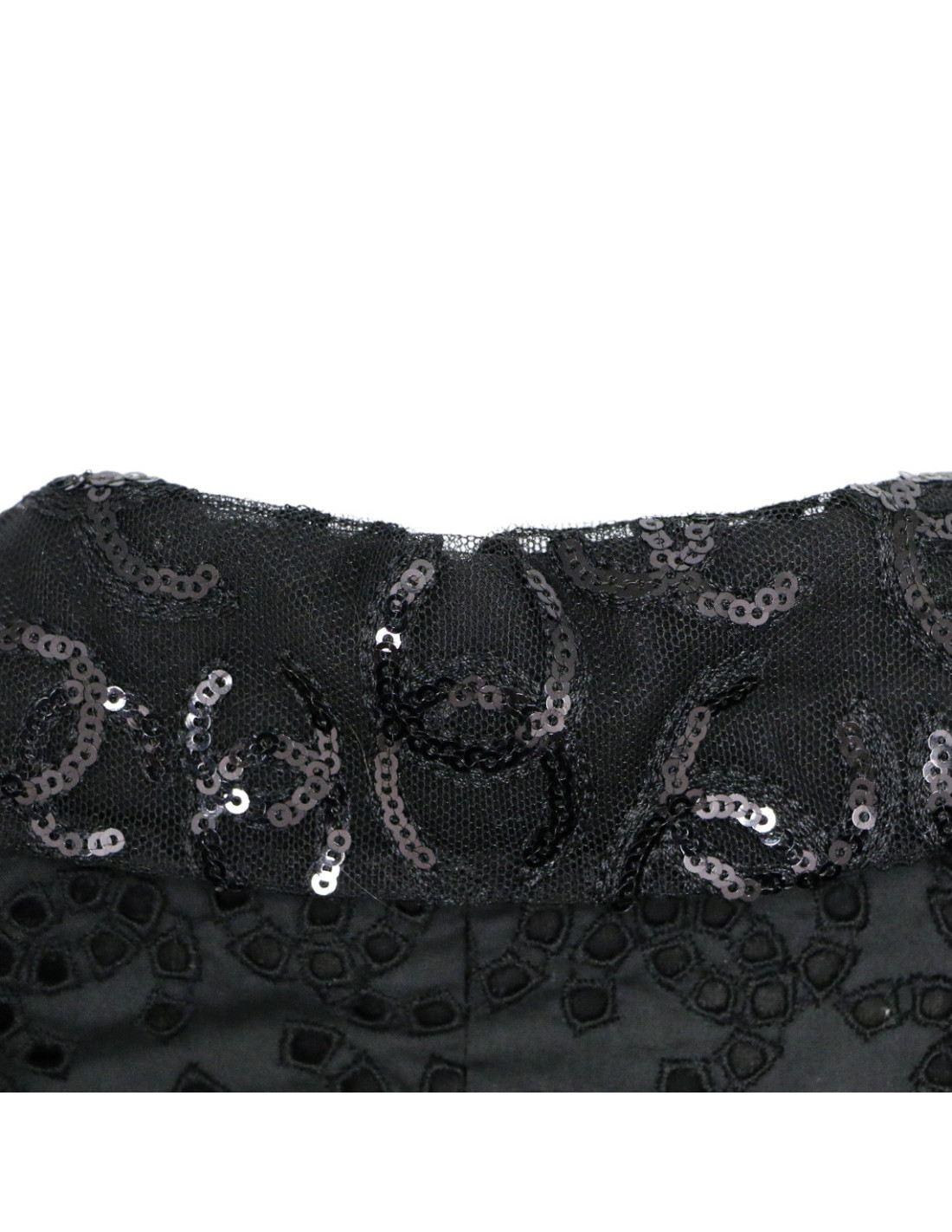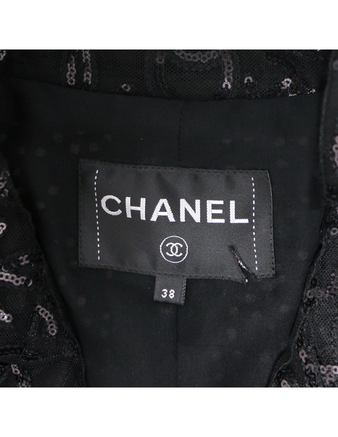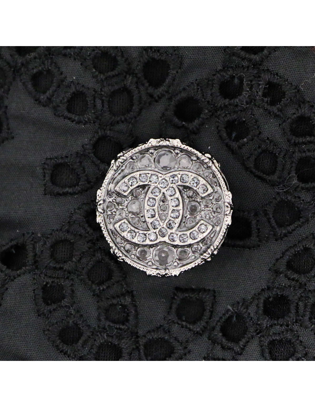 Détails : veste croisée à deux poches en dentelle noire ornée du motif CC. Le revers du col est rehaussé de sequins, tout comme sa doublure. La doublure en soie unie noire ne présente aucun défaut. Le double boutonnage, est composé de deux rangées de deux boutons en métal qui sont incrustés de cristaux.