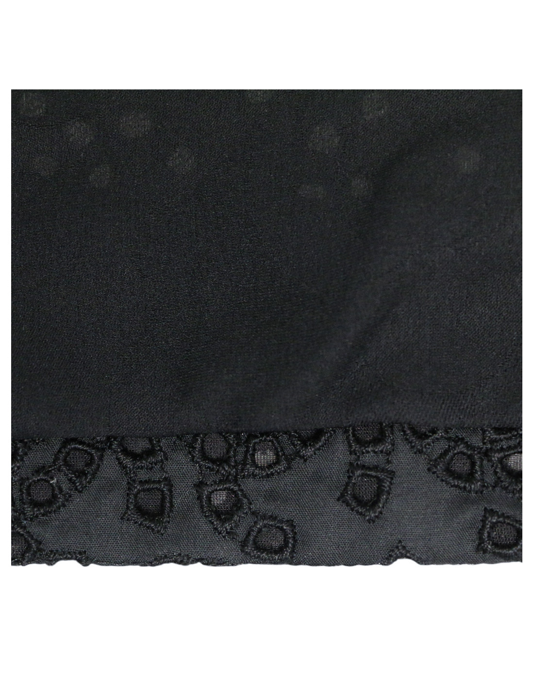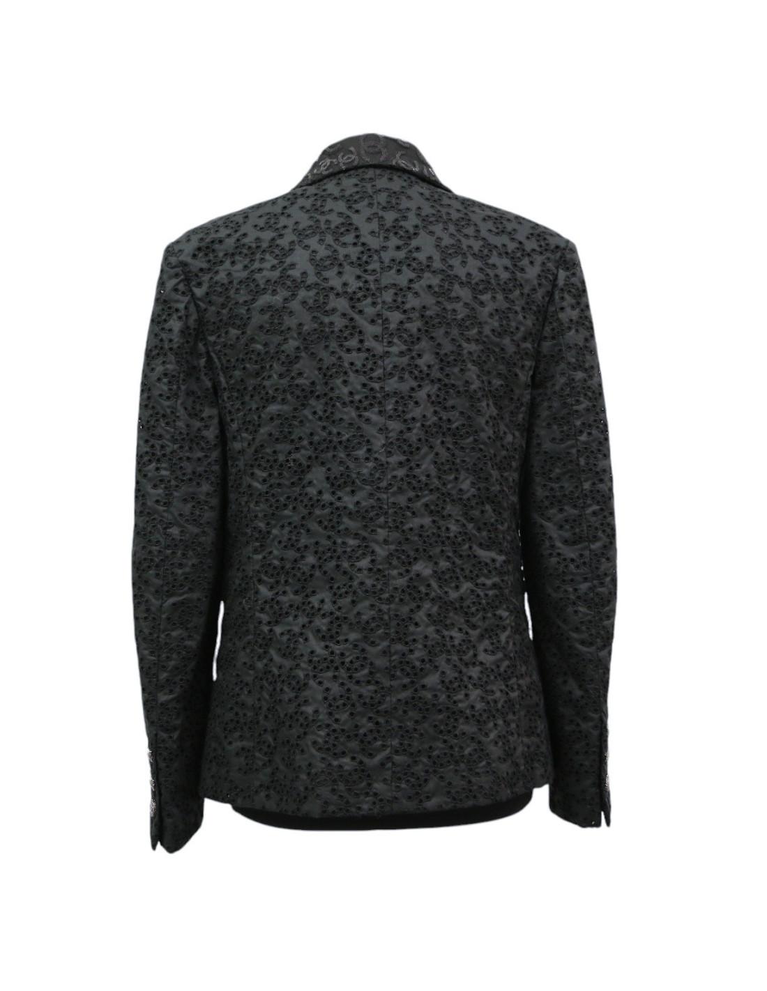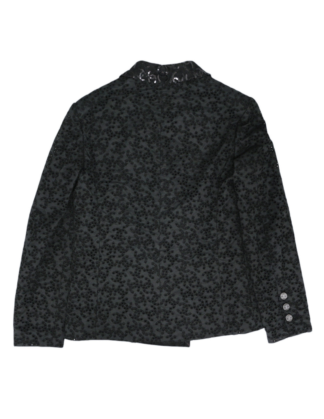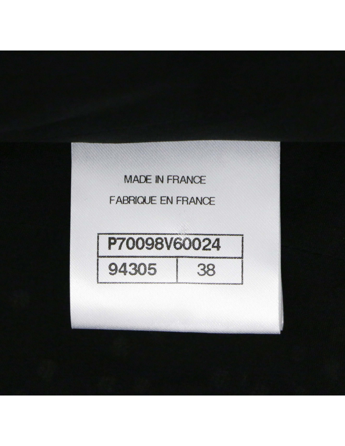 Détails : veste croisée à deux poches en dentelle noire ornée du motif CC. Le revers du col est rehaussé de sequins, tout comme sa doublure. La doublure en soie unie noire ne présente aucun défaut. Le double boutonnage, est composé de deux rangées de deux boutons en métal qui sont incrustés de cristaux.