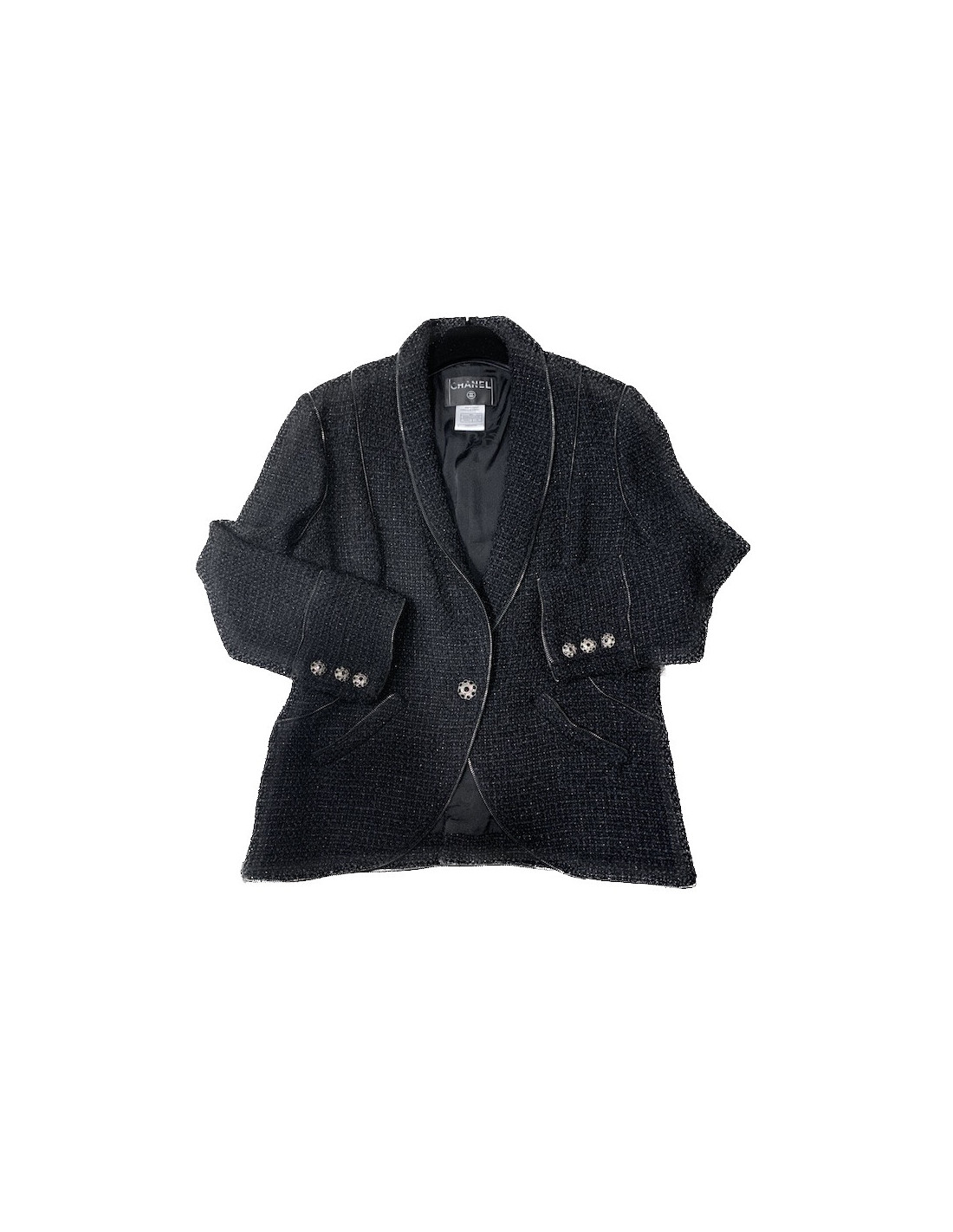 Nouveau Vendu VESTES Veste Chanel noire brillante taille 46 CHANEL 38580 7 300,00 € Veste Chanel noire en laine Condition : très bon étatPays de fabrication : FranceMatière : 98% laine, 2% polyamideDoublure : 100% soieModèle unisexeTaille : 46Dimensions à plat : largeur des épaules 46 cm, largeur sous les aisselles 52 cm, longueur des manches 62 cm, hauteur totale 62 cmDétails : en très bel état, cette veste Chanel séduit par son tissu... Voir