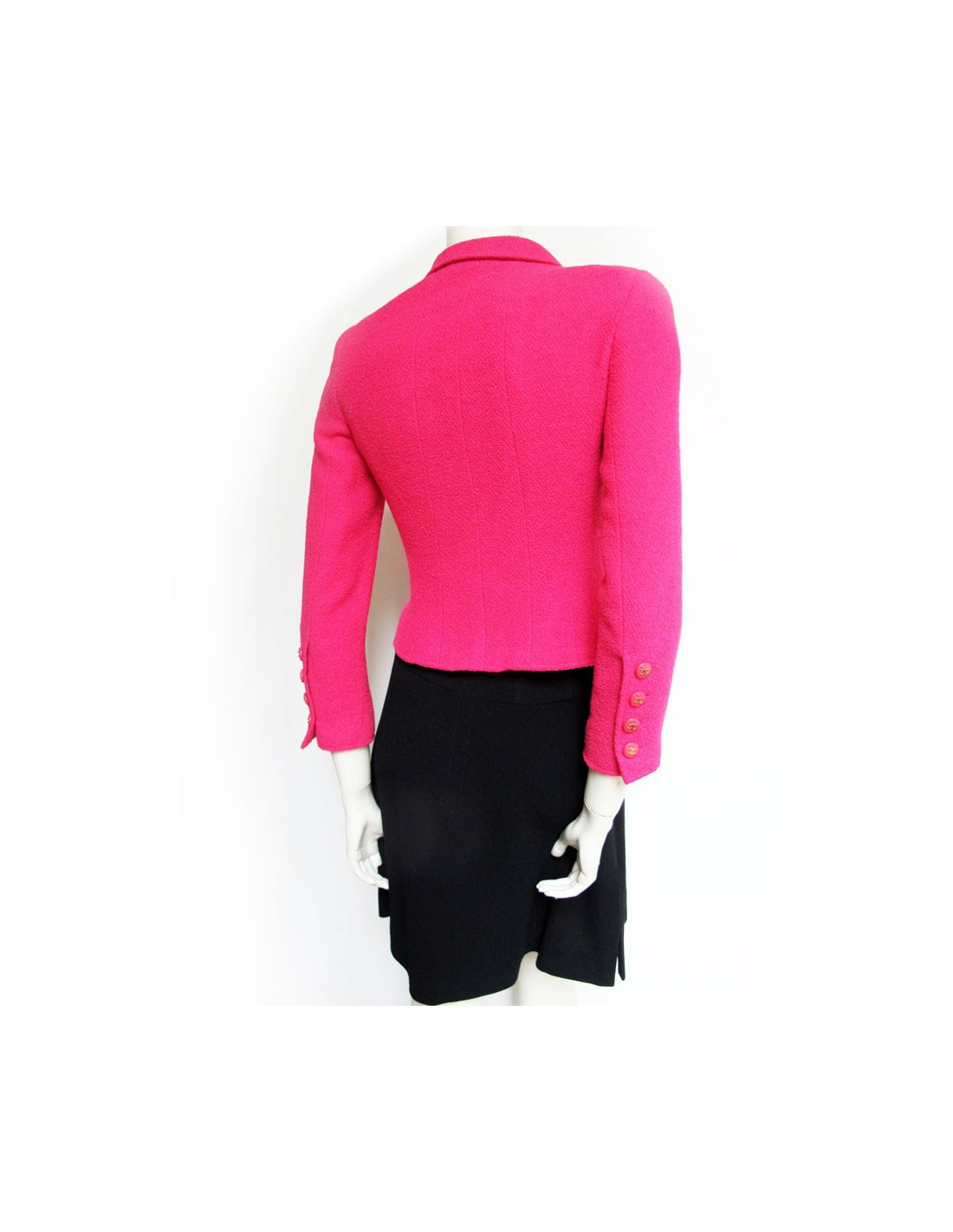 Ensemble CHANEL t 36 fuchsia et noir. La veste fushia est en 100% coton. Les boutons sont siglés CC en métal doré. La doublure est en soie.