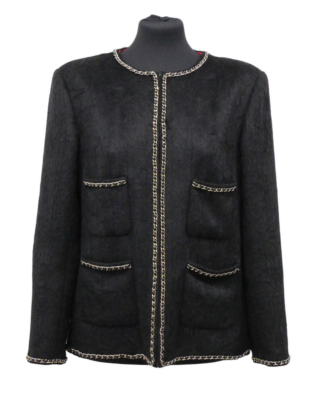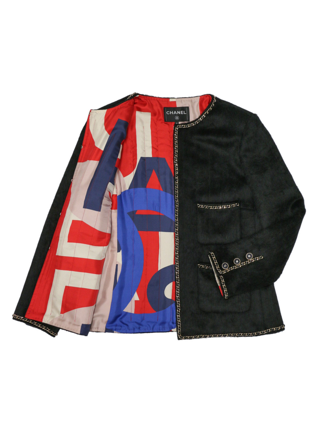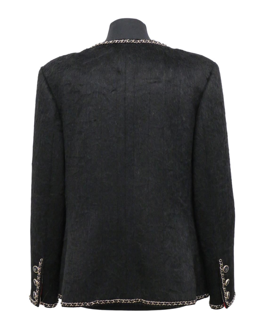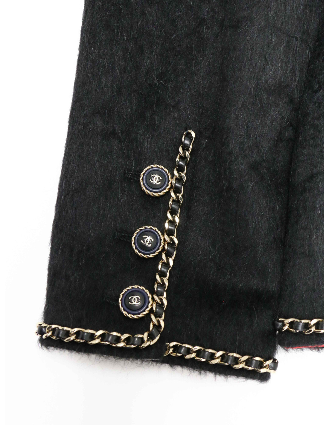 Détails : petite veste noire Chanel toute gansée de chaine enlacée de cuir qui nous rappelle la bandoulière du sac Classique de la Maison. Elle se ferme par des petits crochets et a quatre poches.