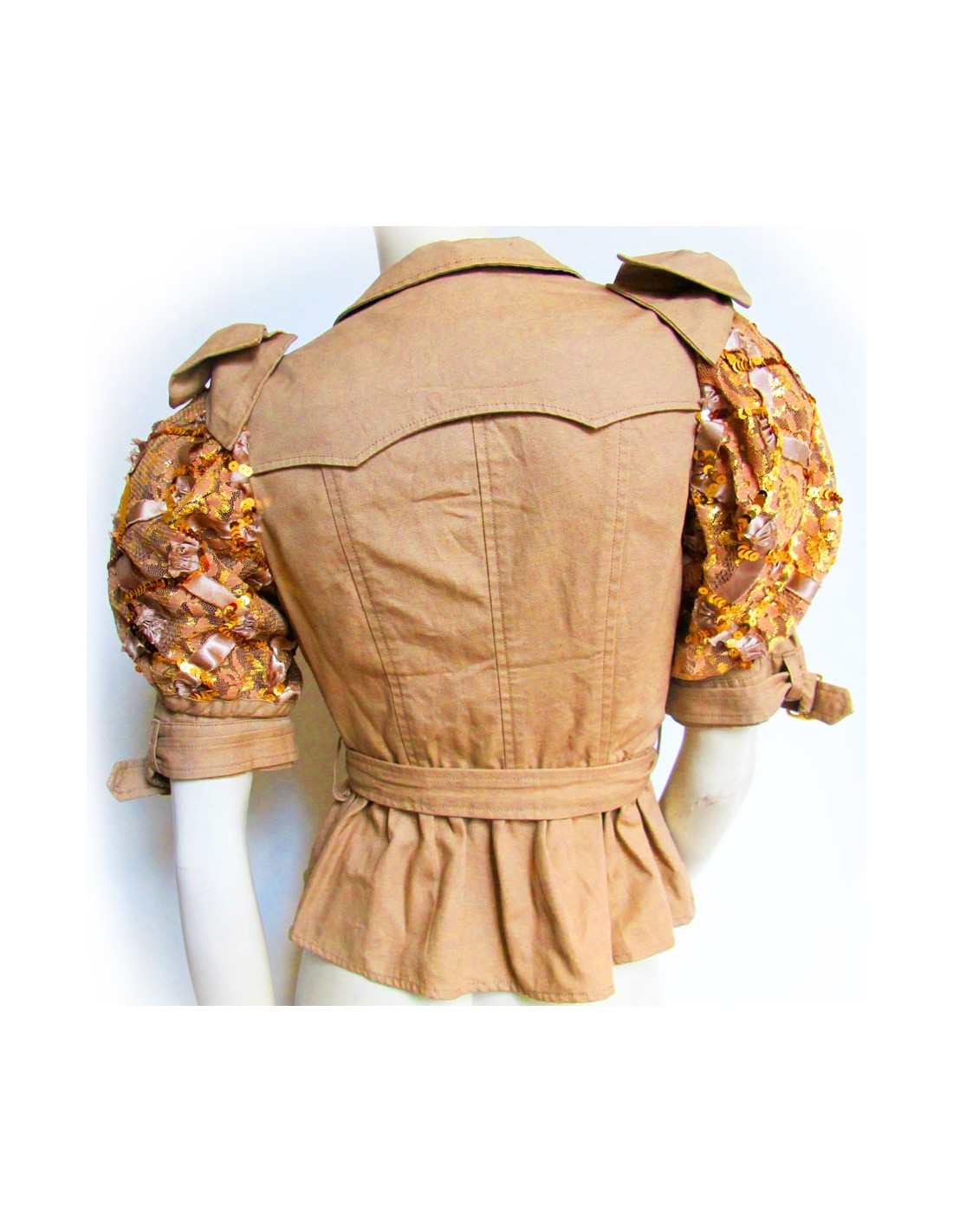Veste MANOUSH T36 en coton beige, à manches ballons brodées avec des paillettes dorées. Elle est resserrée à la taille par une ceinture réglable. Une poche de chaque côté fermée par un très joli bouton doré.