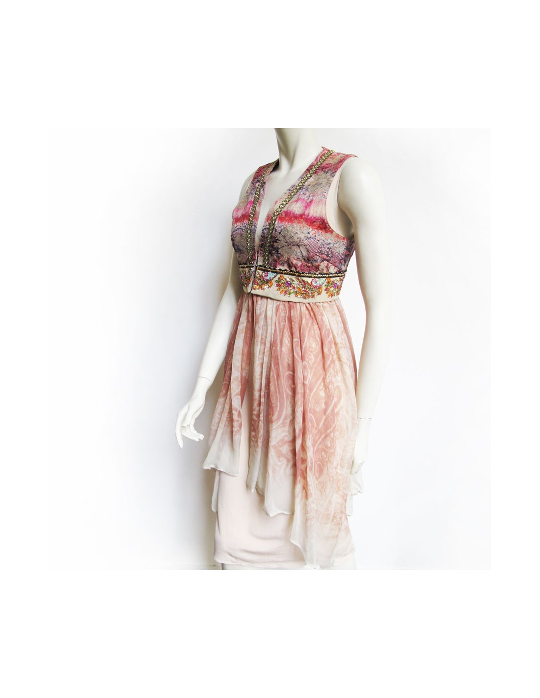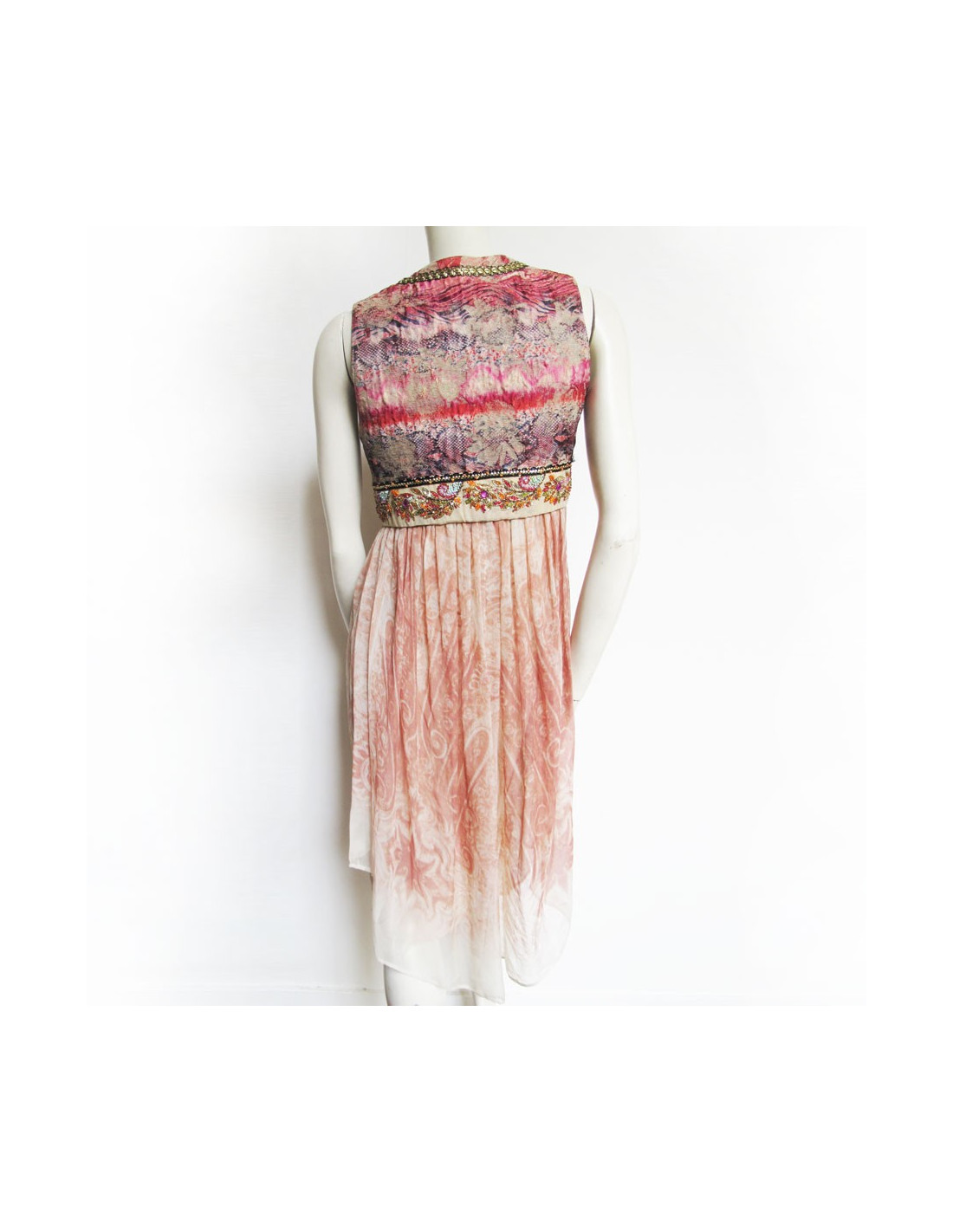 A partir de la taille du gilet jusqu'en bas avec beaucoup de fluidité et de féminité, il se transforme en veste longue en soie dans les tons pastel.