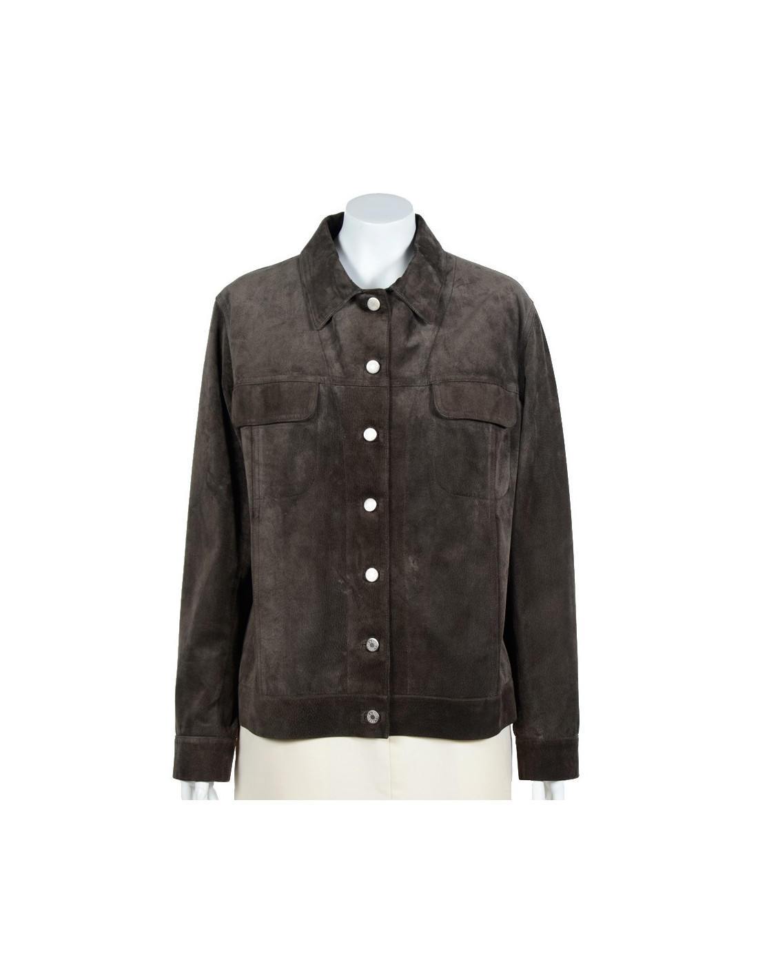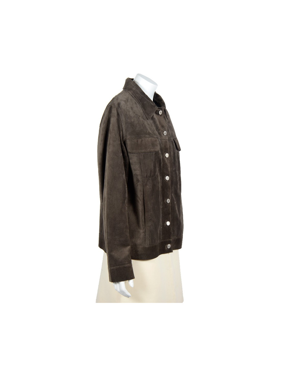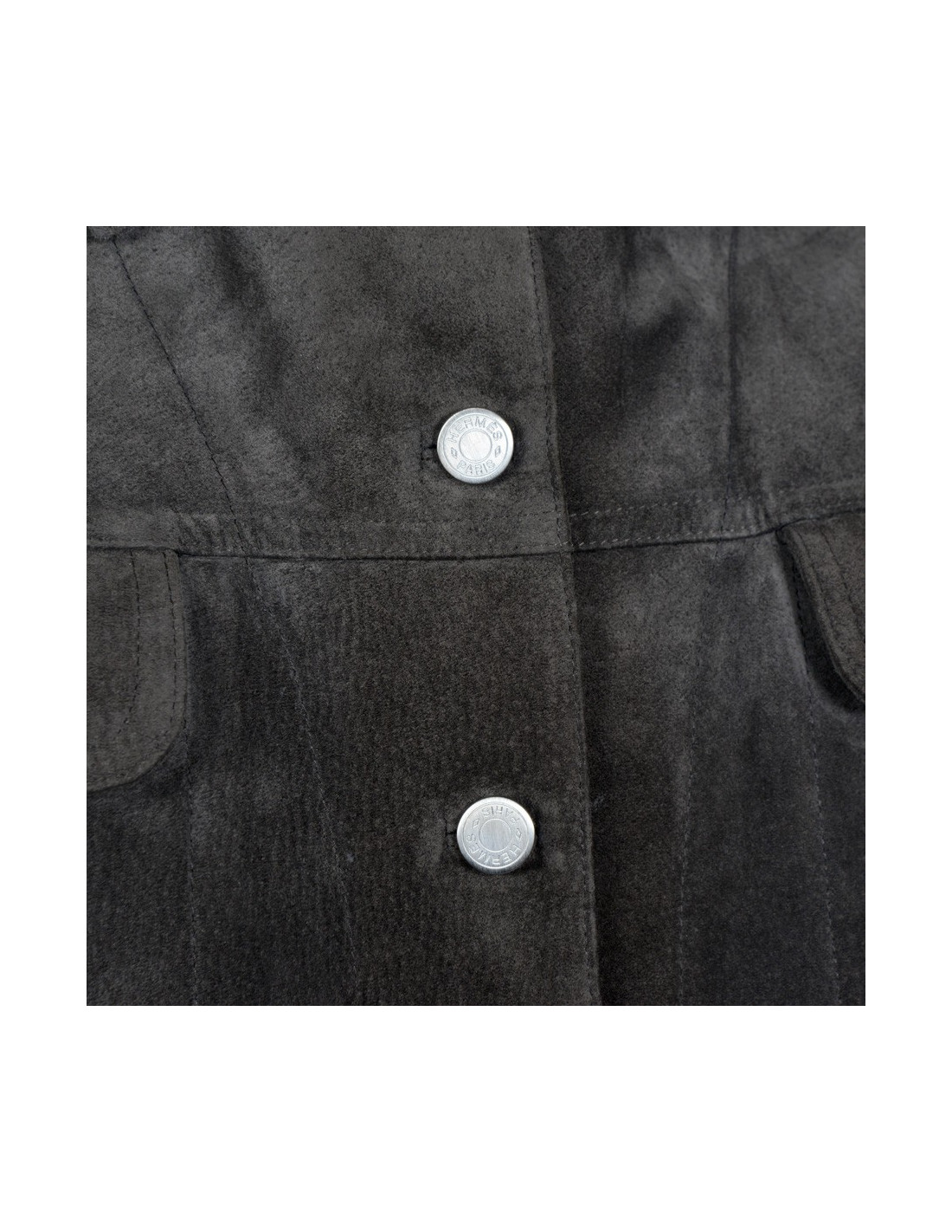 Blouson en cuir (pécarie) de couleur bronze Hermès taille 42. Les boutons siglés "Hermès Paris" sont en métal argenté. Il y a quatre poches, deux avec rabats et deux avec fentes. La doublure est 100% soie. il n'a jamais été porté