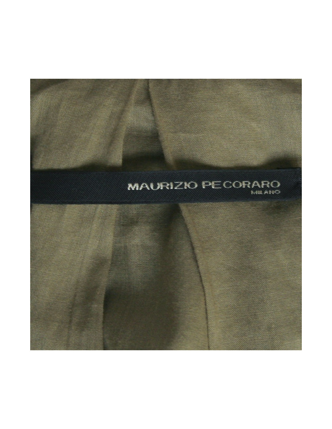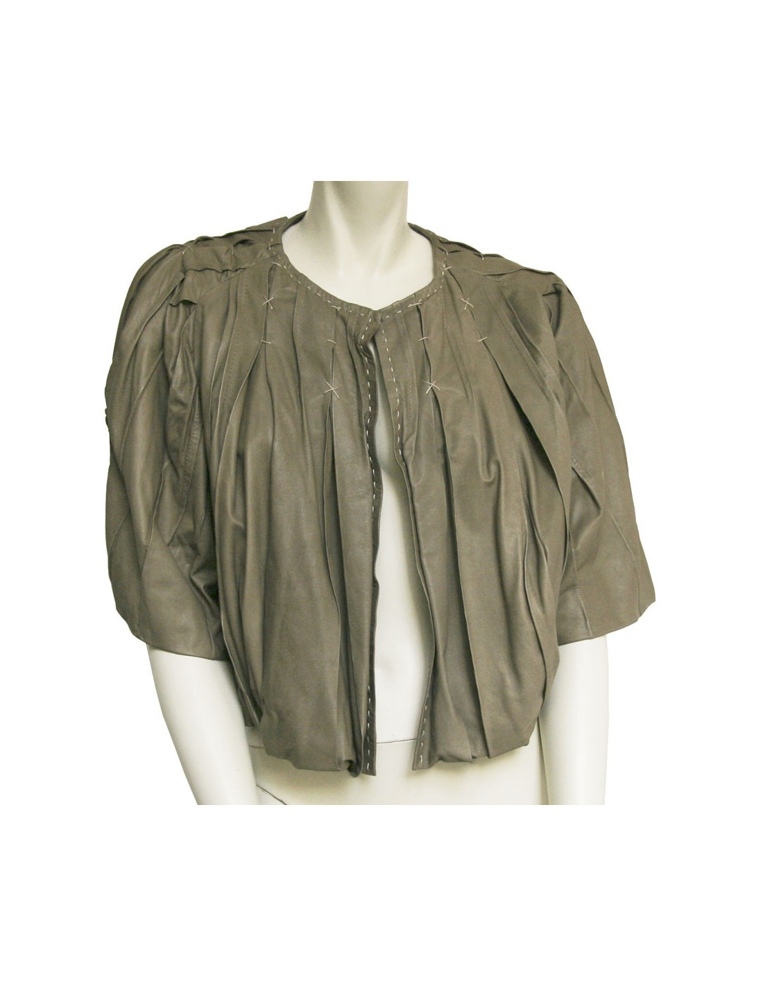 Veste Maurizio Pecoraro en cuir d'agneau de couleur taupe. Taille 44 italien ce qui correspond à un 40 francais. Le col est rond, surpiqué et plissé. Longueur des manches 3/4. En bon état. Elle est tachée en bas à droite et également sur la manche. Voir photo.