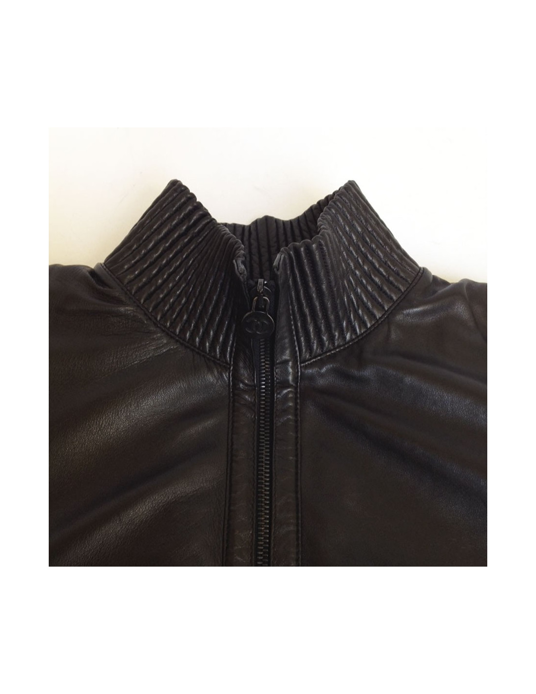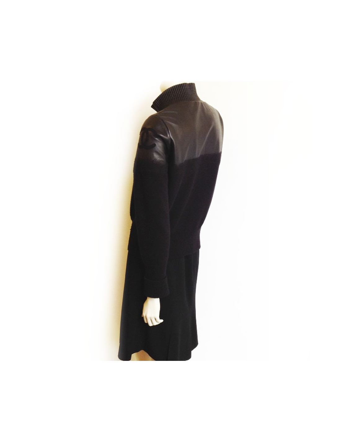 Blouson Chanel en laine et cuir d'agneau noir T40. Deux poches plaquées au niveau de la taille. Il est resserré à la taille. Il porte le sigle CC sur l'épaule gauche. En très bon état. Il a une petite déchirure sous le bras droit, voir photo.