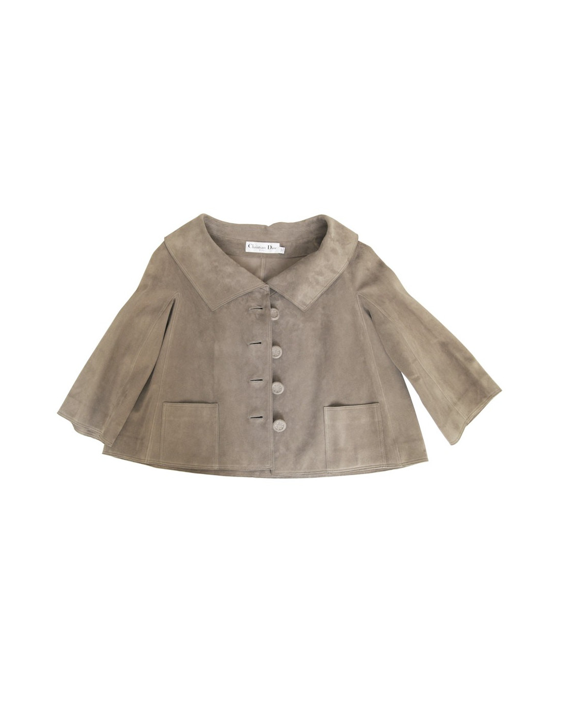Magnifique veste Christian Dior en veau velours de couleur taupe. T38. Deux poches plaquées. Fermeture 4 boutons avec surpiqûres de la même couleur. En très bon état.