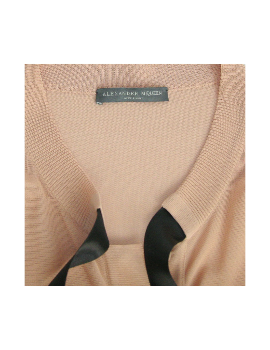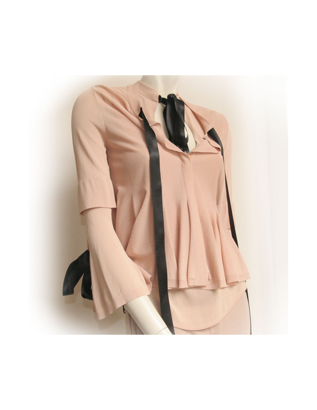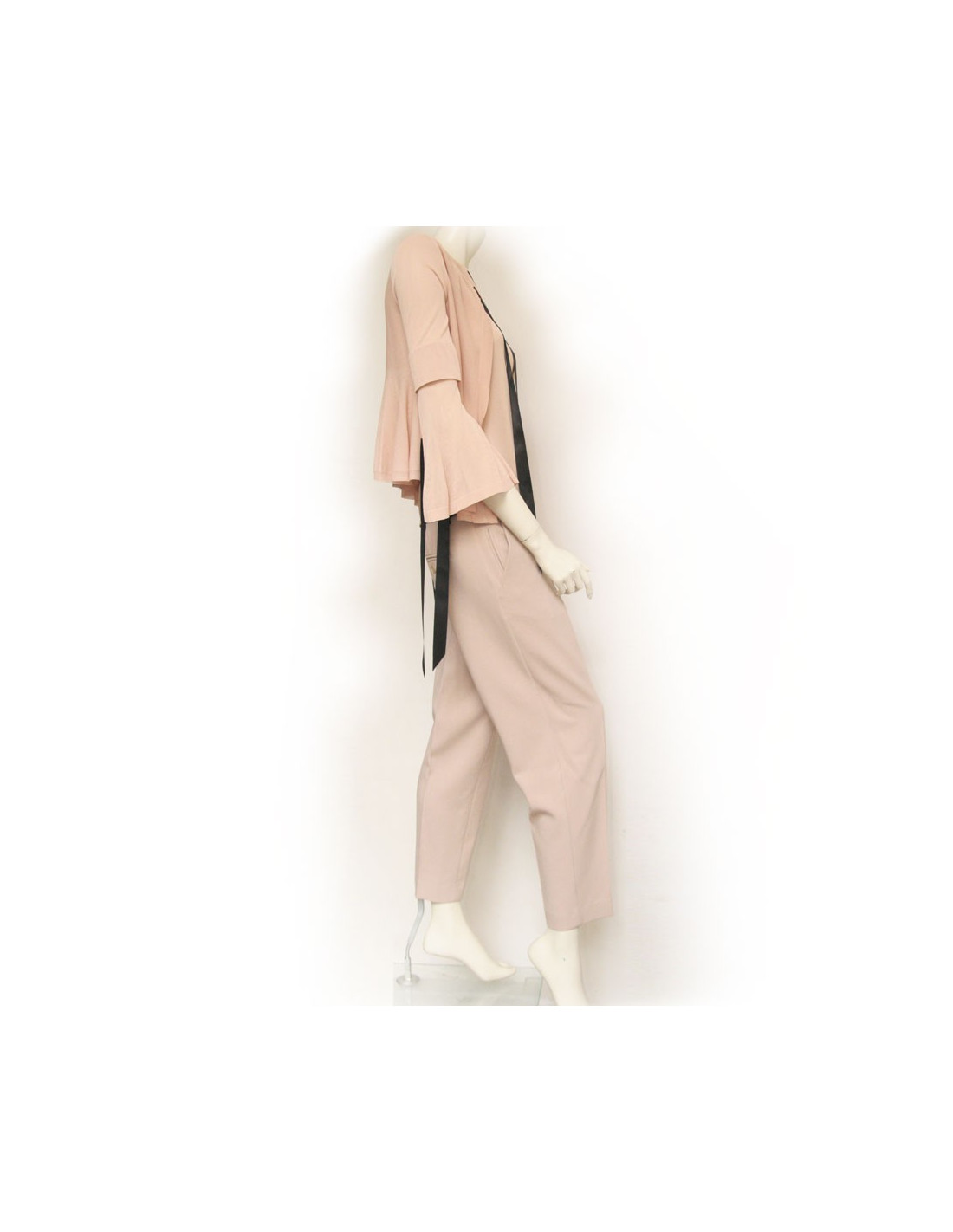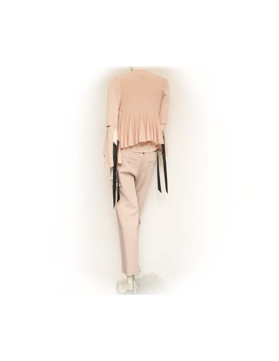 Ensemble pantalon veste et top Alexander McQueen. Le pantalon est de couleur vieux rose à pince en polyester. Longueur chevilles. Deux poches en biais sur les cotés et deux fausses poches l'arrière avec boutons. Le top et la veste sont viscose. La veste se ferme à l'aide de 4 boutons pression. Col rond intégré d'un ruban en satin noir ainsi que sur les manches. Le bas de la veste et le bas ont des volants perforés. Fentes sur les manches. En très bon état.