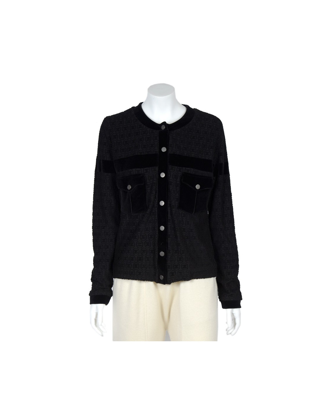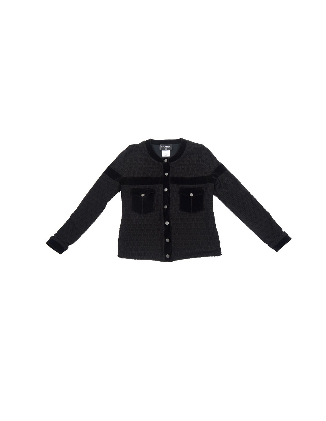 Veste Chanel en coton noir stretch. Très pratique à porter dans un style sportswear, motifs éponges monogram double "C". Taille 42 italien équivaut à un 38 français. Les poches et les bords sont en panne de velours. Les boutons sont en métal argenté avec le sigle "CC" au centre. La doublure est en coton. En très bon état.