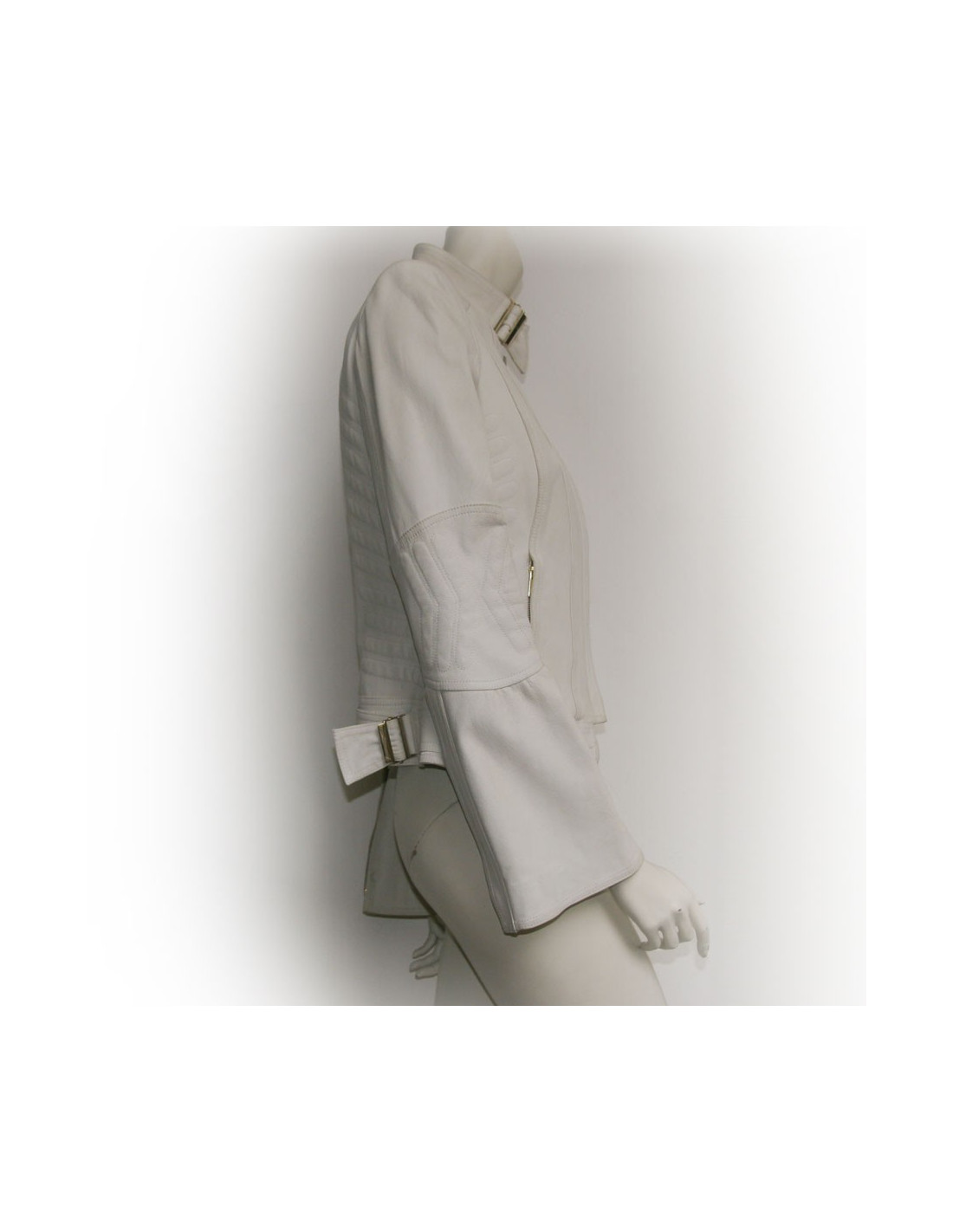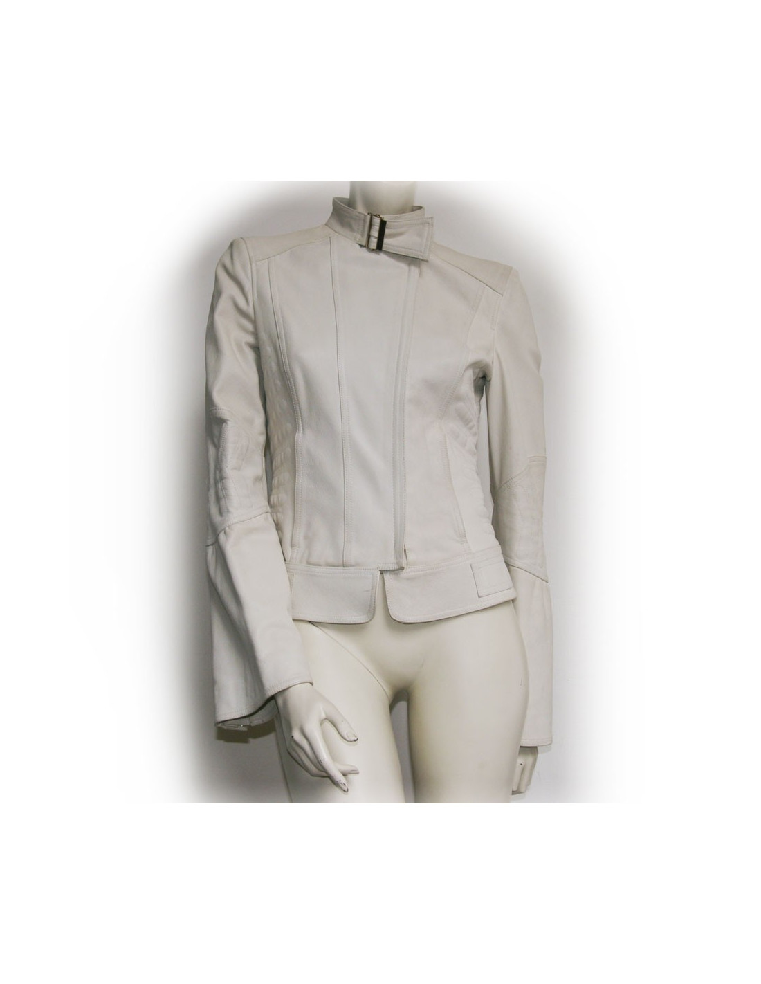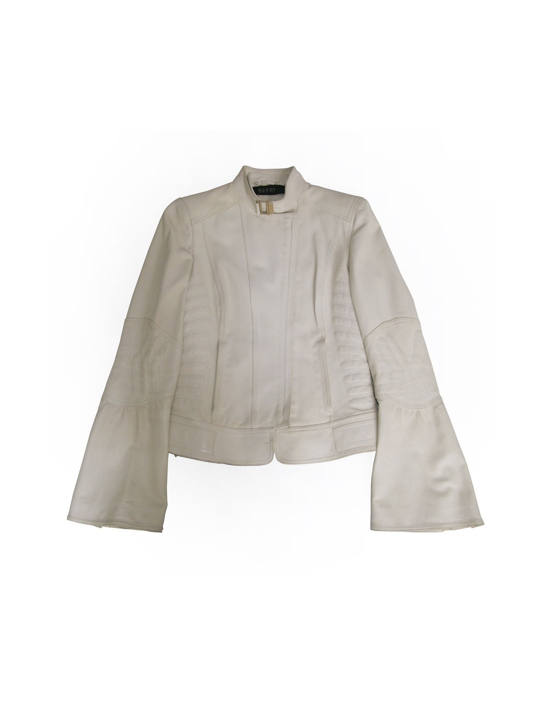 Magnifique veste en cuir Gucci de couleur blanche. Taille 40. Pas d'étiquette. Ceintrée, elle épouse les formes. Fermeture zippée. Renforcée dans le dos comme une veste de moto. En très bon état.