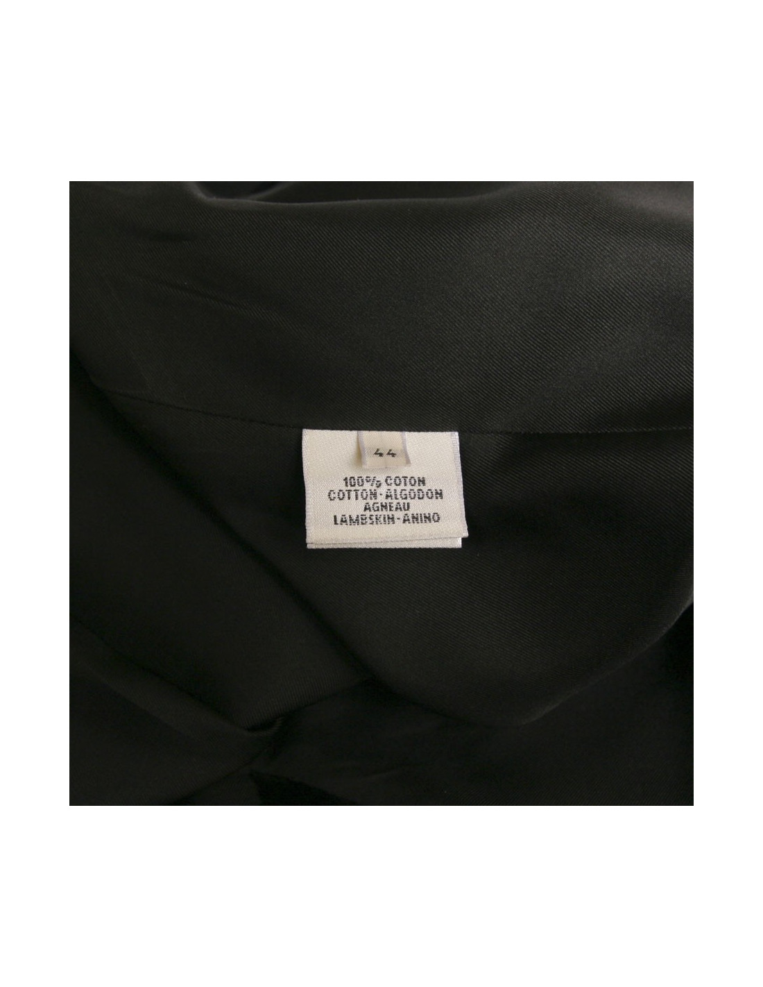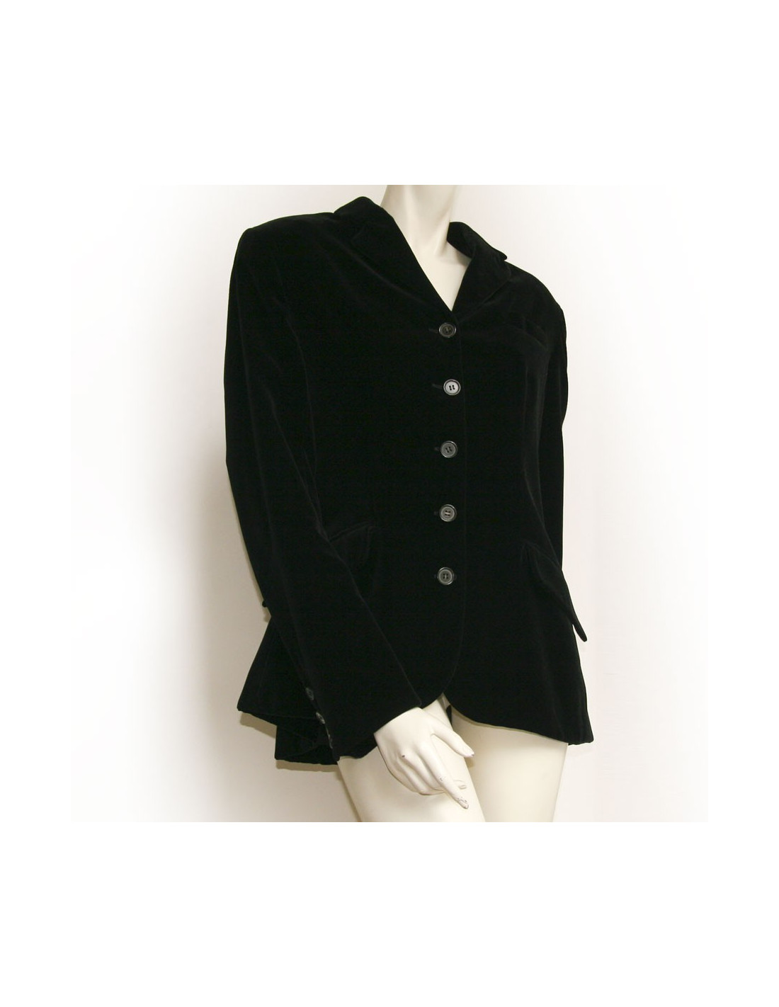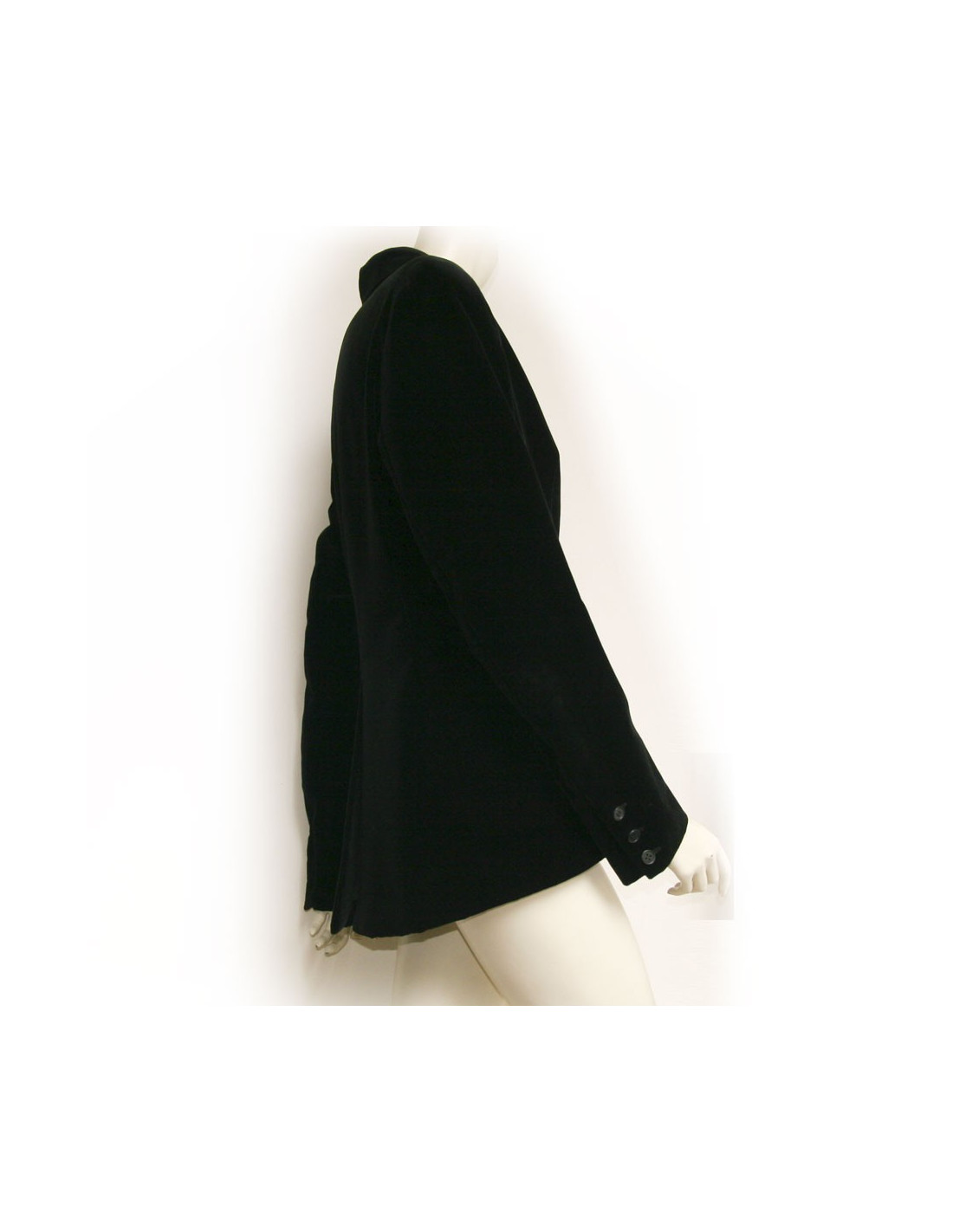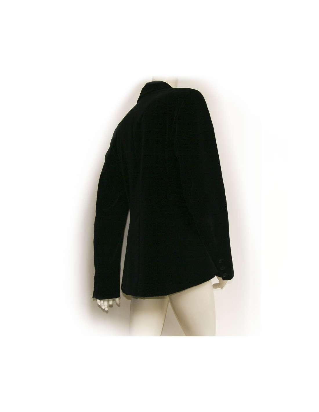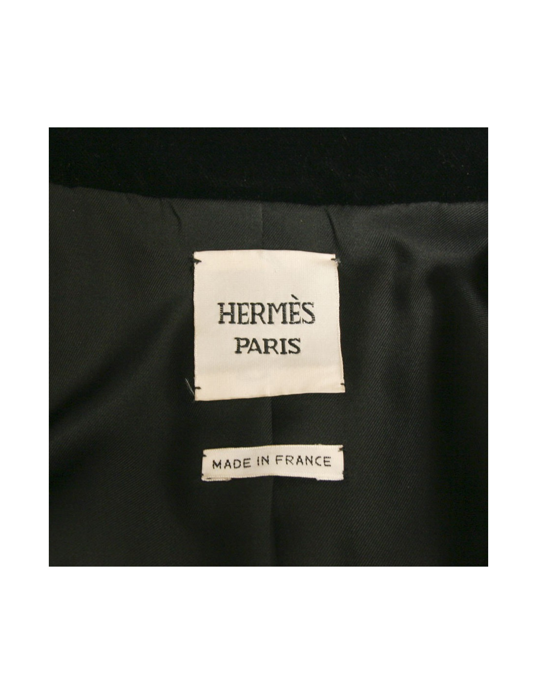 Veste Hermès en velours de couleur noir. Taille 44. Doublure 100% soie. Fermeture 5 boutons. Poches en biais. En très bon état. très légère usure au niveau des coudes.
