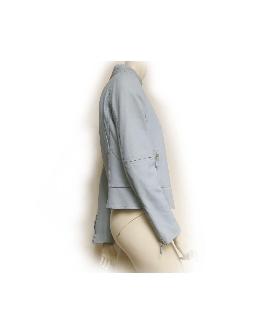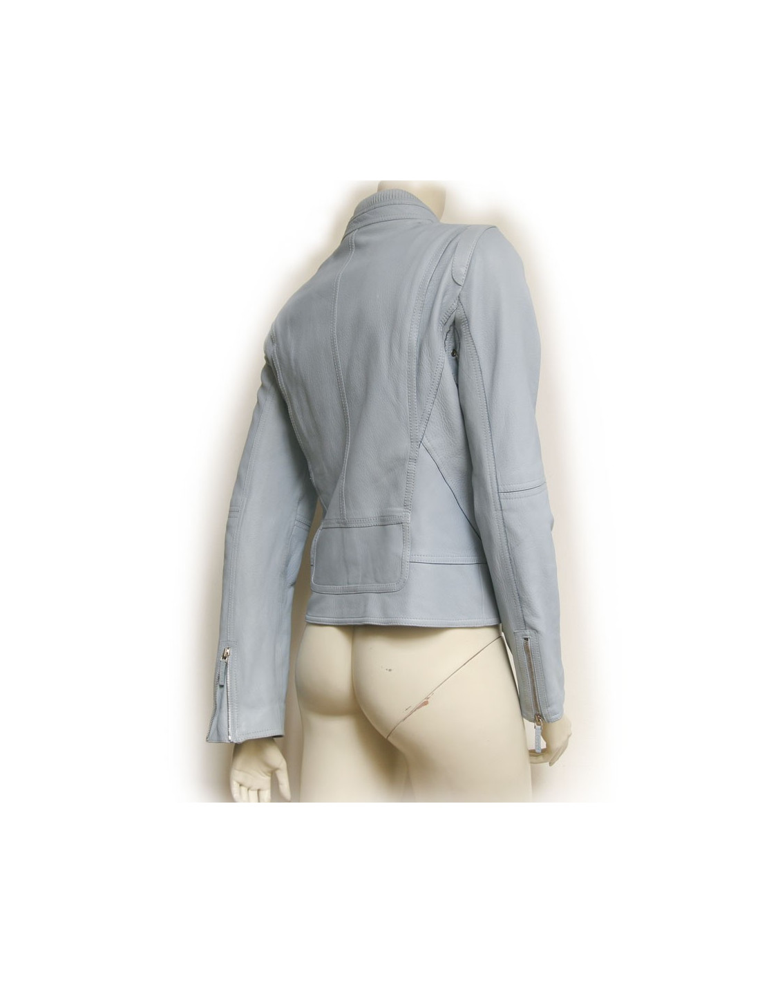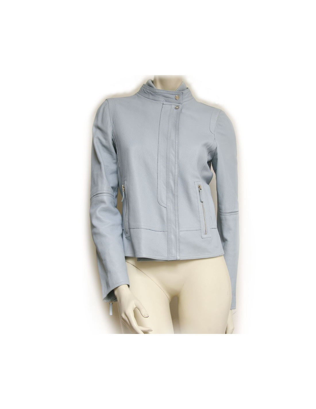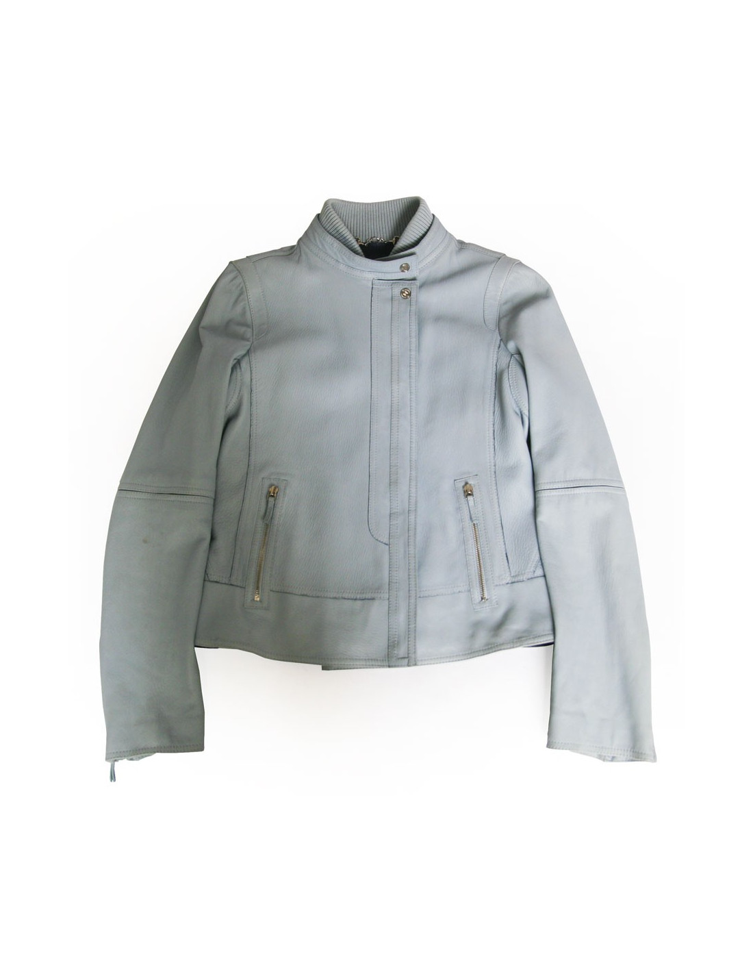 Veste en cuir Gucci bleu ciel. Taille 44 italienne équivaut à un 40 français. Fermeture zippée. Deux poches zippées à l'avant. Ceintrée. Fermeture pression en bas et en haut au niveau du col. Col en coton stretch. En très bon état. Petite tache sur la manche droite.