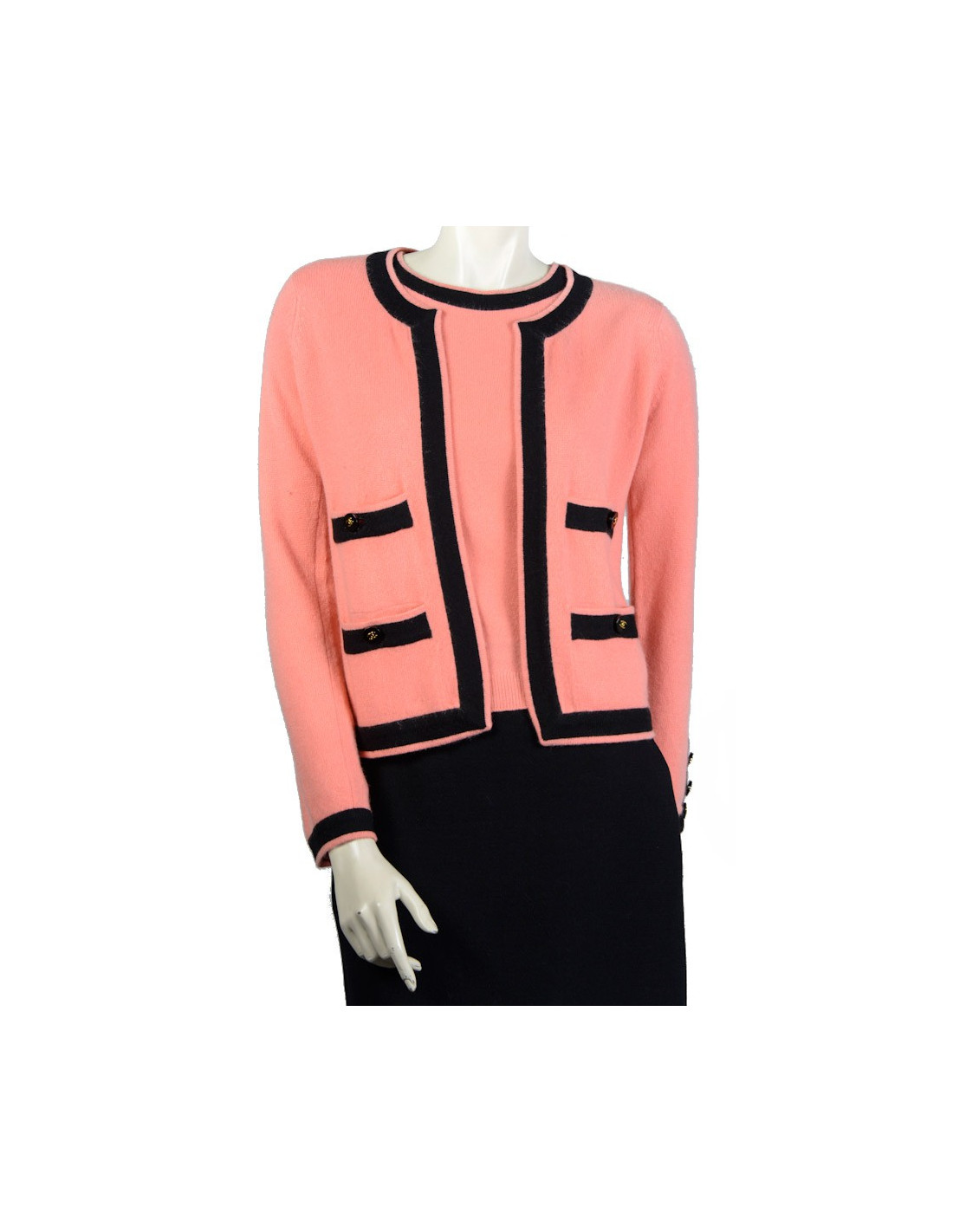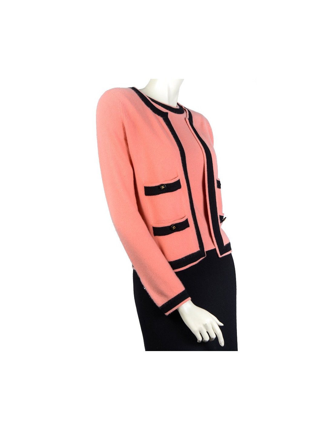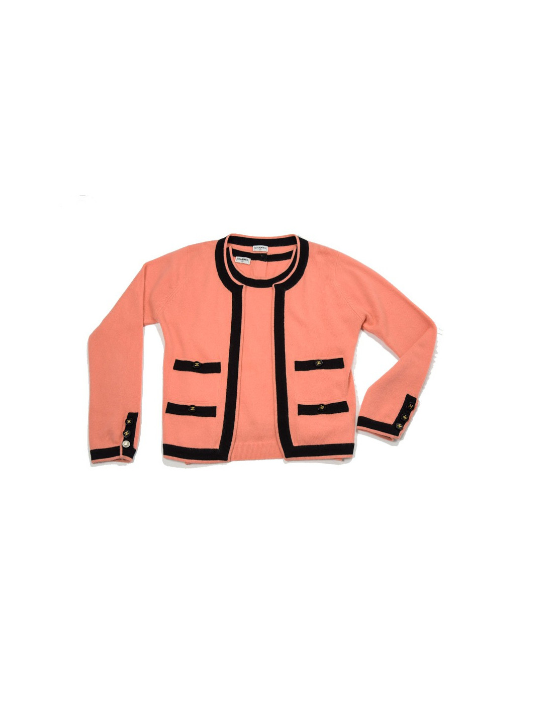Twin set Chanel en cachemire pèche avec les bordures noires. Pas d'étiquette de taille. Le top: Taille 36. Le gilet: Taille 38. 4 poches plaquées. Boutons siglés "CC" en doré. En très bon état.