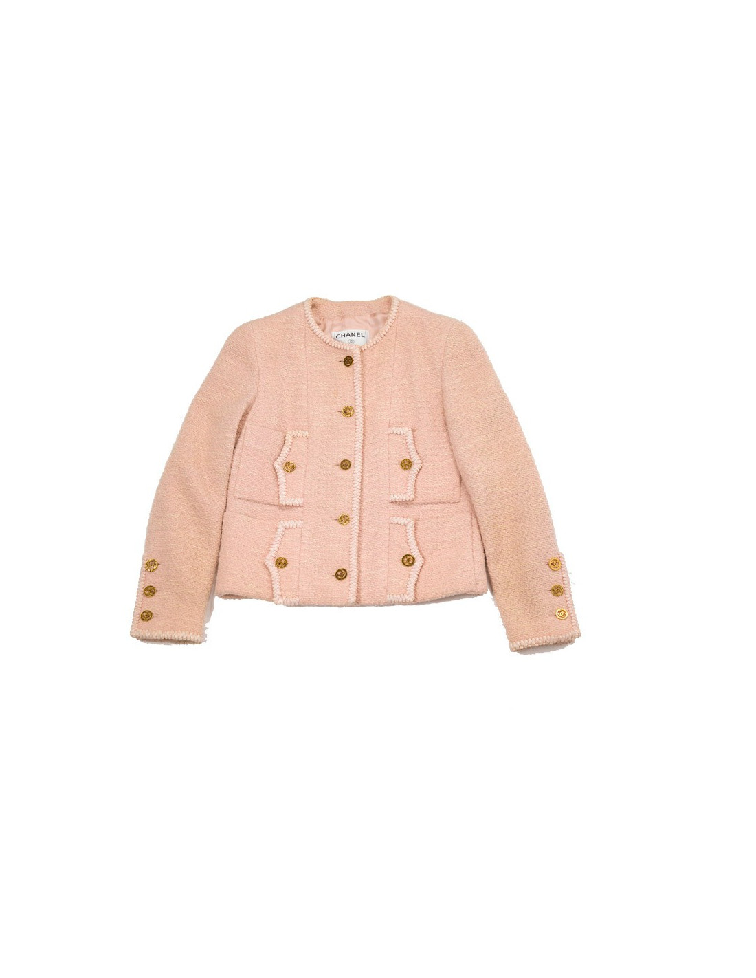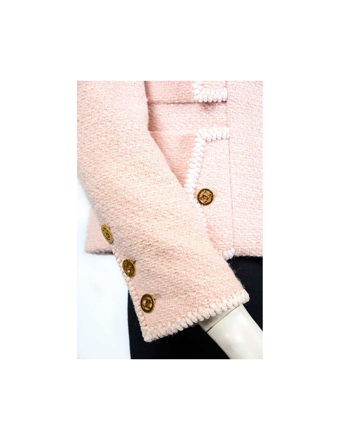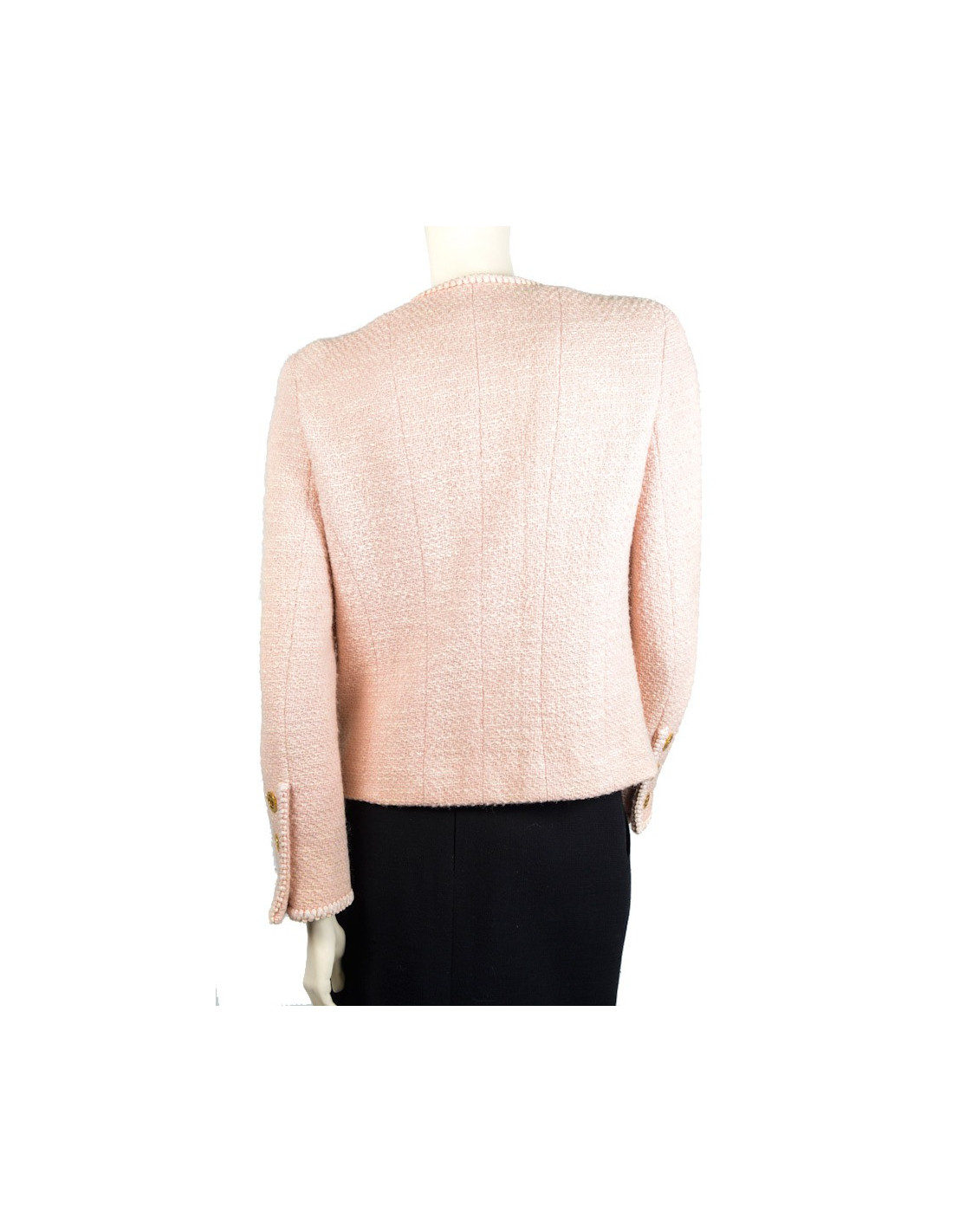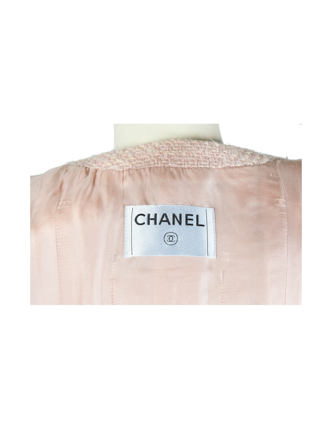 Veste Chanel en tweed rose. Taille 40. Fermeture 5 boutons dorés couture siglés "CC". 4 poches de côté boutonnés. 2 boutons seront fournis en plus avec la veste. Pas d'étiquette de taille. En très bon état.