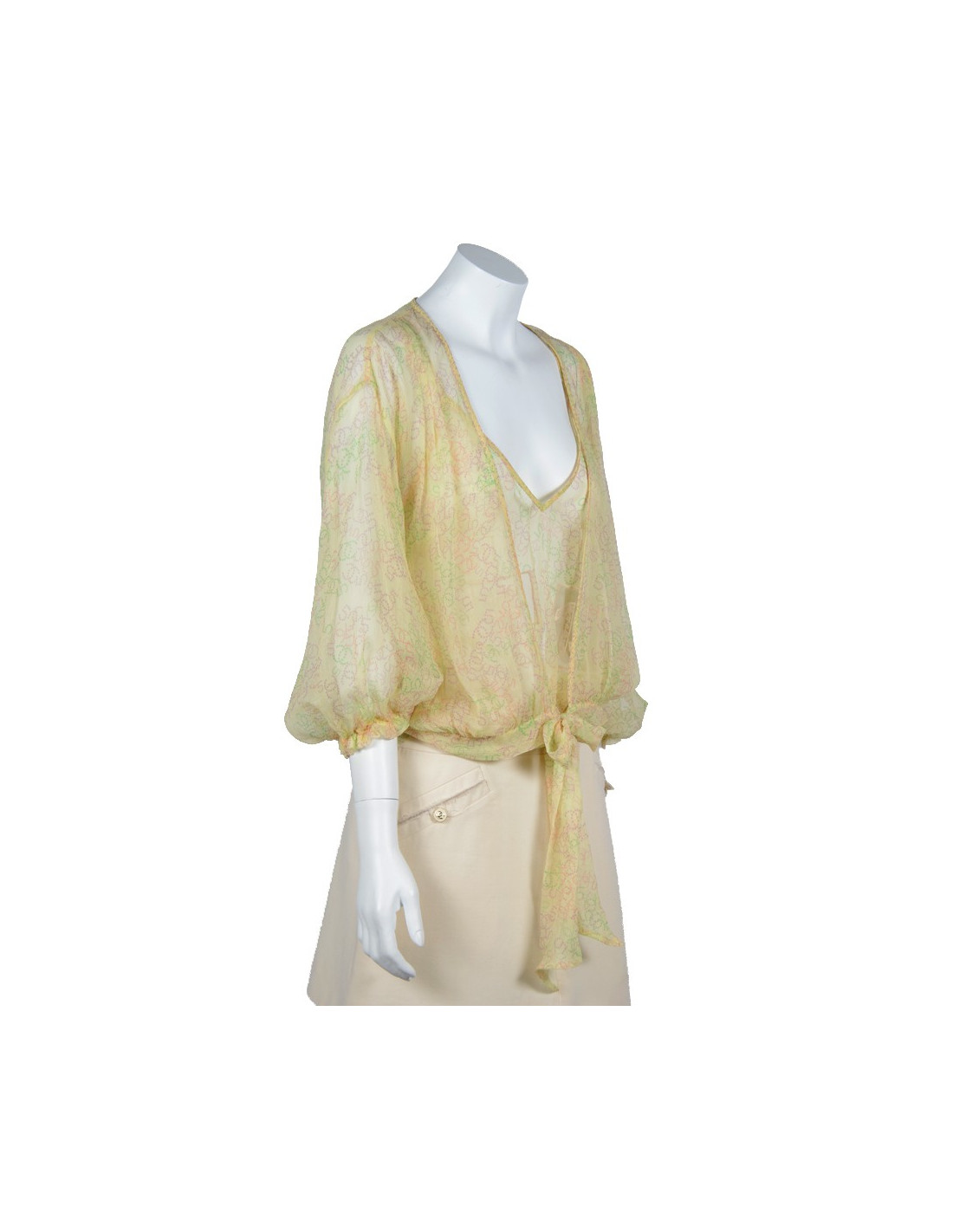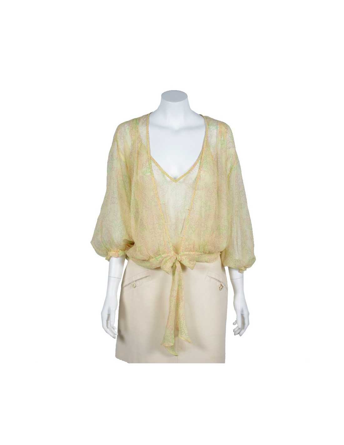 Ravissant twin set Chanel taille 42 issu du prêt-à-porter printemps 2006, en soie jaune poussin, imprimée de CC violet, vert et rose. Il est composé d'un top à bretelles, surpiqué de dentelle représentant les motifs CC, 19 et 31. Une sorte de cache-coeur manches 3/4, noué à la taille vient compléter le top. Le twin set est en très bon état.