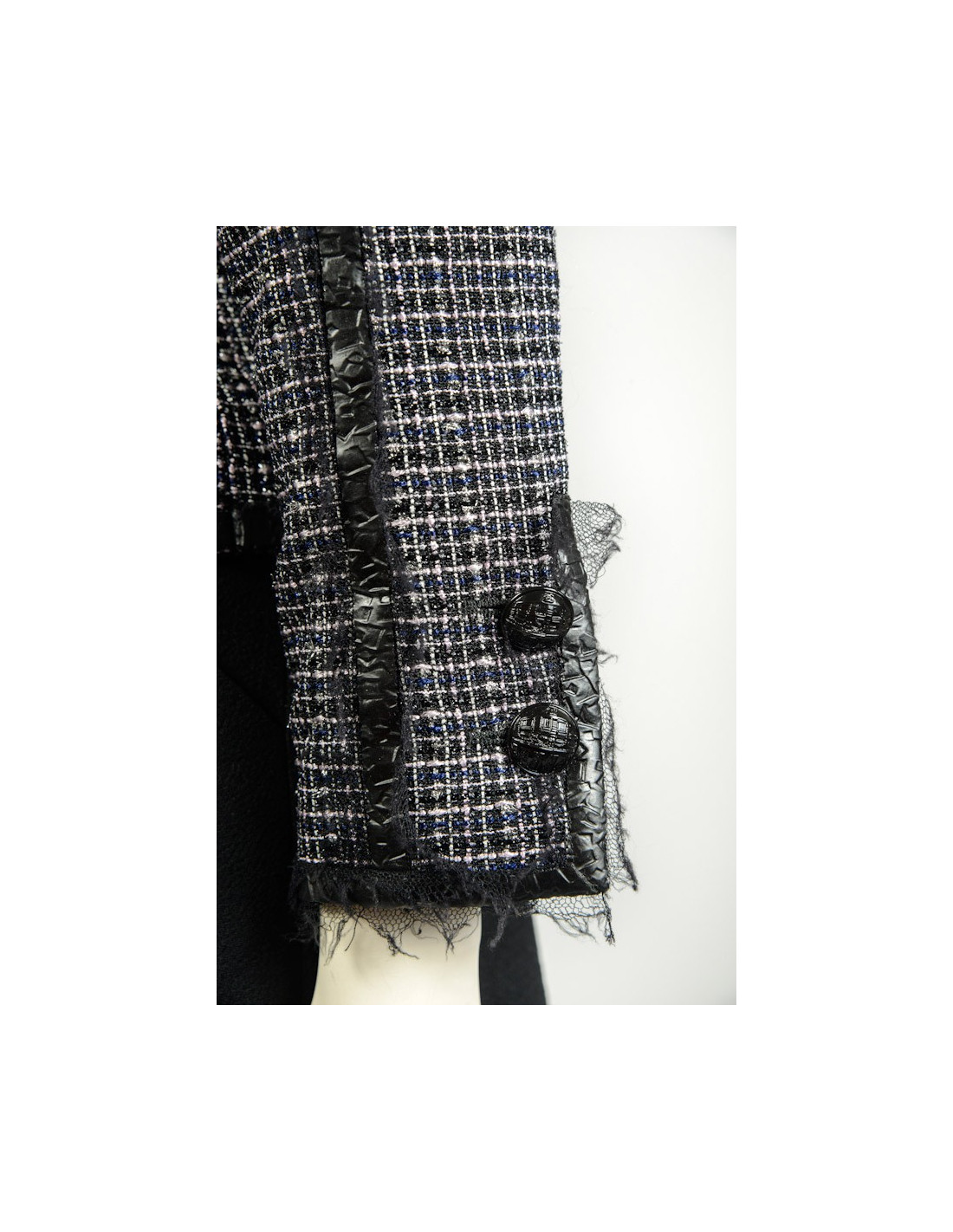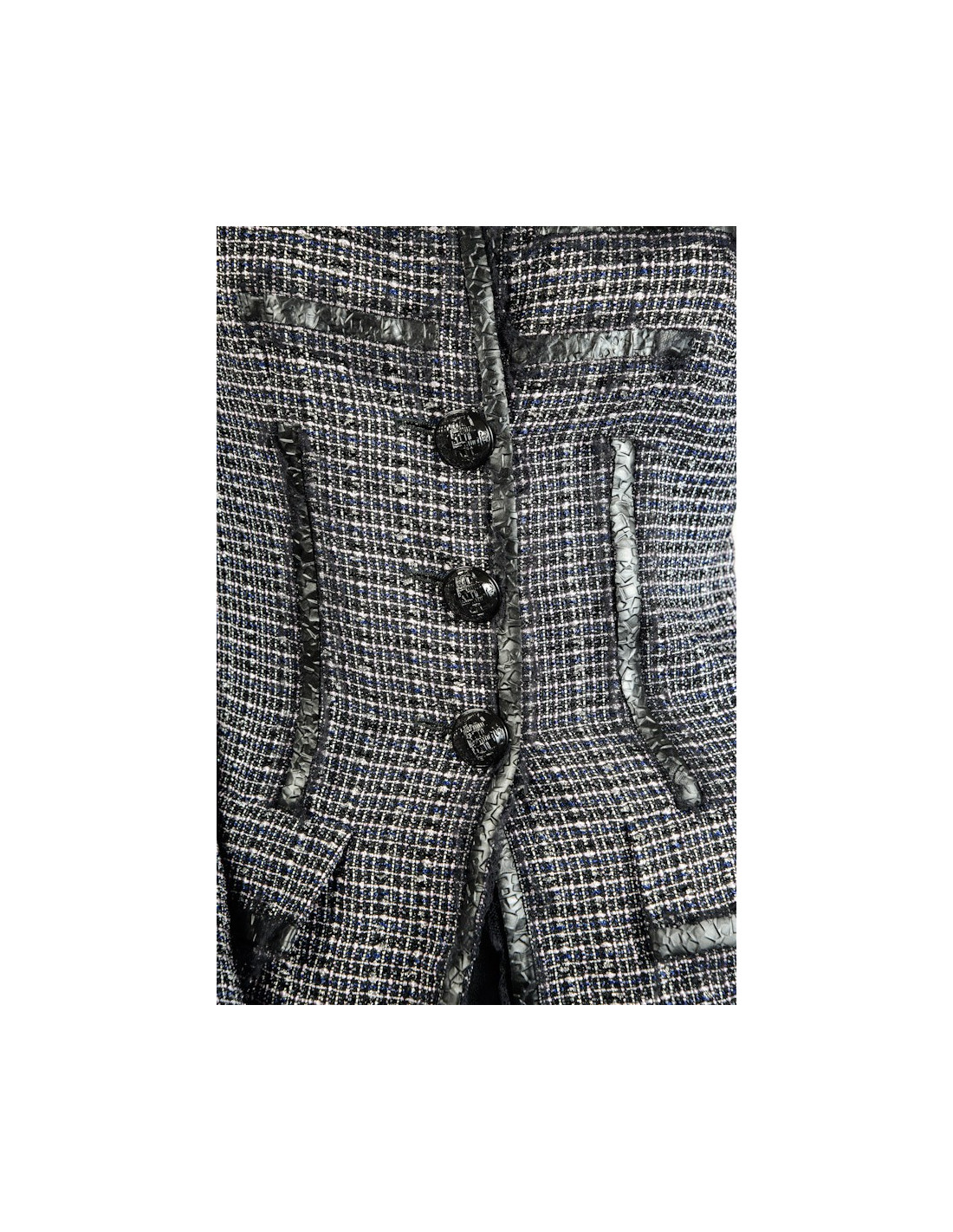 Veste Chanel en nylon noire et blanche. Bandes martelées noires effet cuir. Taille 36. Collection Printemps 2009. Fermeture 3 boutons. Parfait état, porté une fois.