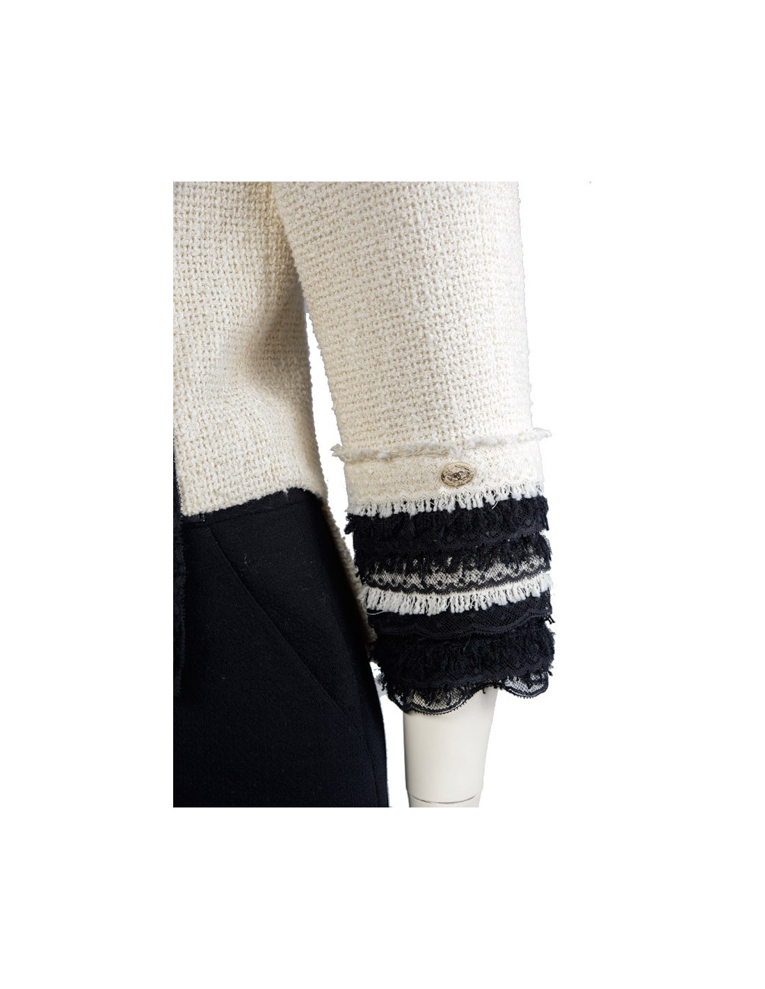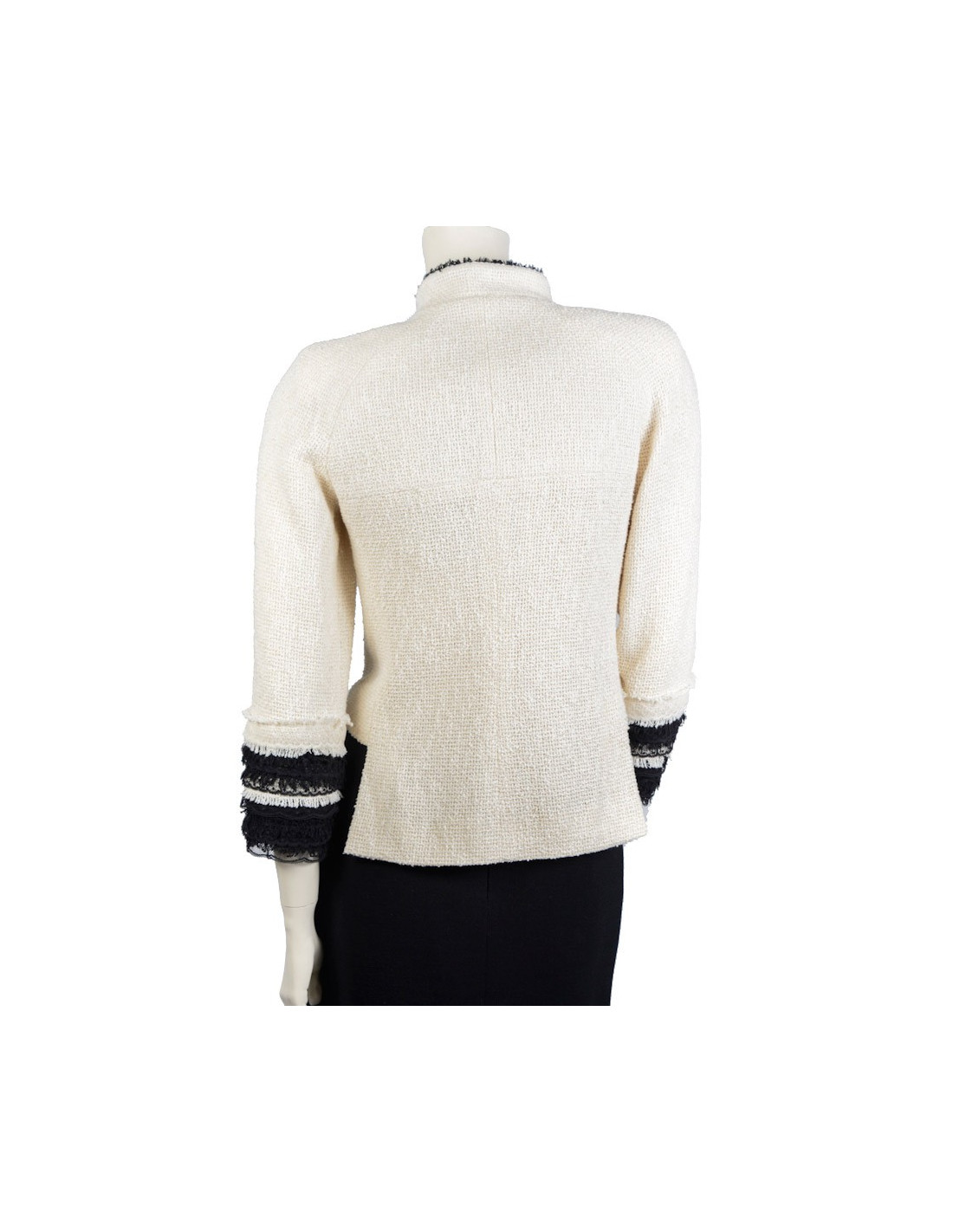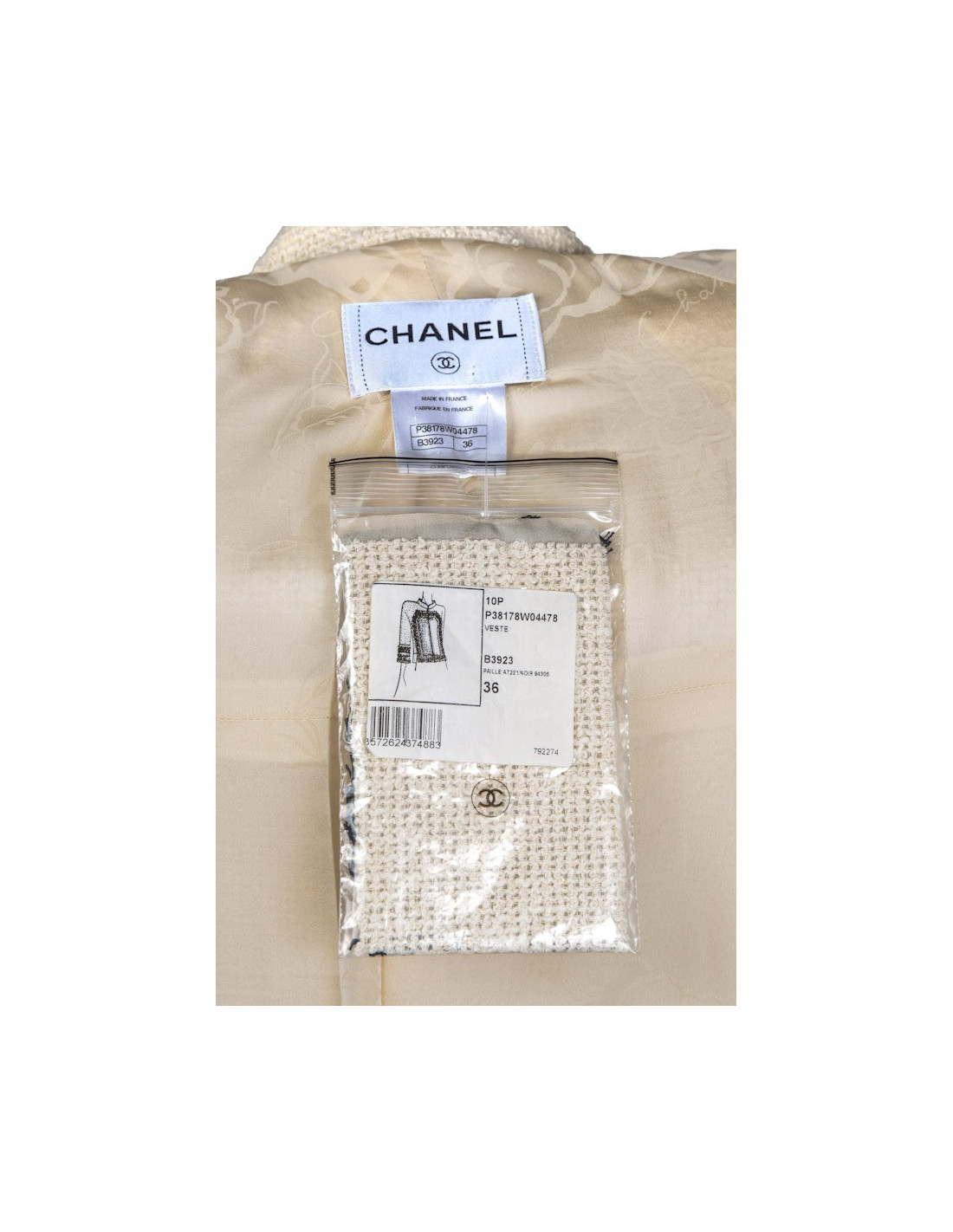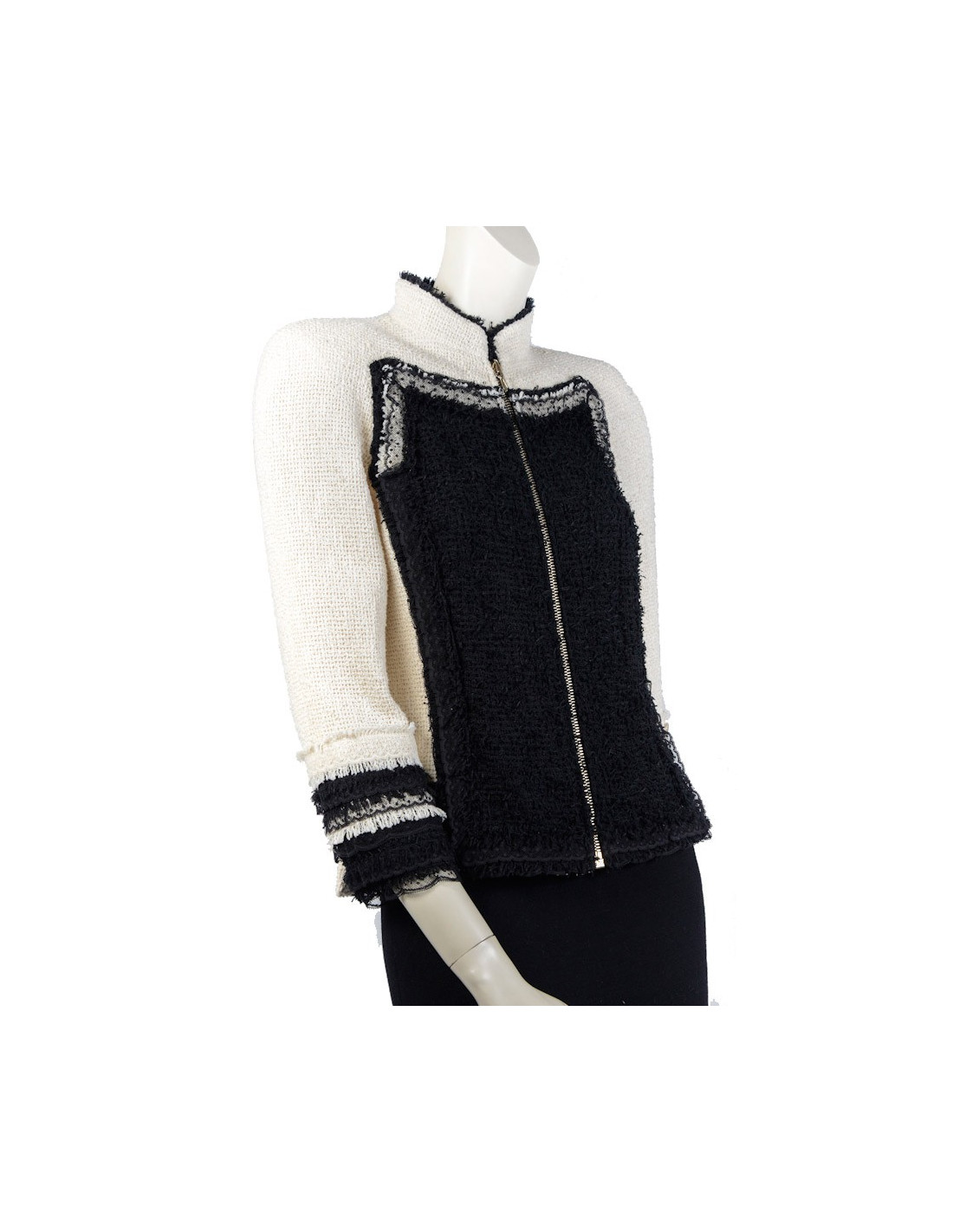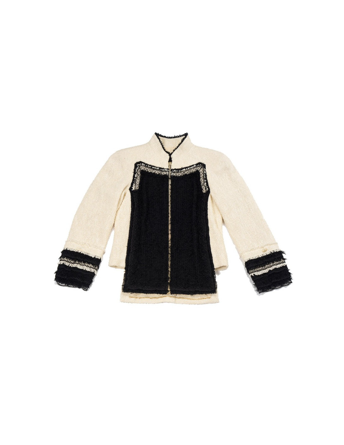 Veste Chanel en coton beige et plastron noir en coton et dentelle noire. Taille 36. Fermeture zippée dorée. Dégradé de dentelles sur les manches. Doublure en soie. Un bouton doré sur la manche gauche siglé "CC". Collection récente. En très bon état.