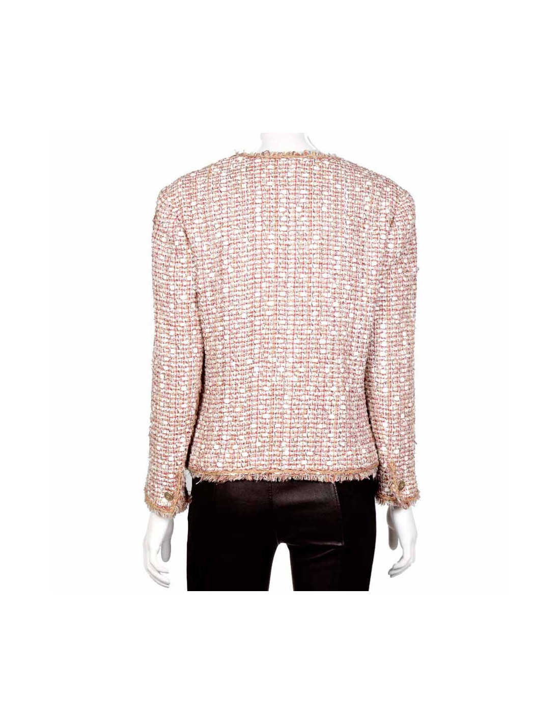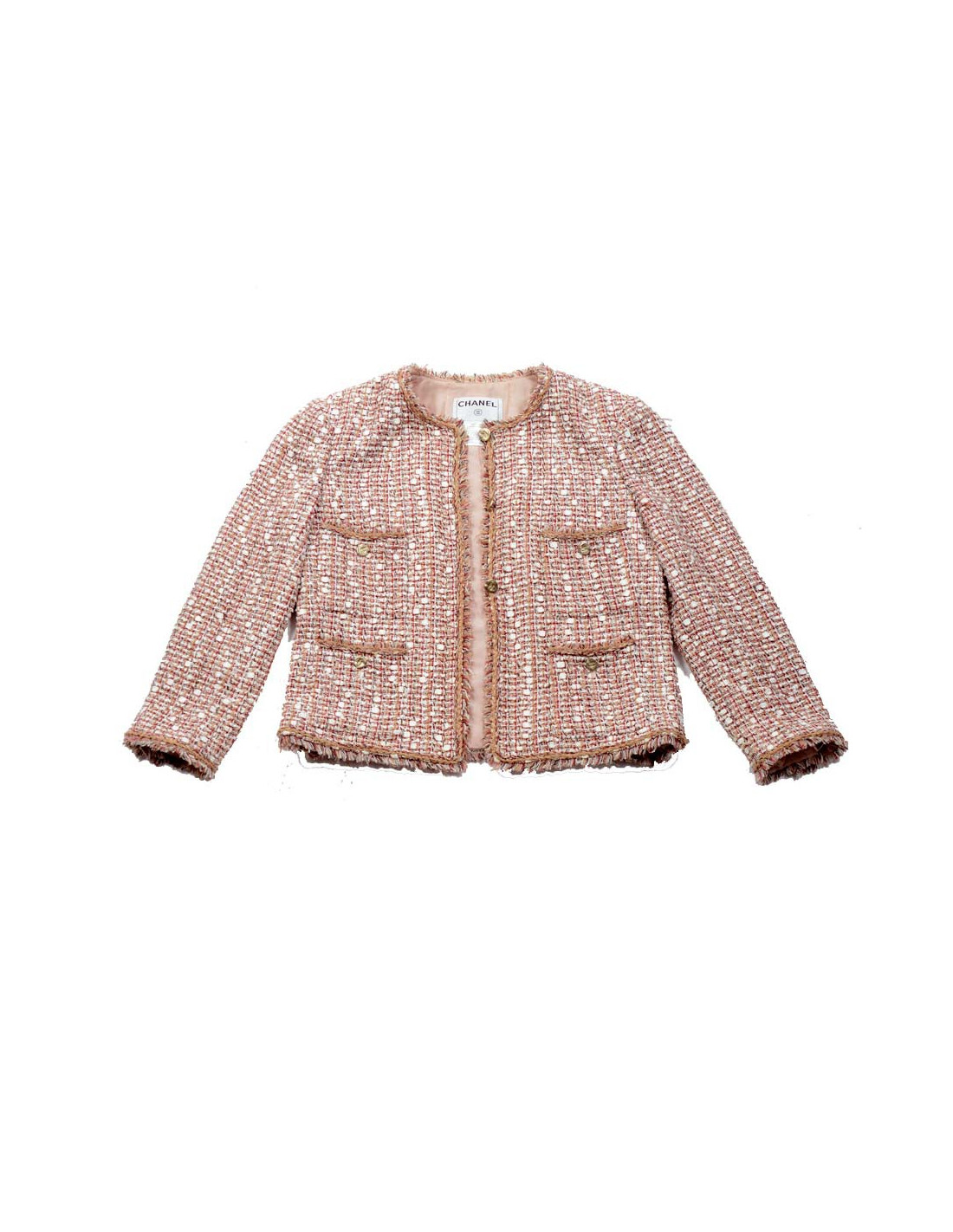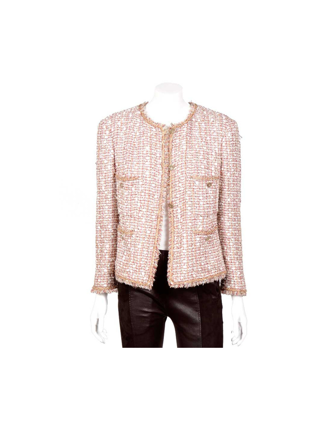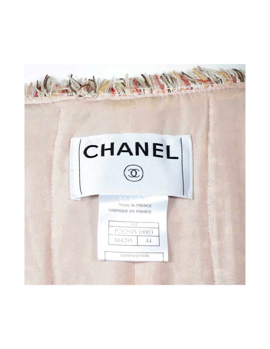 Grand classique Chanel, cette veste en tweed est un basique dans une garde robe. Taille 44. Elle se porte ouverte mais dispose de 3 boutons décoratifs dorés siglé "CC". Collection Printemps 2006. 4 poches plaquées à l'avant de la veste. Doublure en soie. En très bon état.
