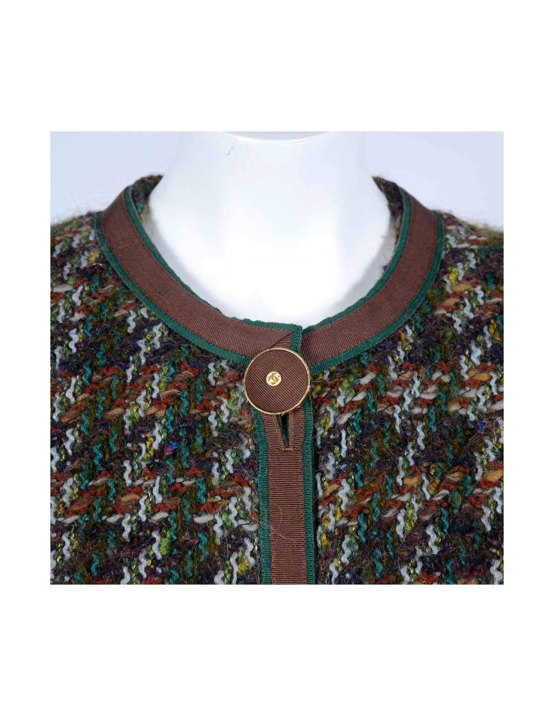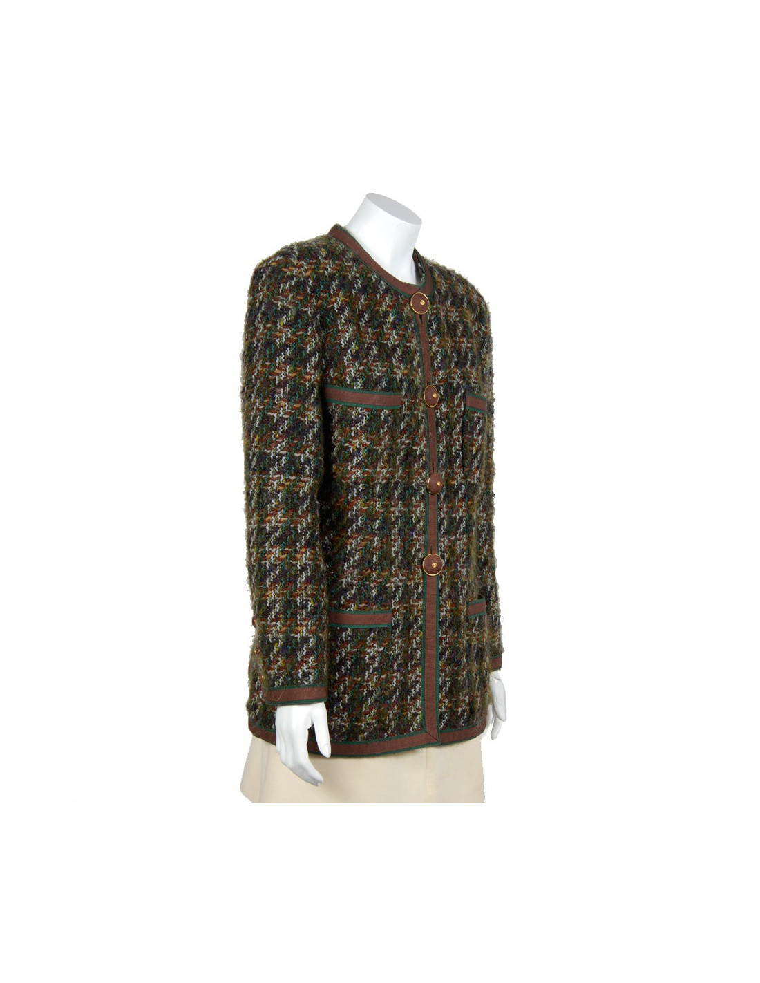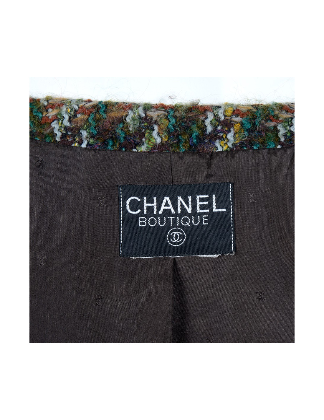 Veste Vintage Chanel boutique en tweed multicolore (vert, marron, jaune, violet). Pas d'étiquette de taille, taille 44 selon les mesures. Les bords de la veste sont en tissu marron et vert, la veste est munie de quatre grandes poches. Elle se ferme par quatre gros boutons Chanel marron entouré de métal or. Trois boutons identiques au bout des manches. La veste est vintage, Elle est en très bon état.