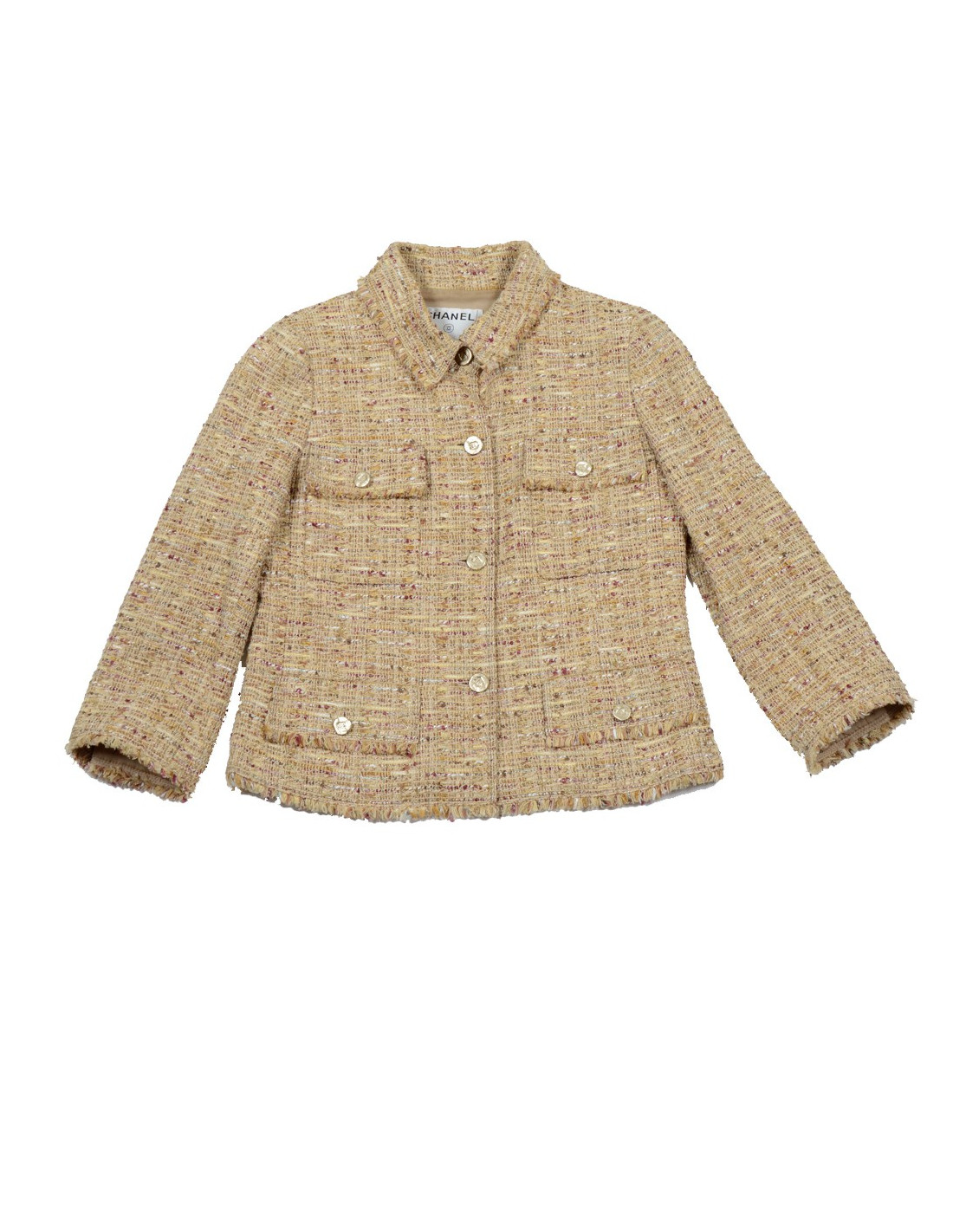 Veste Chanel en tweed de couleur ocre doré. Taille 40. Fermeture 4 boutons dorés siglés "CC". Elle dispose de 4 poches plaquées à rabat à l'avant. 3 boutons à chaque manche. La doublure est en soie avec la chaîne Chanel en bas de la veste à l'intérieur. En très bon état.