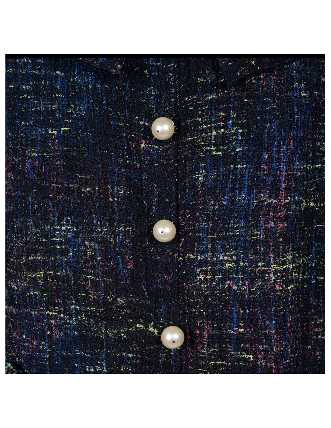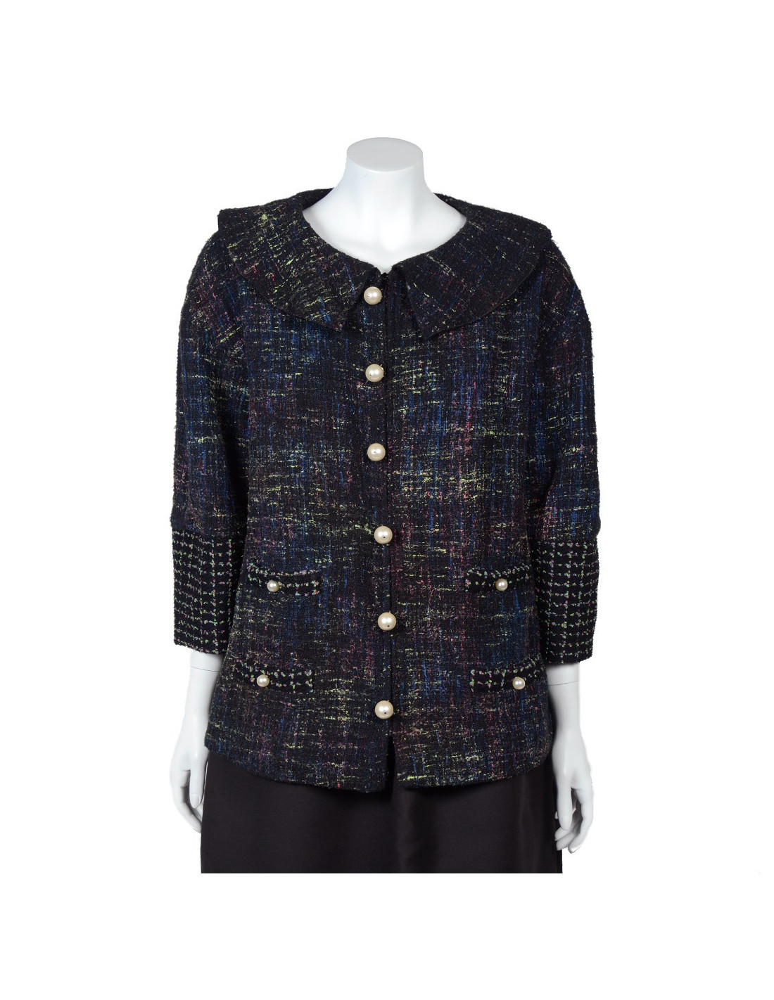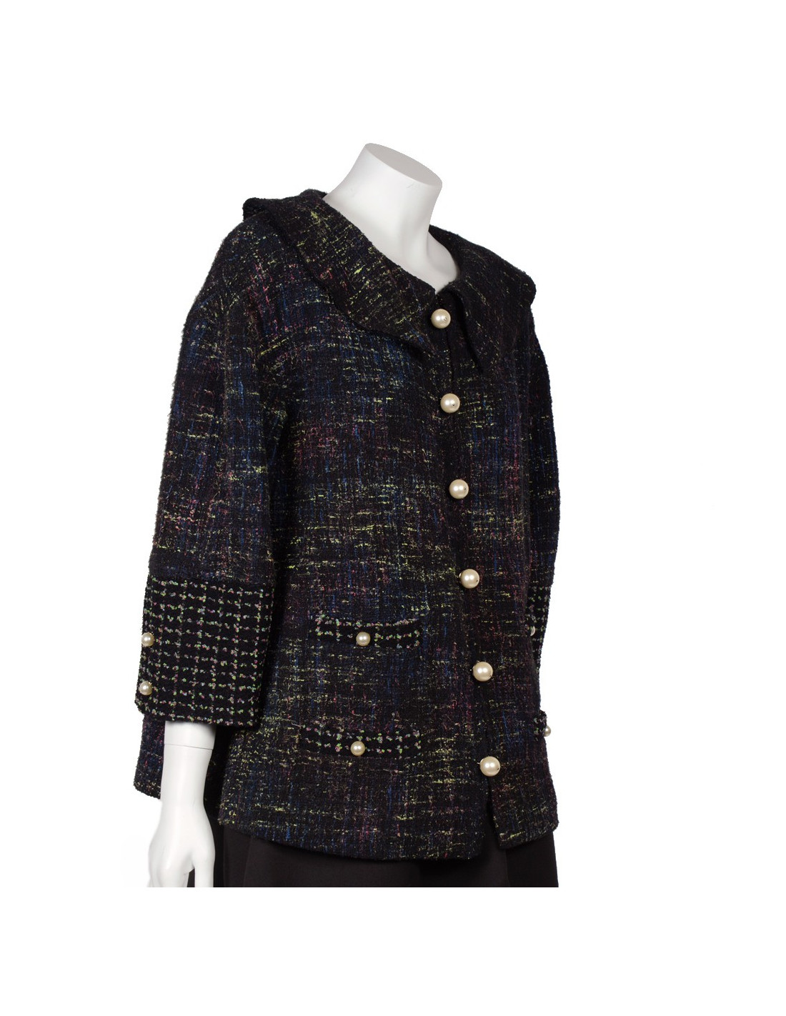 Superbe veste Chanel coupe trapèze en tweed et perles nacrées, collection été 2012, le tweed de la veste est de couleur vert, bleu et fushia sur fond noir. Il y a deux fausses poches de chaque coté de la veste, la fermeture principale est zippée, la veste comporte six faux boutons d'attaches en perles nacrées, les manches sont évasées au bas et comporte deux boutons en perles nacrées. Pas d'étiquette de taille/composition